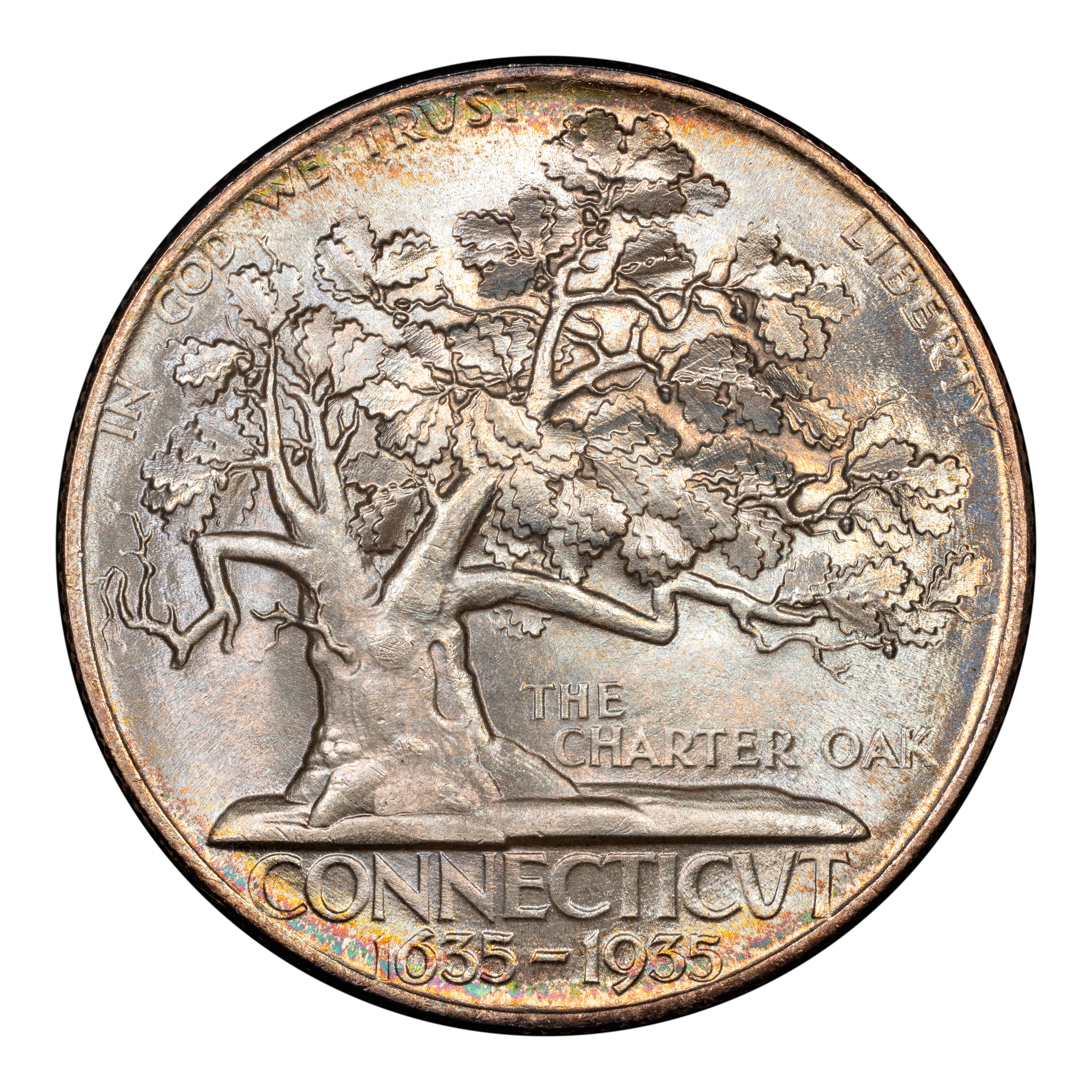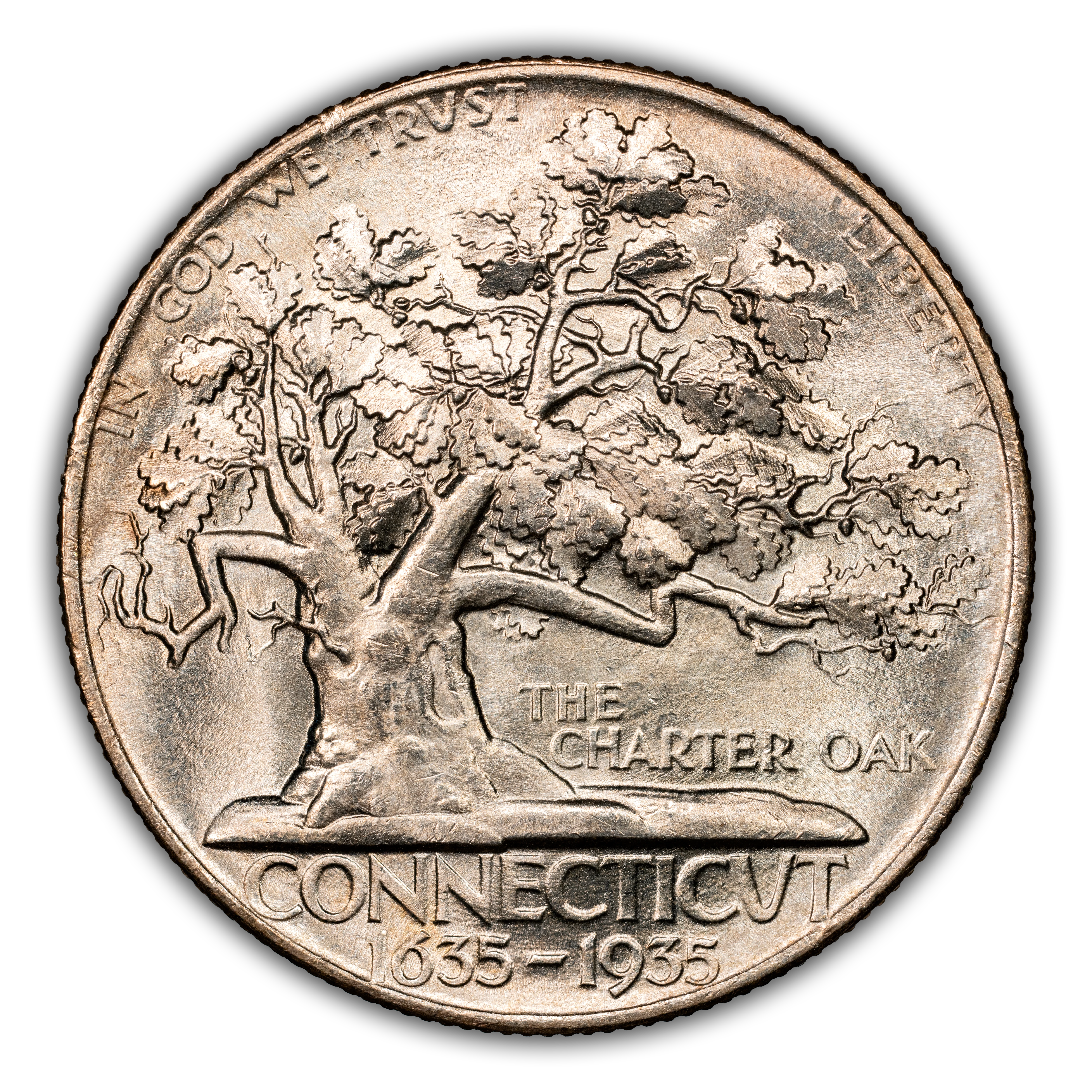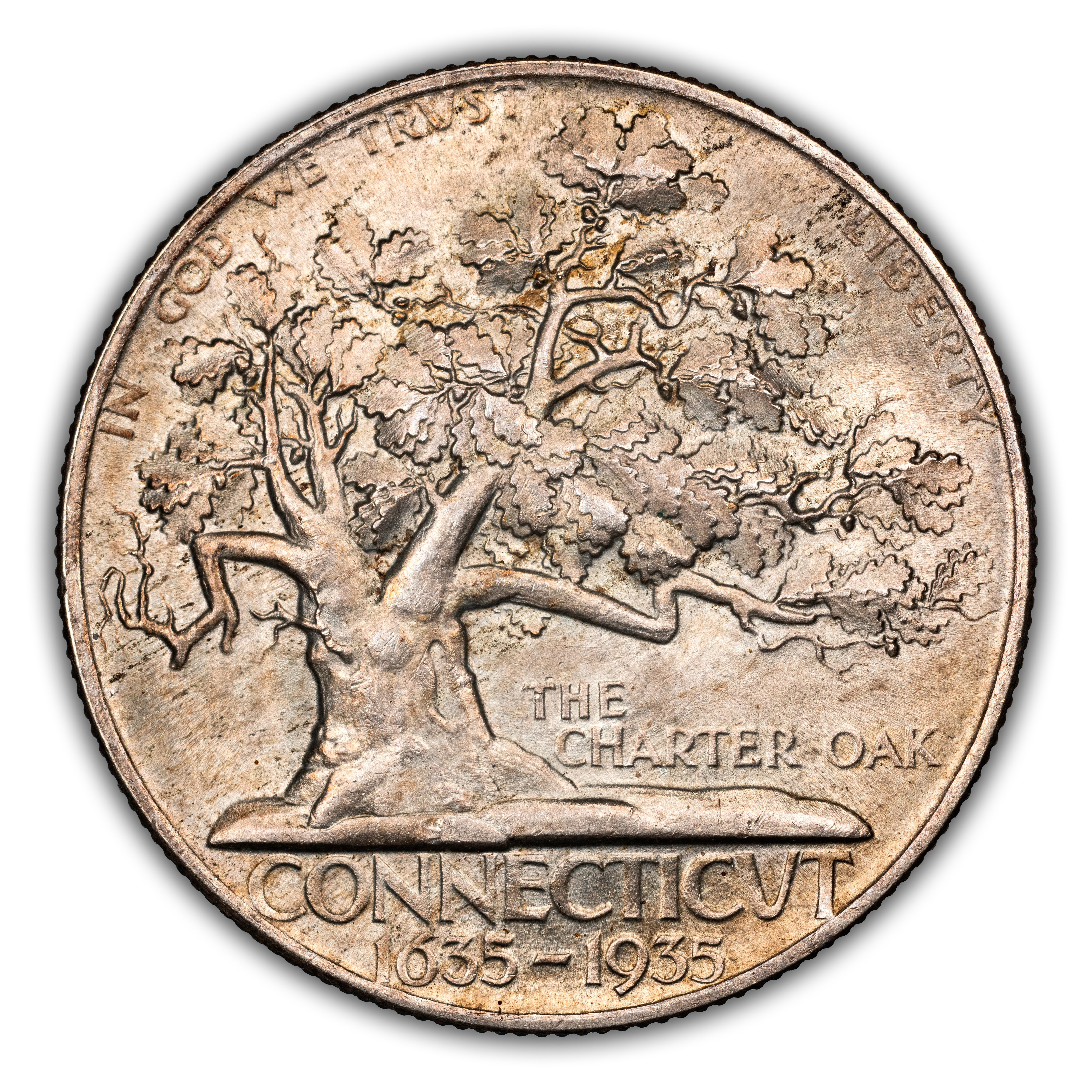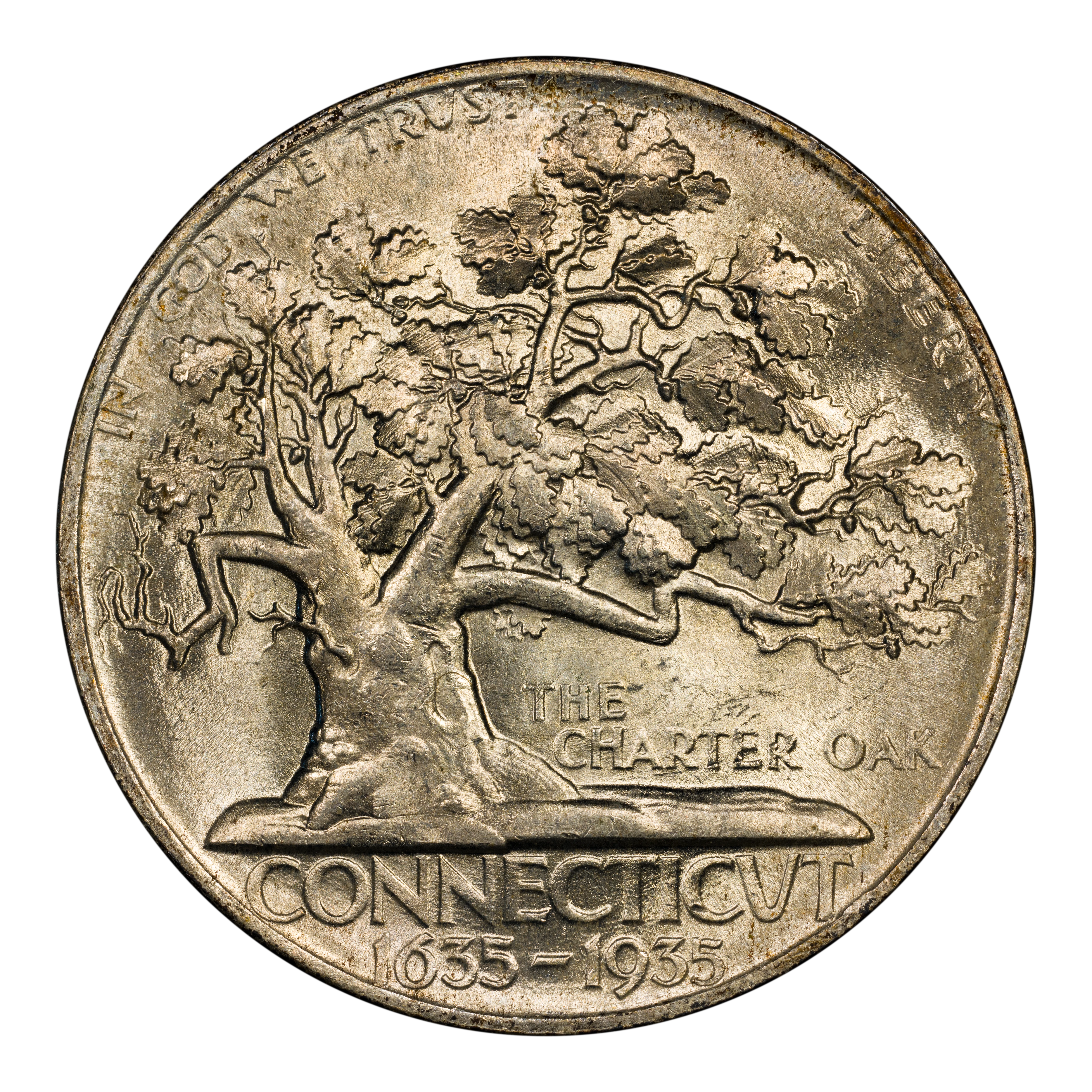 The 1935 Connecticut Tercentenary half dollar was struck to commemorate the 300th anniversary of the founding of colony of Connecticut in 1635. The one-year type coin, designed by Henry Kreis, depicts on its obverse the famous Charter Oak, a large white oak tree in the Connecticut city of Hartford; legend says the Connecticut charter was hidden in the grand tree's trunk when King James II sent Royal Governor of the Dominion Sir Edmond Andros to revoke the charter granted by King Charles II.