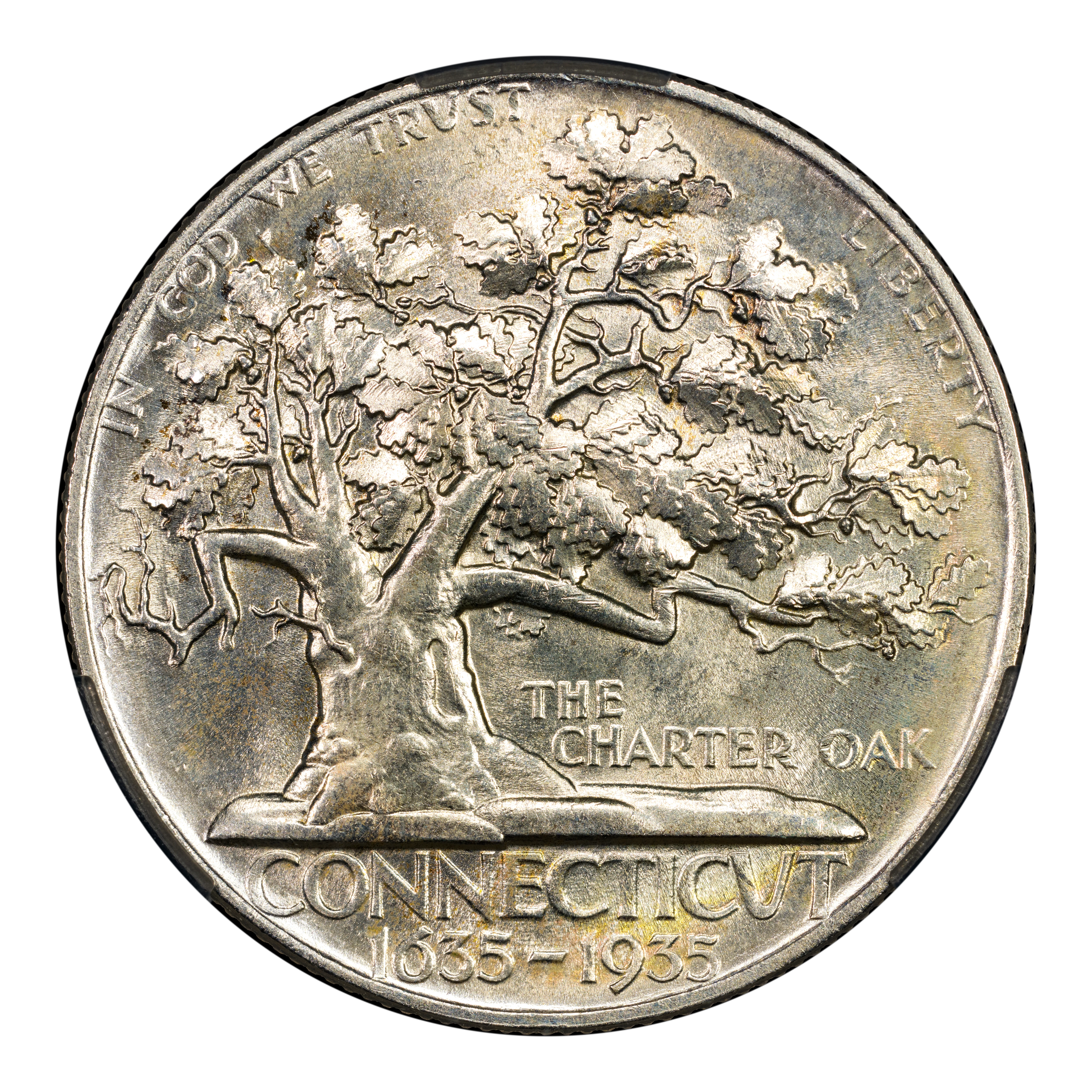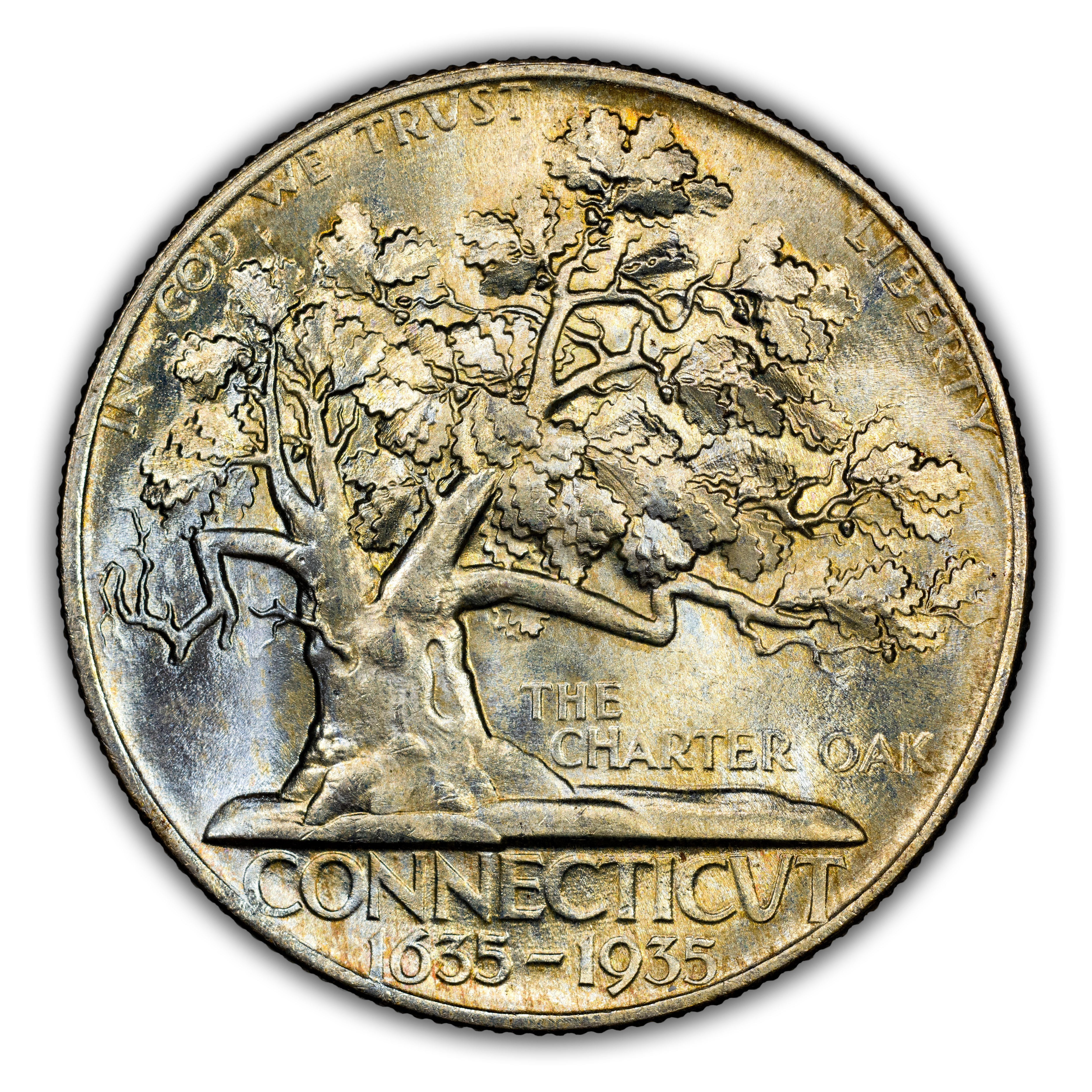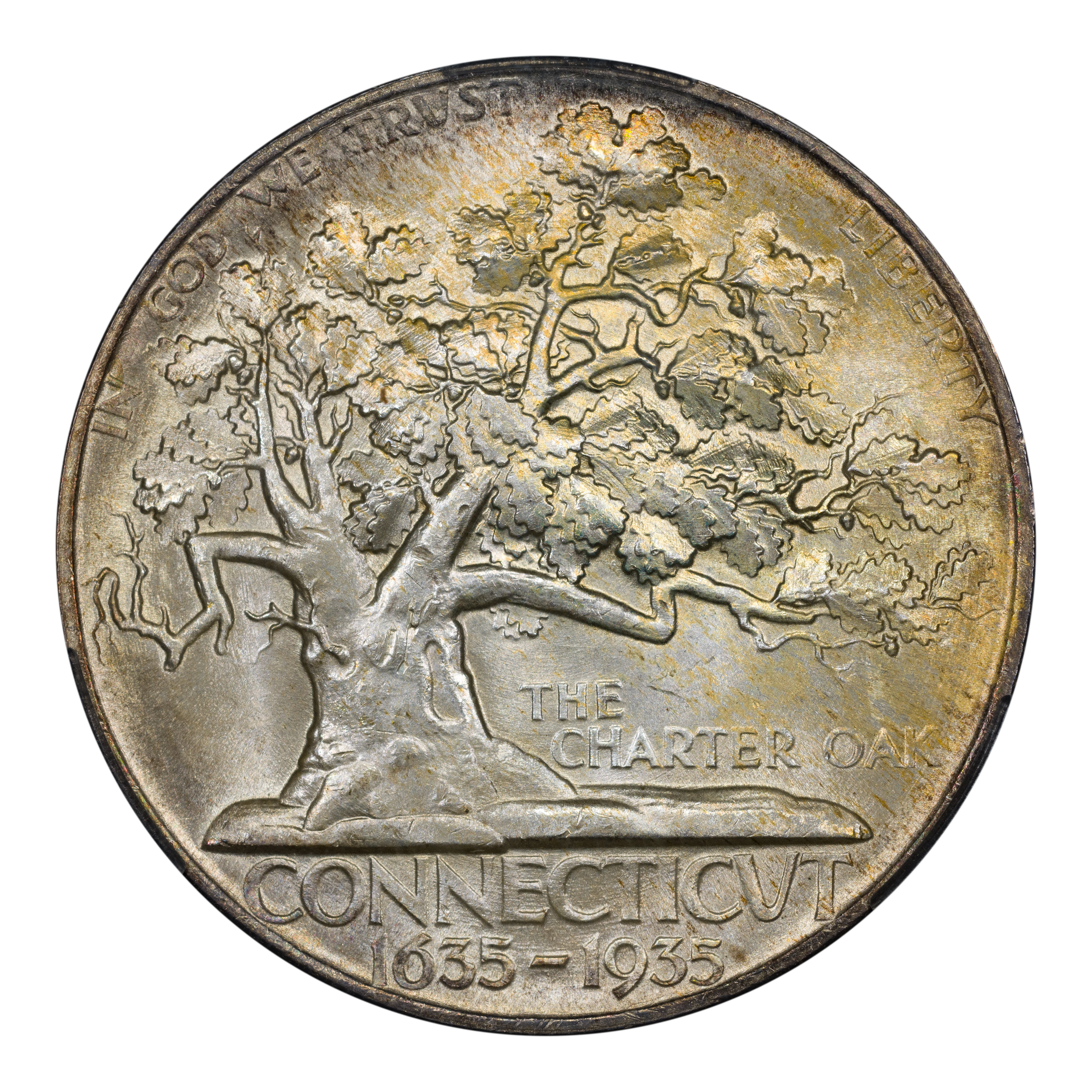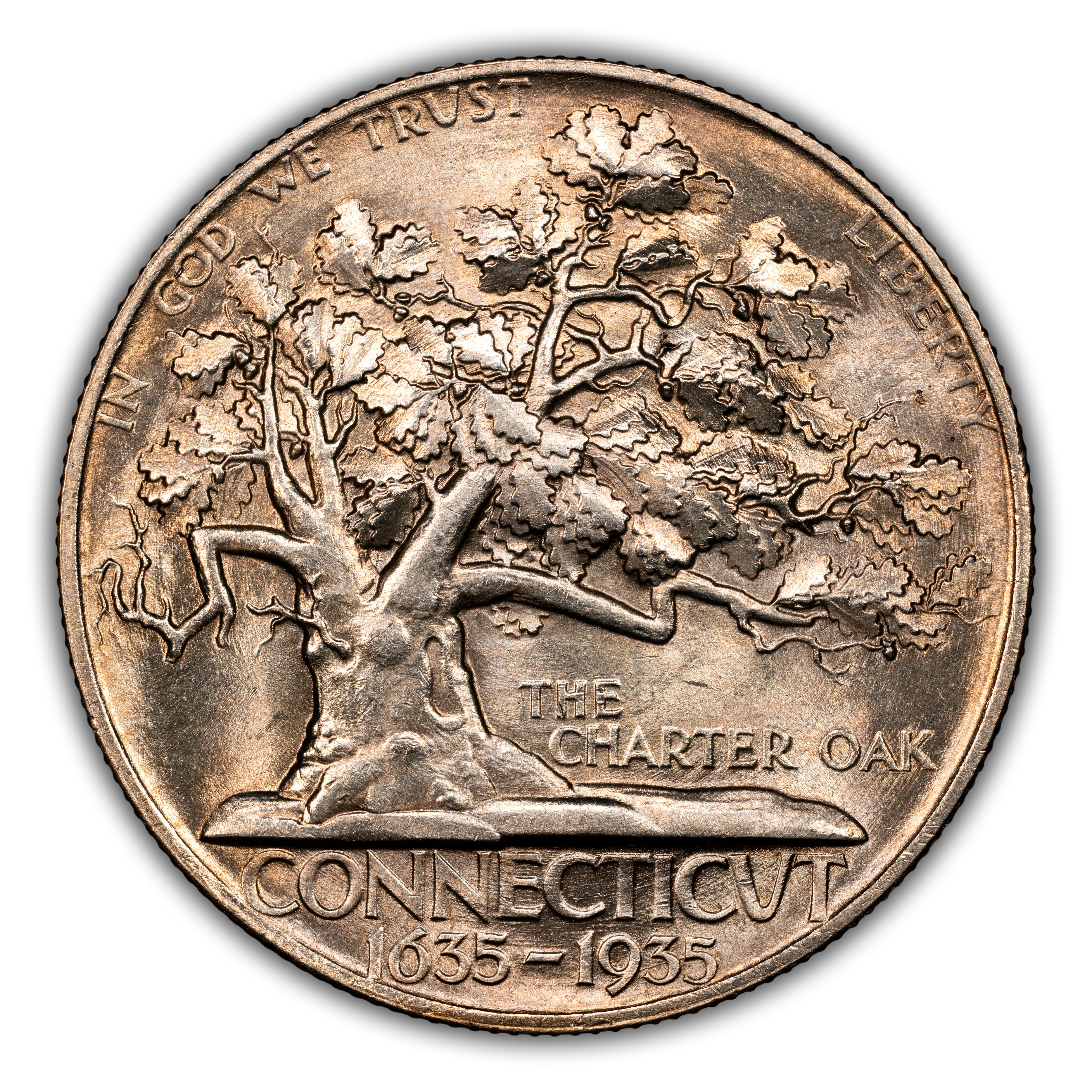 The 1935 Connecticut Tercentenary half dollar was struck to commemorate the 300th anniversary of the founding of colony of Connecticut in 1635. The one-year type coin, designed by Henry Kreis, depicts on its obverse the famous Charter Oak, a large white oak tree in the Connecticut city of Hartford; legend says the Connecticut charter was hidden in the grand tree's trunk when King James II sent Royal Governor of the Dominion Sir Edmond Andros to revoke the charter granted by King Charles II.