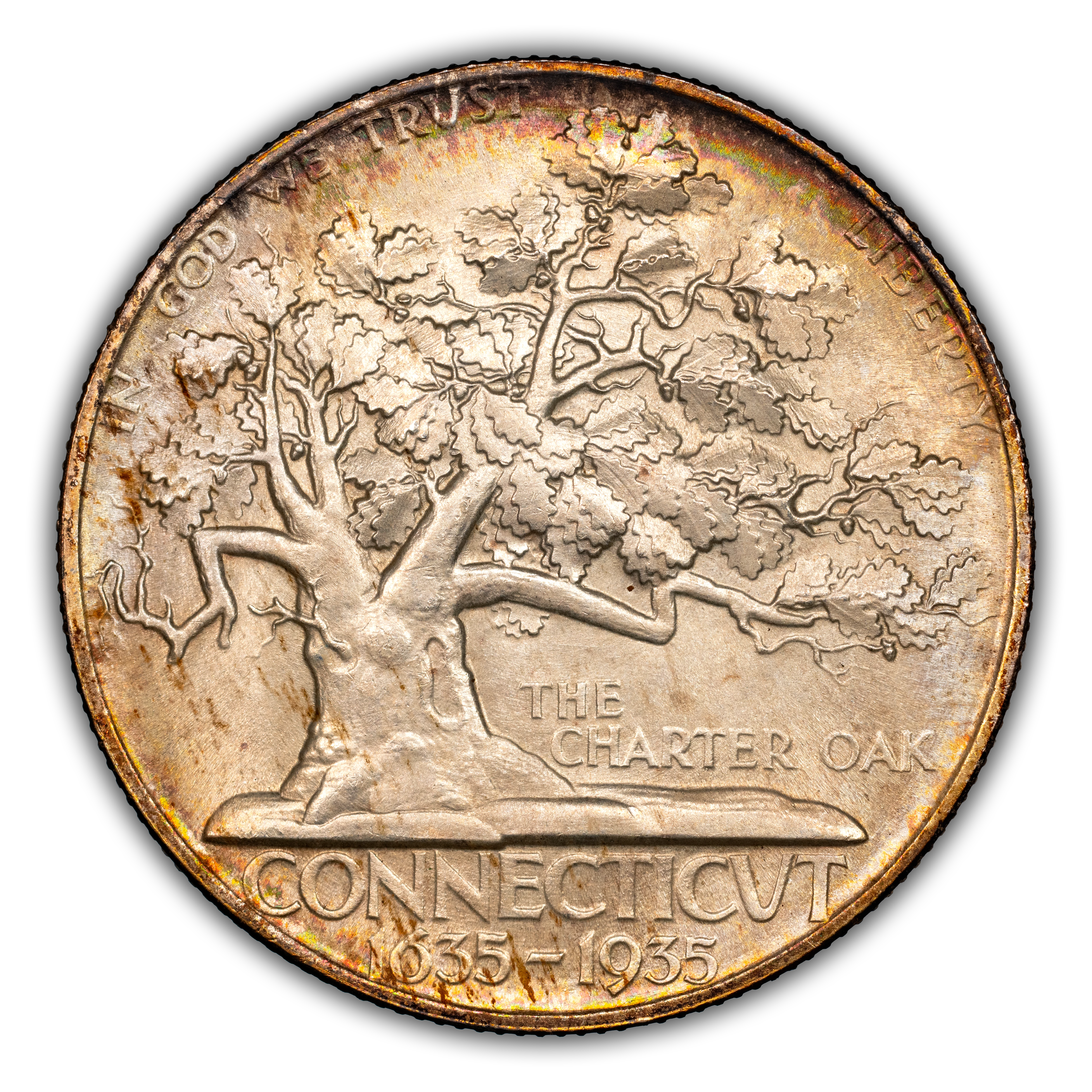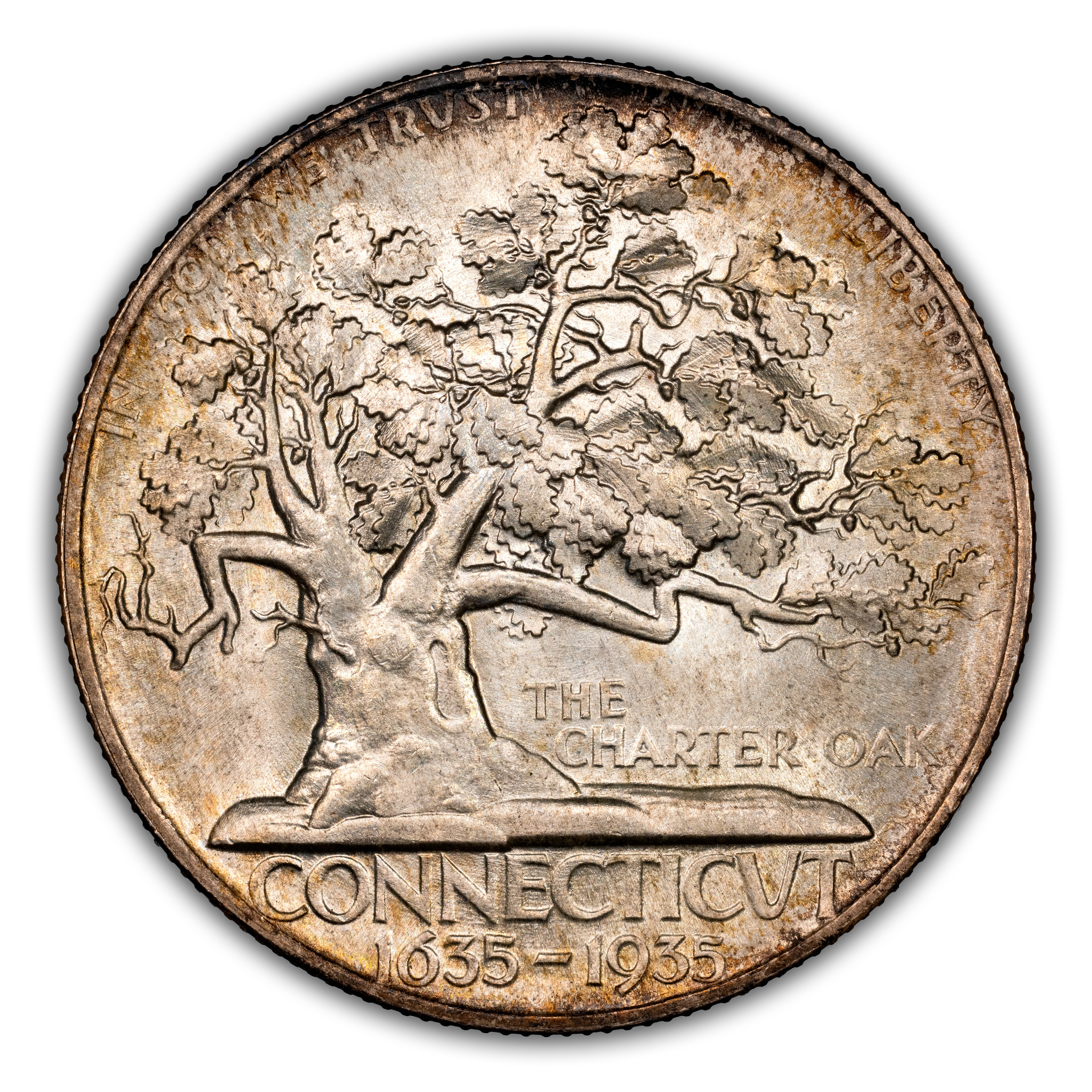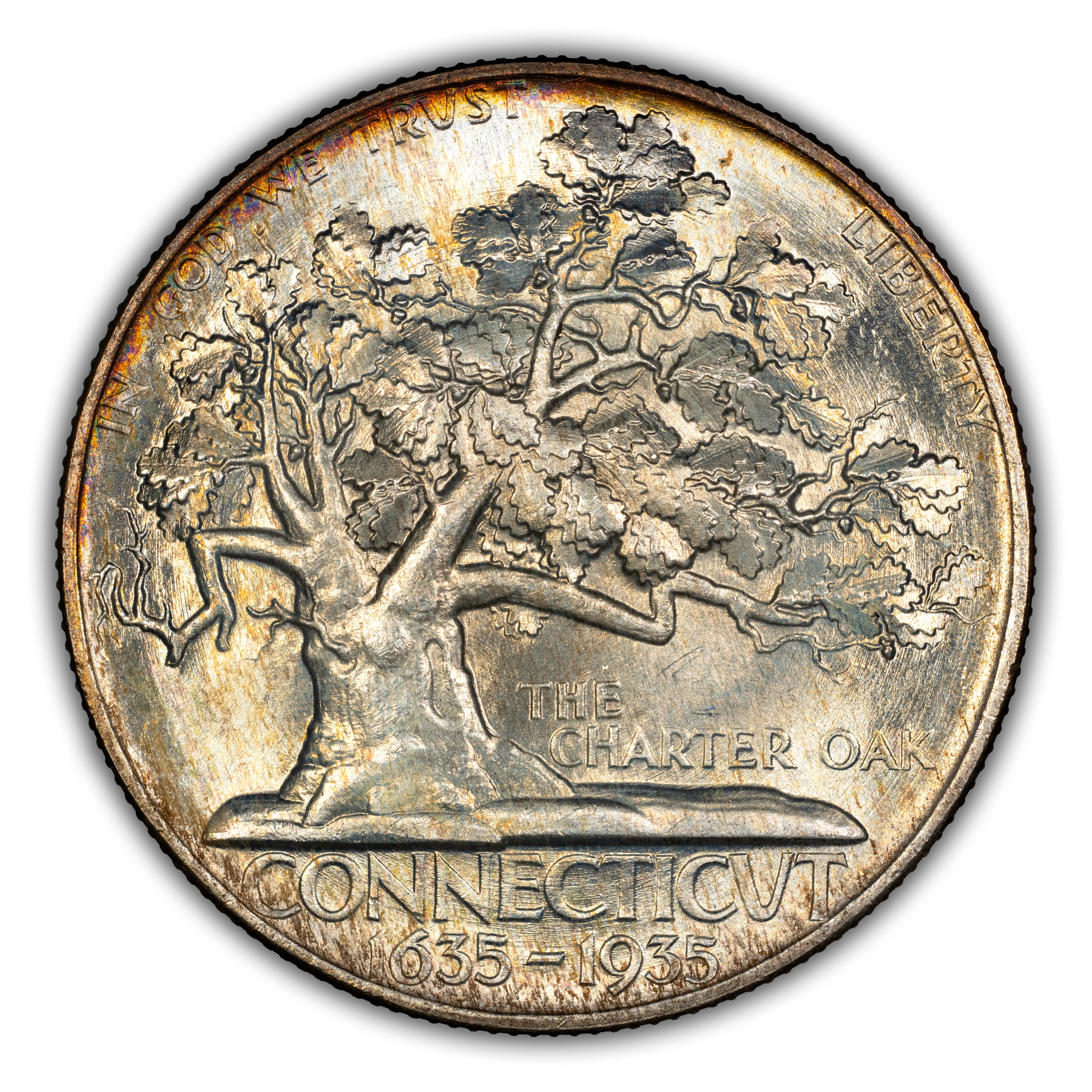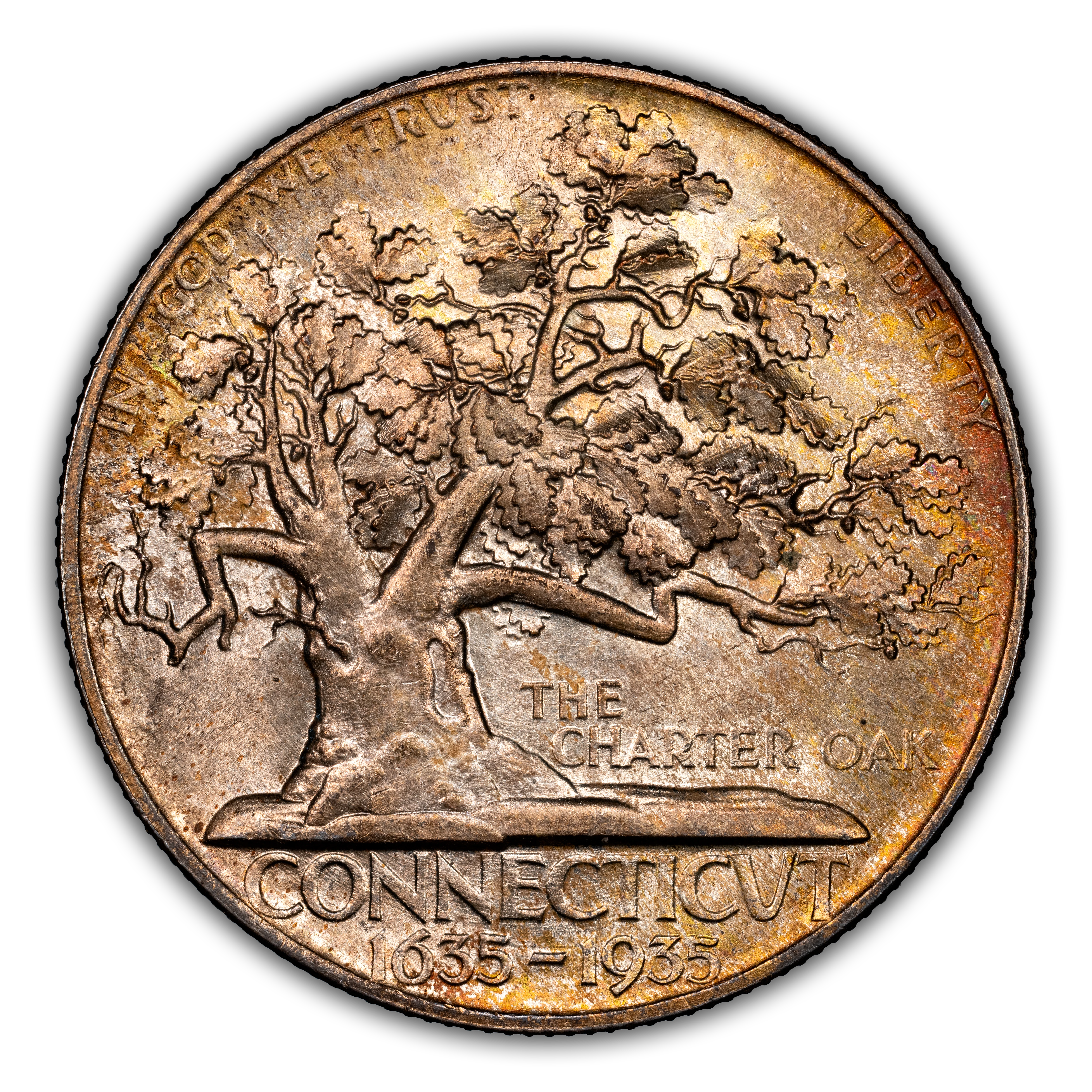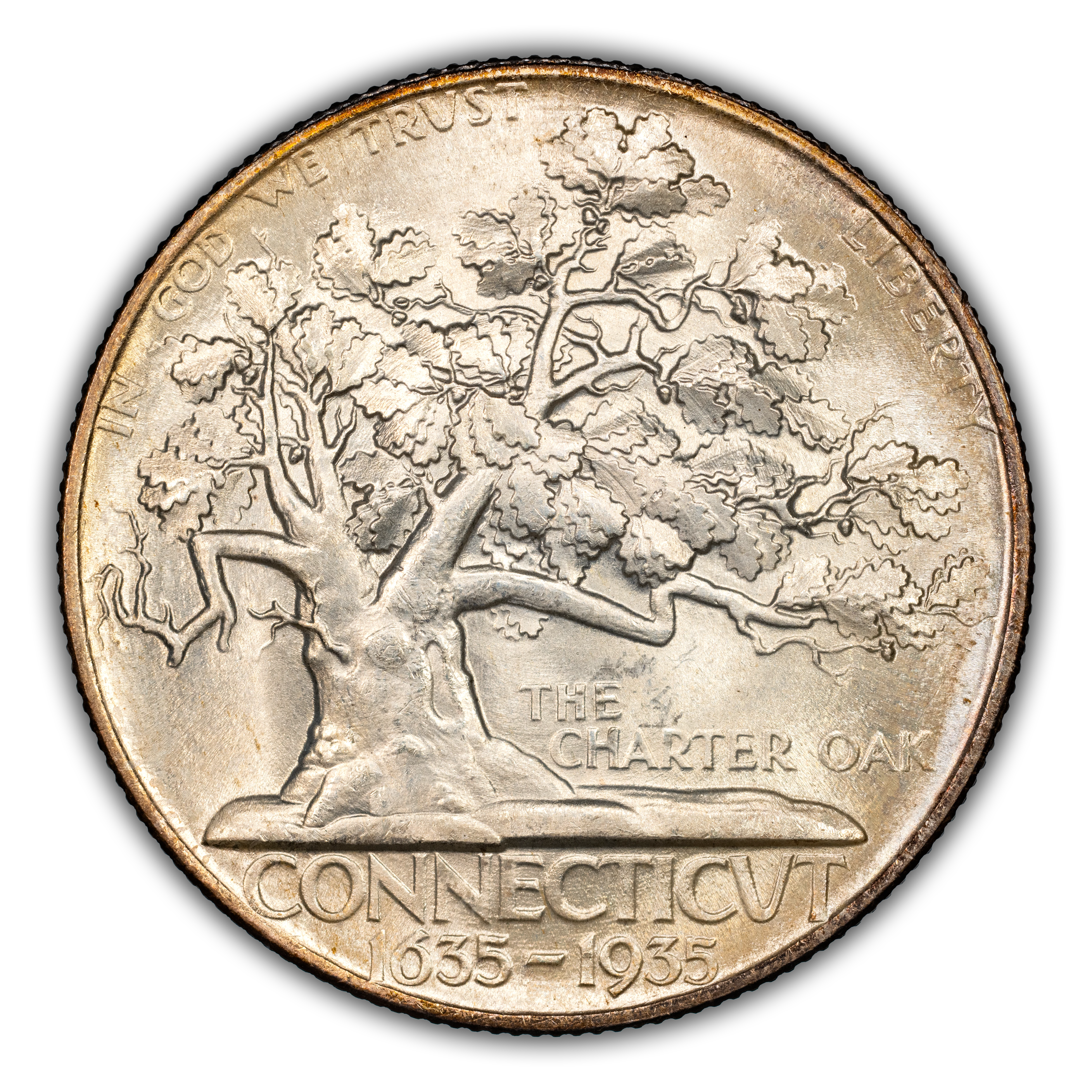 The 1935 Connecticut Tercentenary half dollar was struck to commemorate the 300th anniversary of the founding of colony of Connecticut in 1635. The one-year type coin, designed by Henry Kreis, depicts on its obverse the famous Charter Oak, a large white oak tree in the Connecticut city of Hartford; legend says the Connecticut charter was hidden in the grand tree's trunk when King James II sent Royal Governor of the Dominion Sir Edmond Andros to revoke the charter granted by King Charles II.