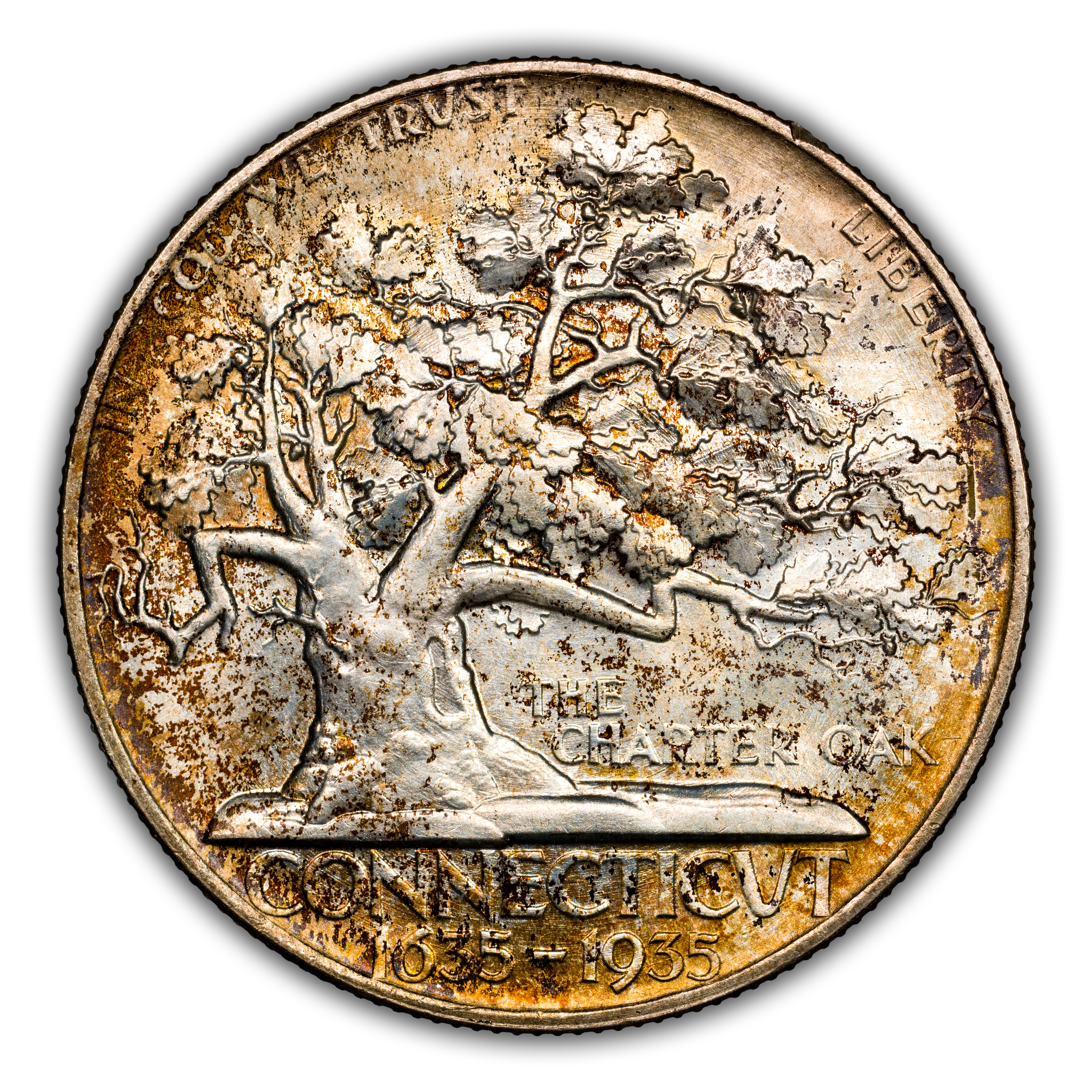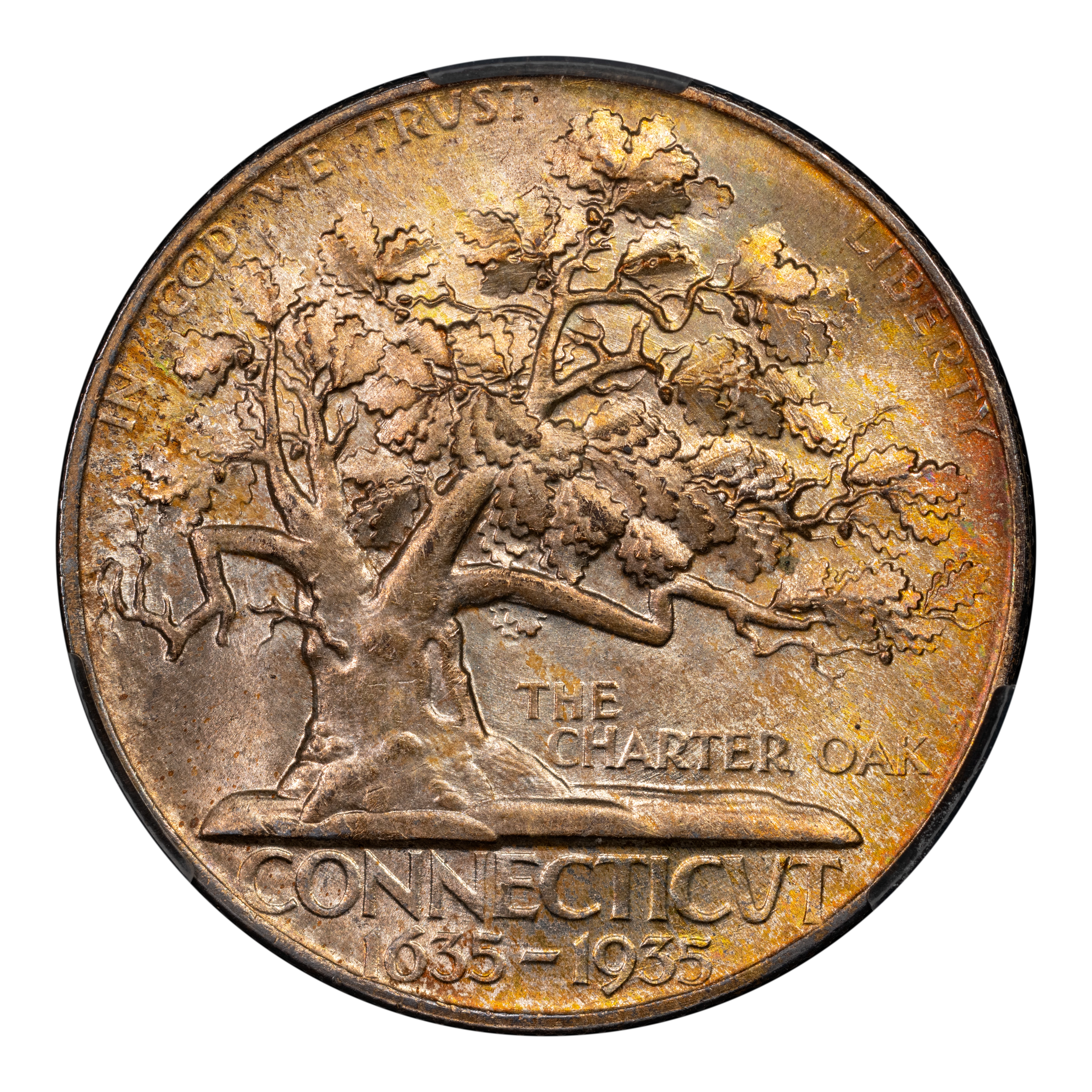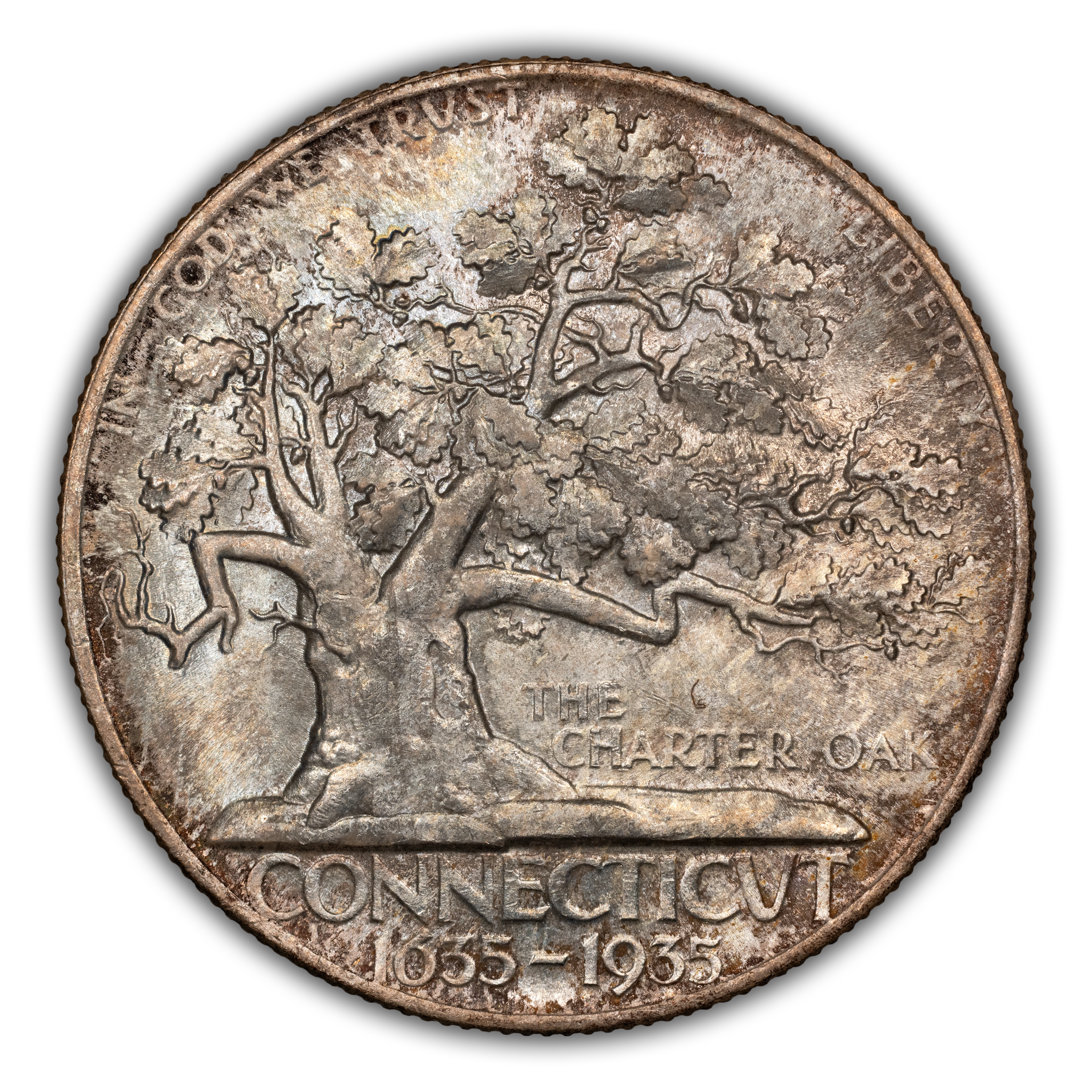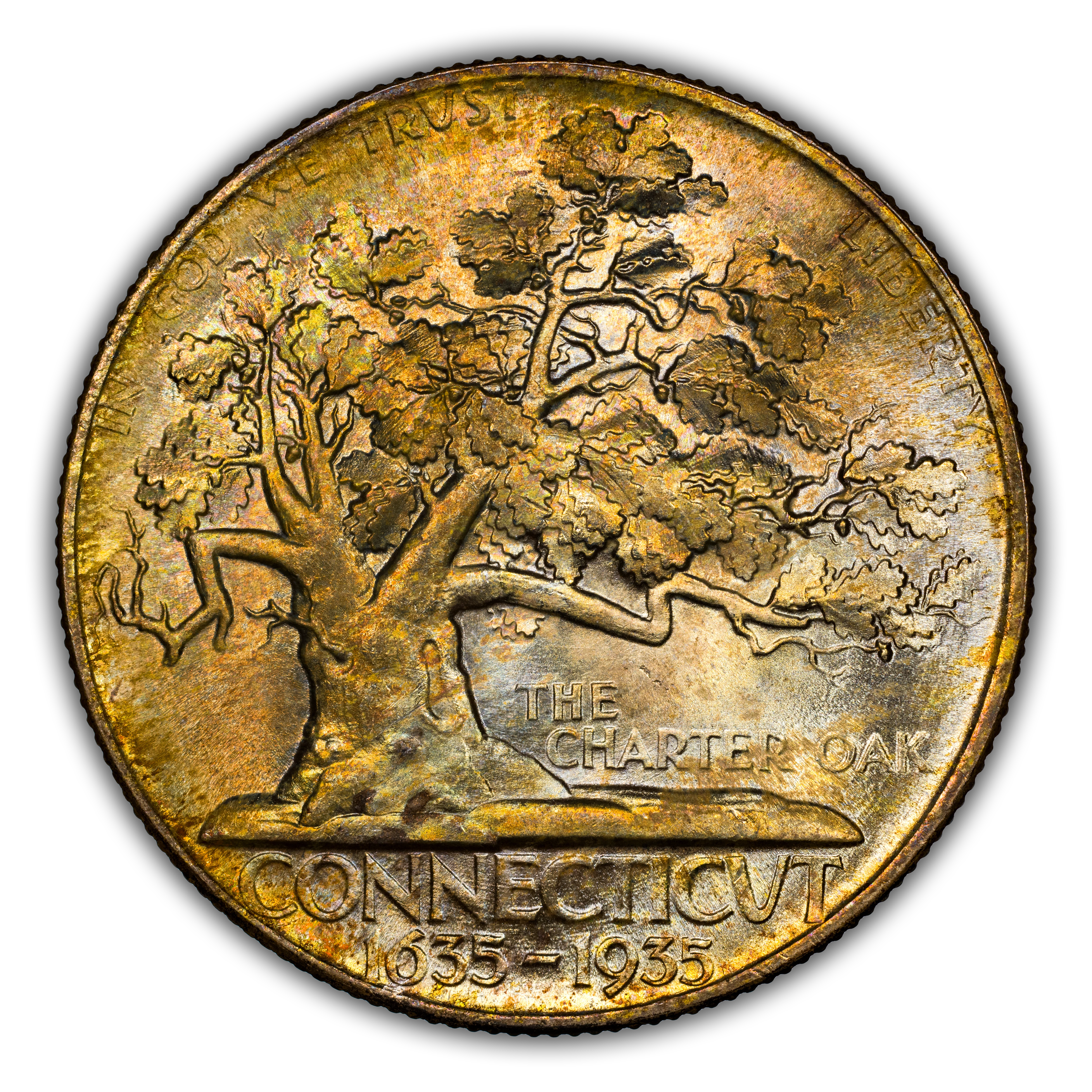 The 1935 Connecticut Tercentenary half dollar was struck to commemorate the 300th anniversary of the founding of colony of Connecticut in 1635. The one-year type coin, designed by Henry Kreis, depicts on its obverse the famous Charter Oak, a large white oak tree in the Connecticut city of Hartford; legend says the Connecticut charter was hidden in the grand tree's trunk when King James II sent Royal Governor of the Dominion Sir Edmond Andros to revoke the charter granted by King Charles II.