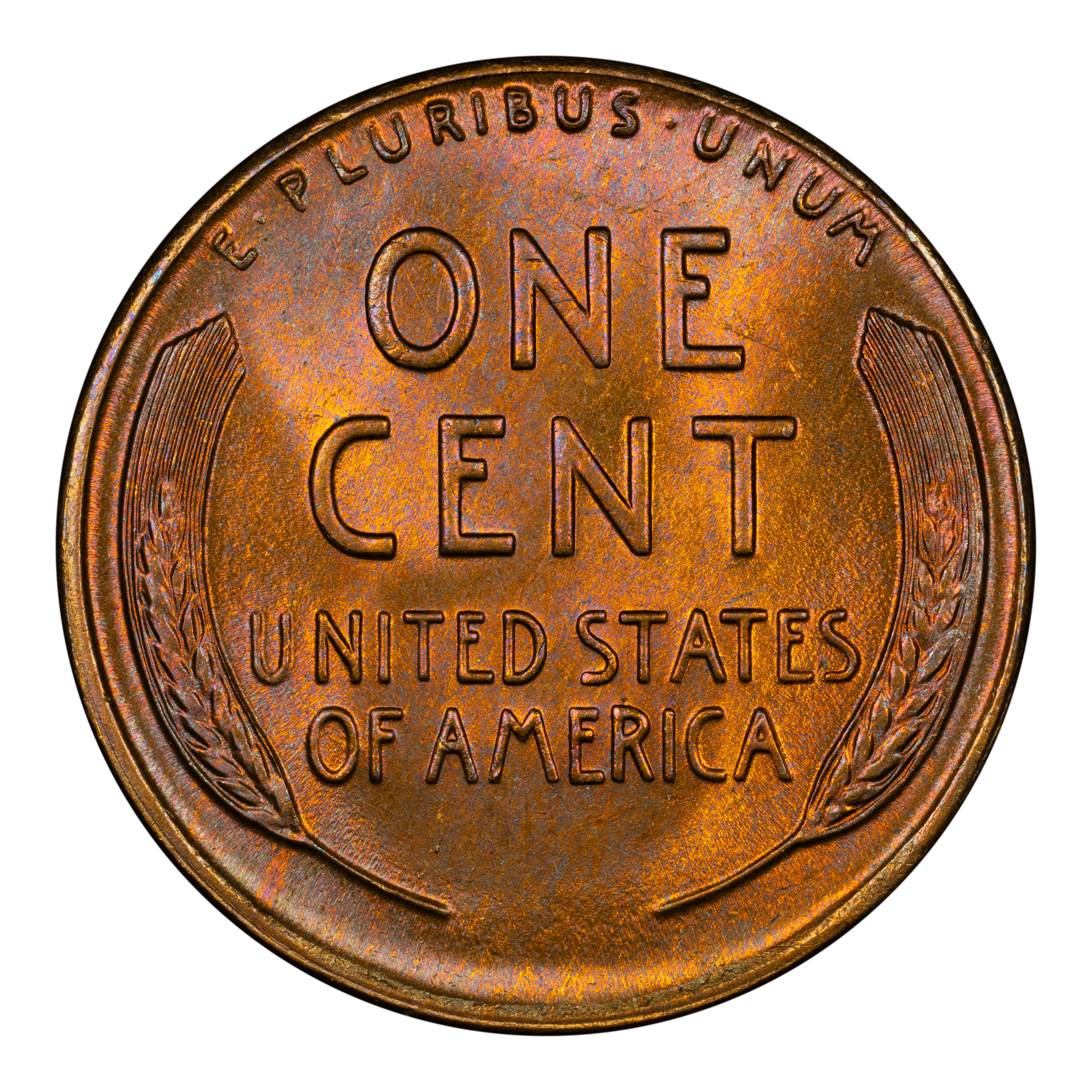 Reverse: Wheat ears flanking the words ONE CENT, UNITED STATES OF AMERICA. The motto E PLURIBUS UNUM on the top perimeter.