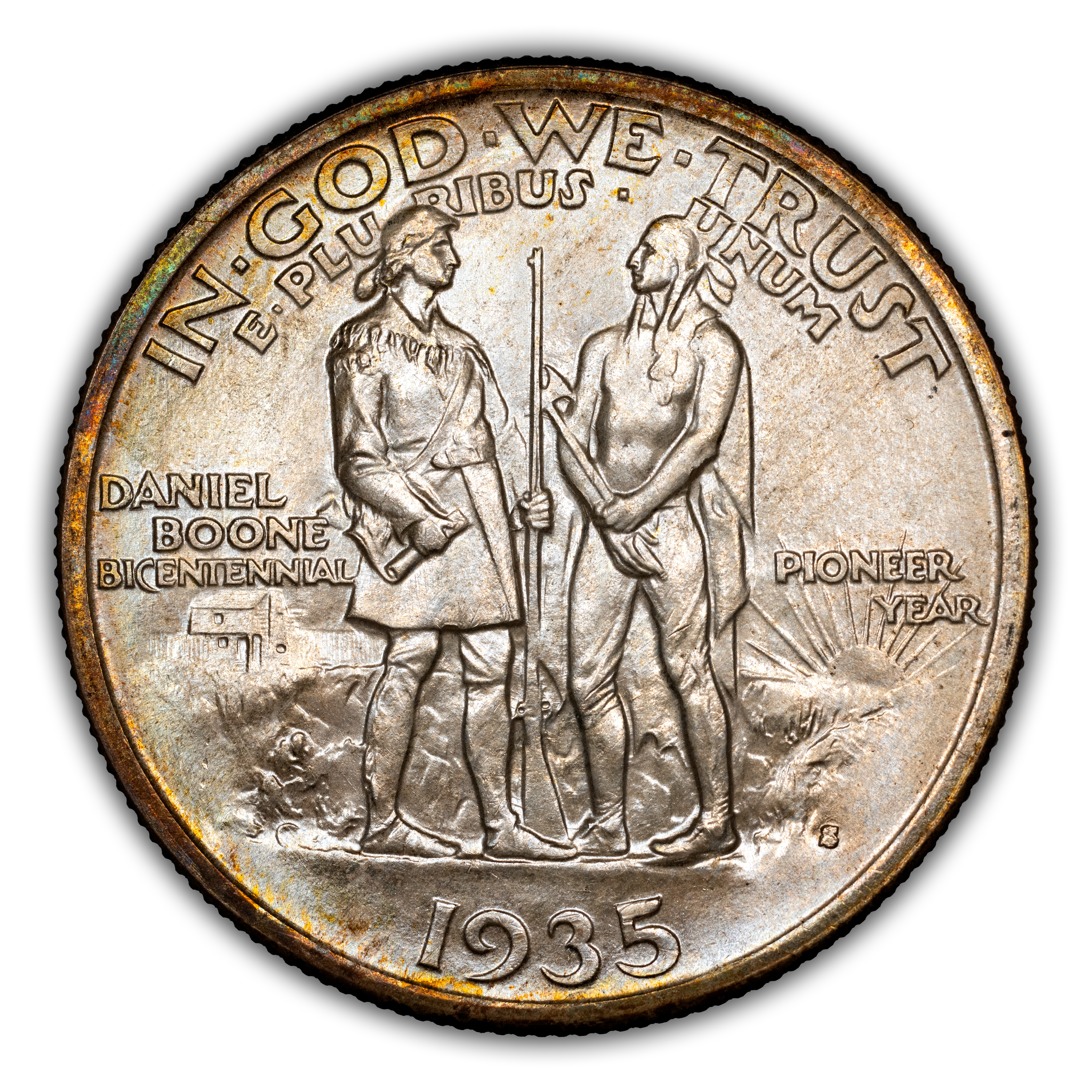 The 1935 Boone half dollars mark the continuation of a commemorative series honoring the 200th anniversary of American explorer and folk hero Daniel Boone, who was born in 1734 and helped settle the lands to be known as Kentucky. The Boone half dollar was designed by Augustus Lukeman and was minted over the course of five years, beginning in 1934.