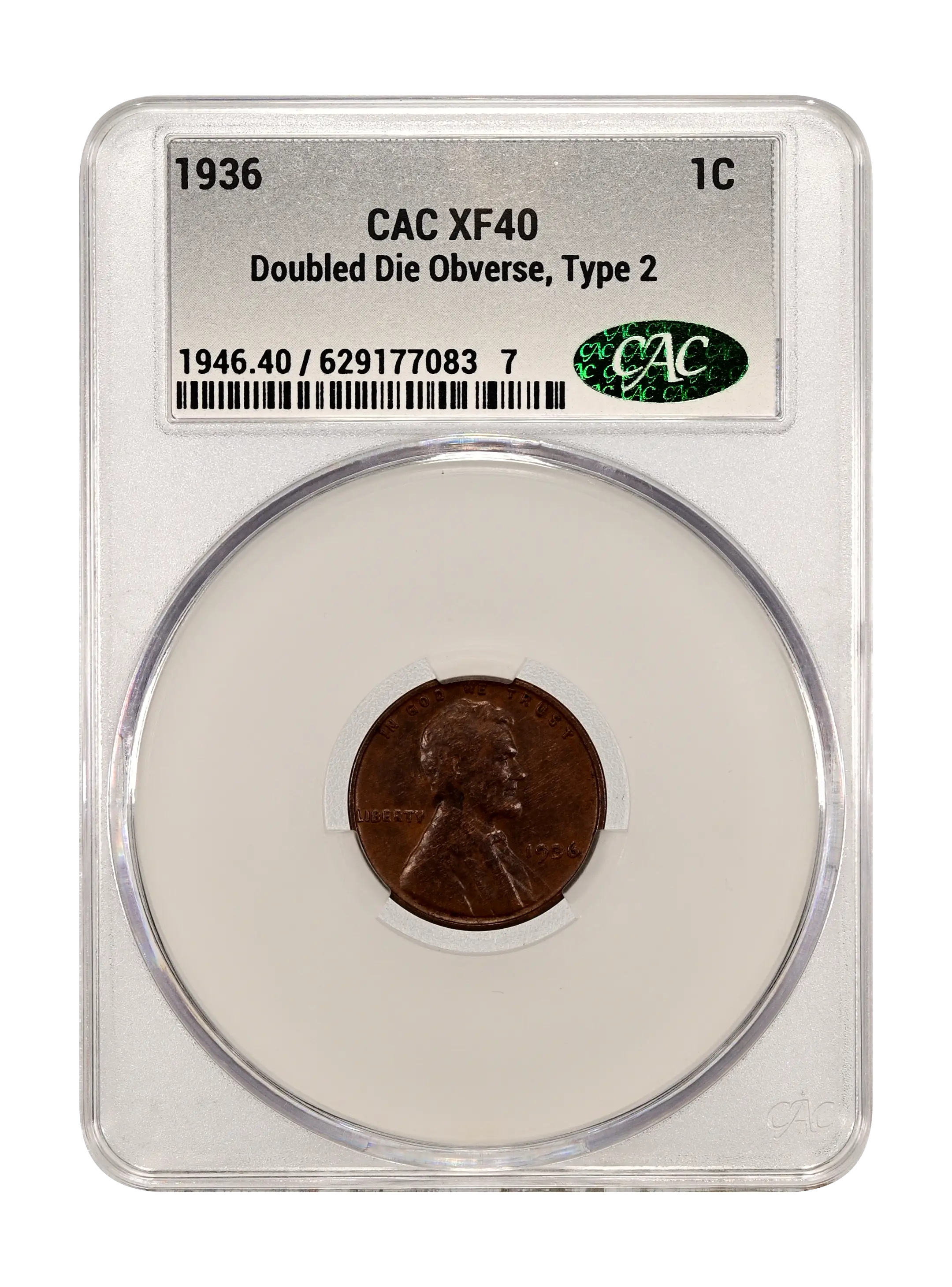 1936 Doubled Die Obverse, Type 2 1c BN CAC XF40BN