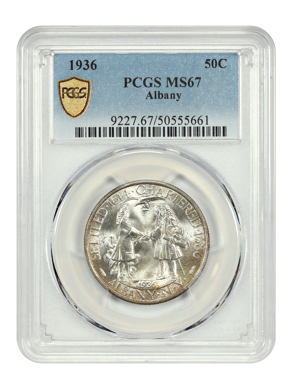 The 1936 Albany commemorative half dollar was issued to mark the 250th anniversary of the charter granted to the city of Albany, New York. Its design by Gertrude Lathrop featuring a beaver and maple leaves on the obverse and a reverse depiction of Colonial Governor Sir Thomas Dongan bestowing Albany's first mayor, Peter Schuyler and New York colonial official and fur trader Robert Livingston the Elder.