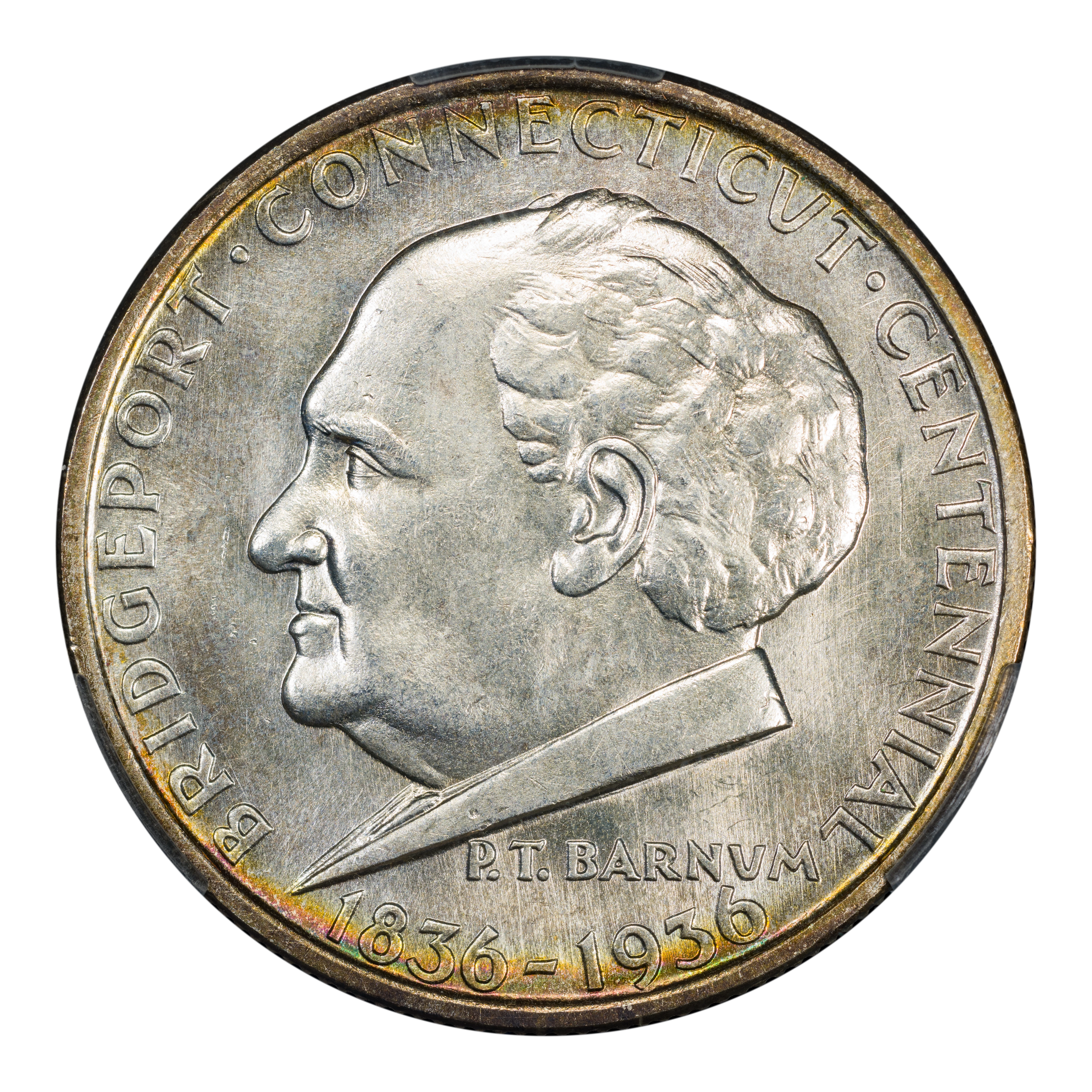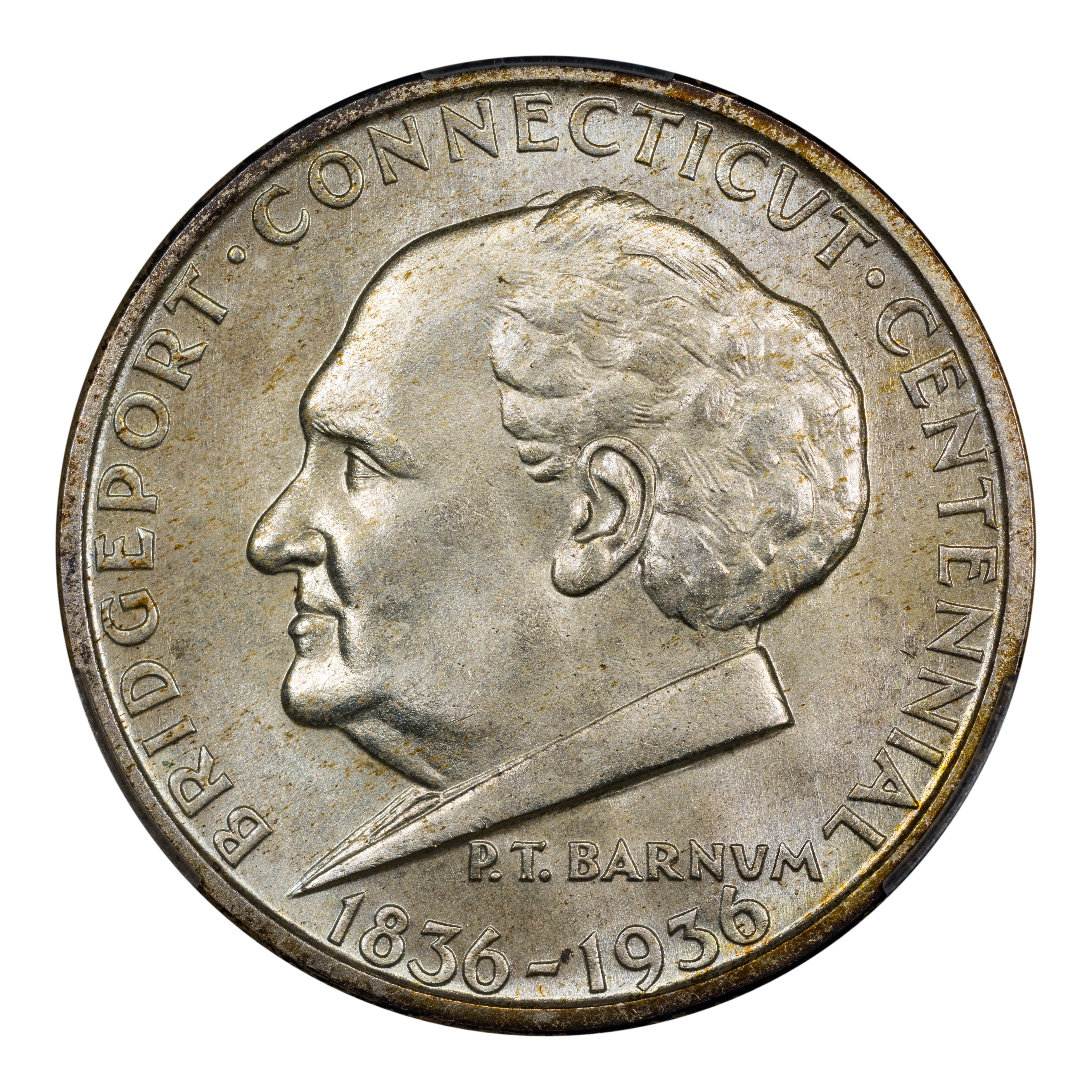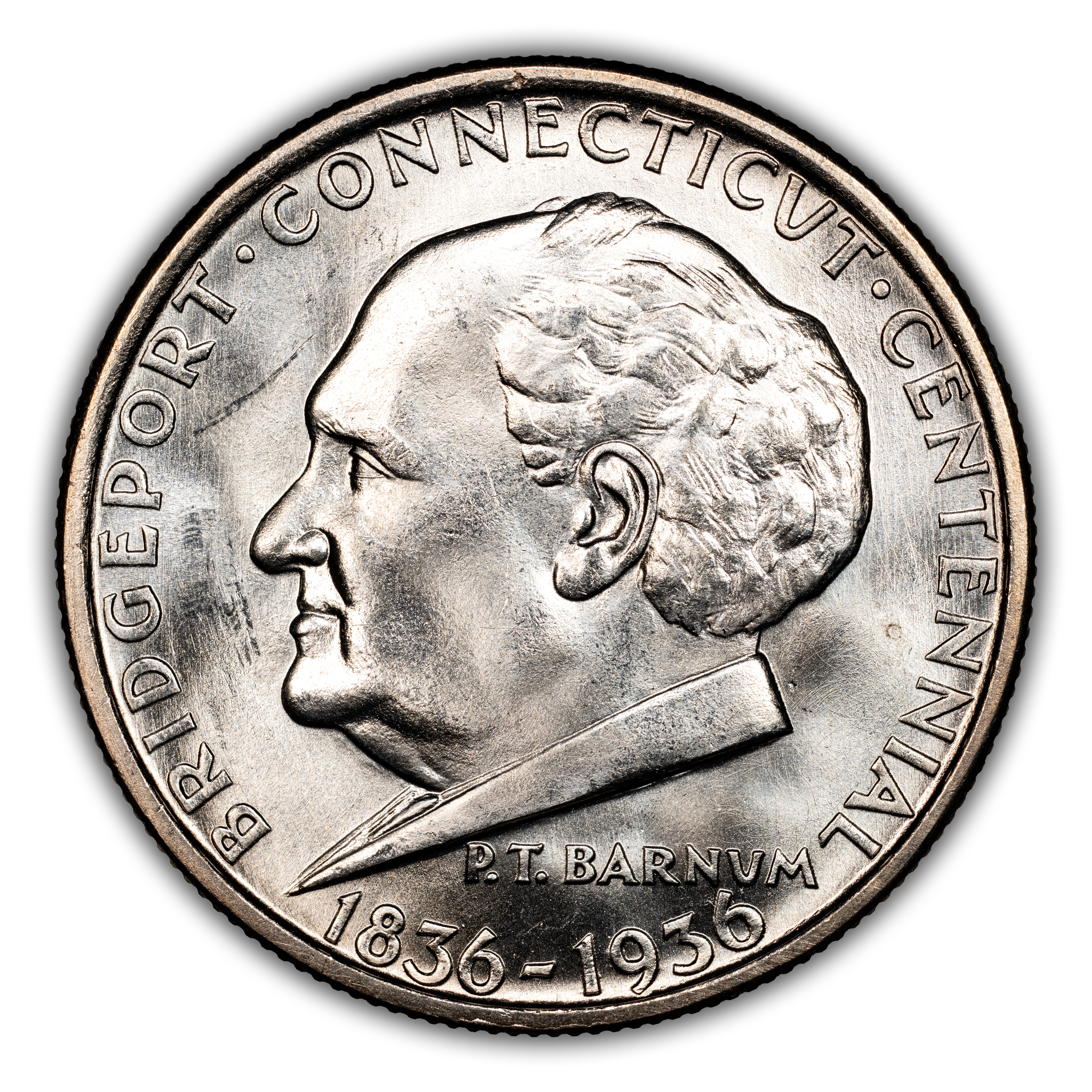 The 1936 Bridgeport, Connecticut, centennial marks the 100th anniversary of the historic seaport city in the Constitution State. The Bridgeport half dollar, designed by Henry Kreis, is carried by an obverse bust of one of Connecticut's most famous residents, Phineas Taylor Barnum. He is famous for many things, including his years in politics and his cofounding of the Barnum & Bailey Circus.