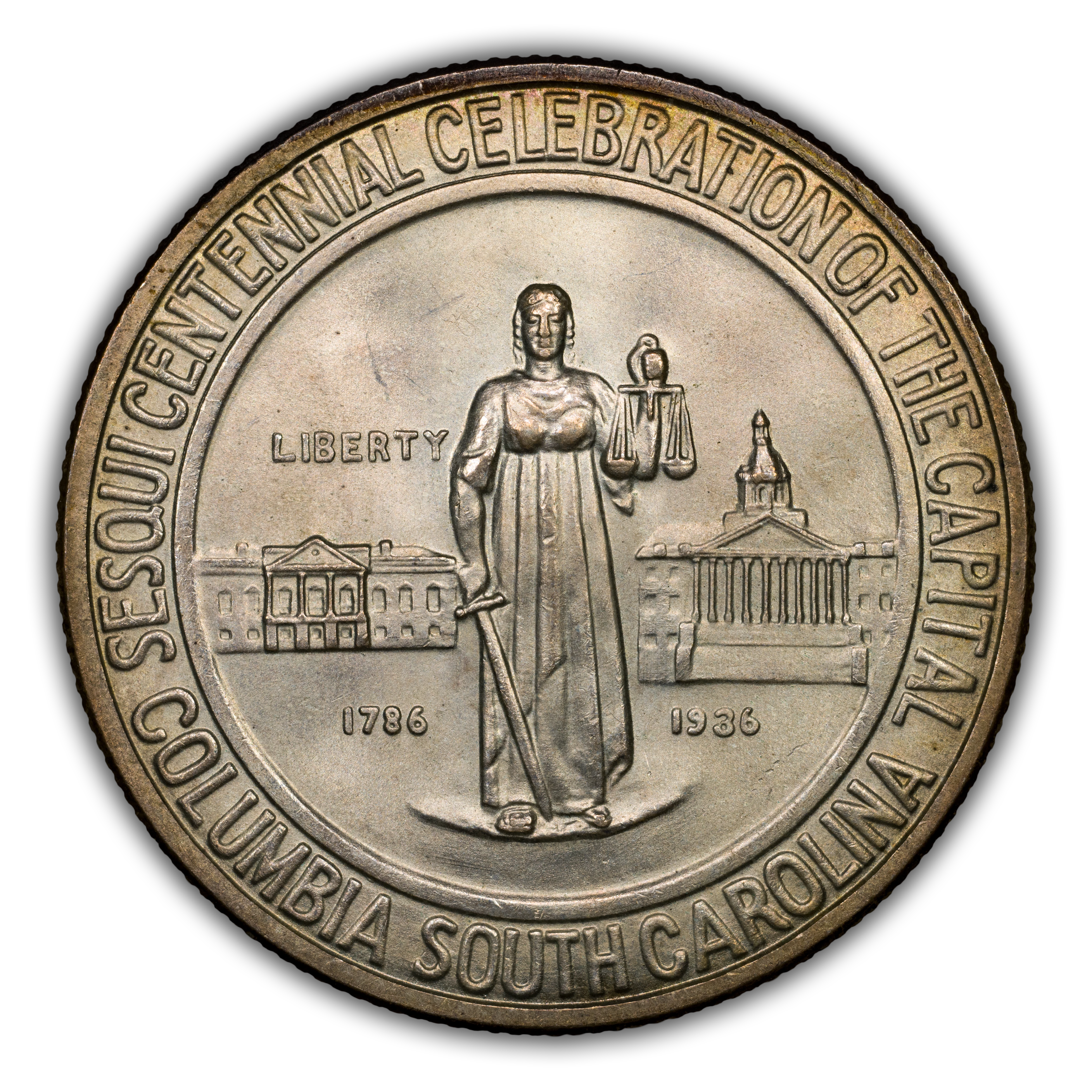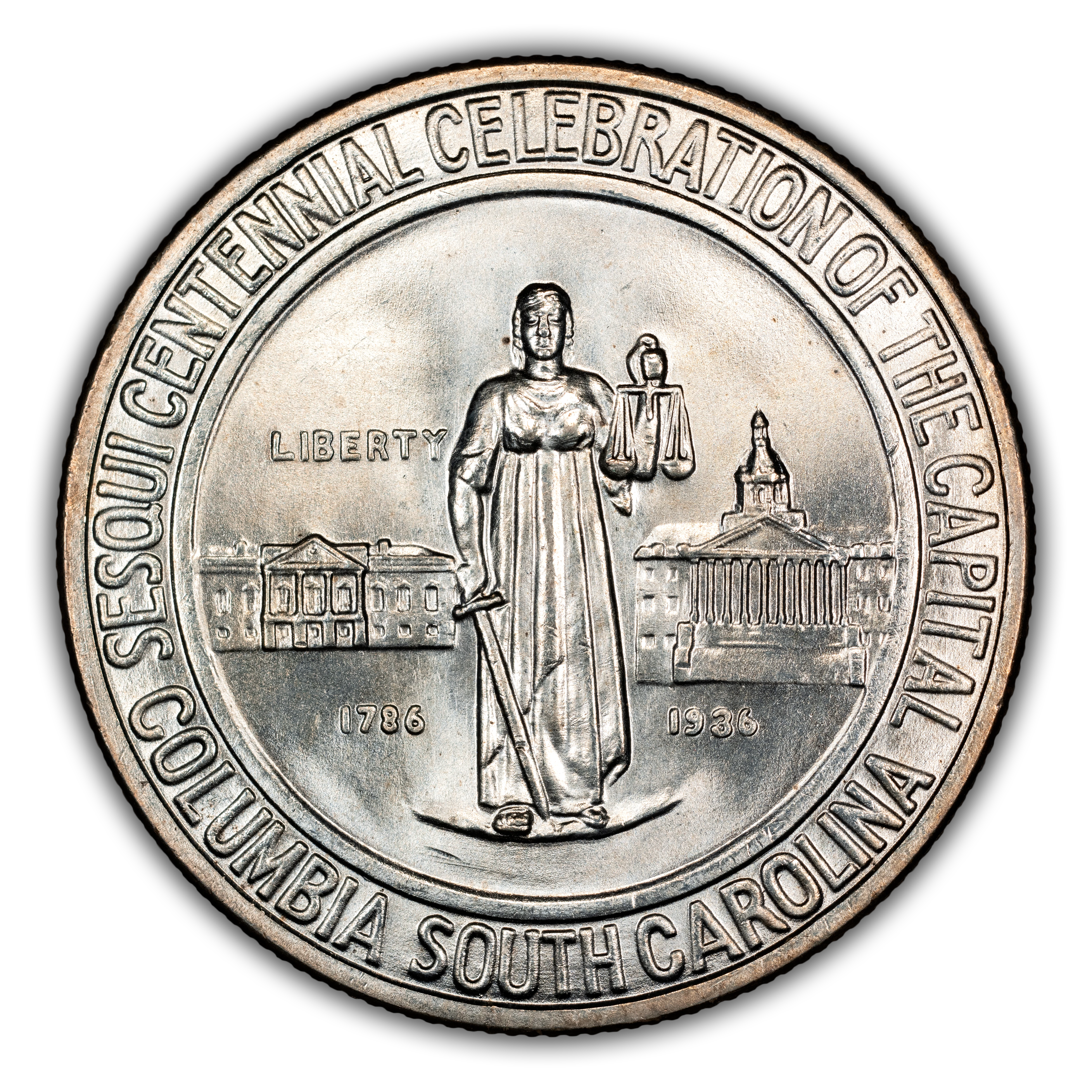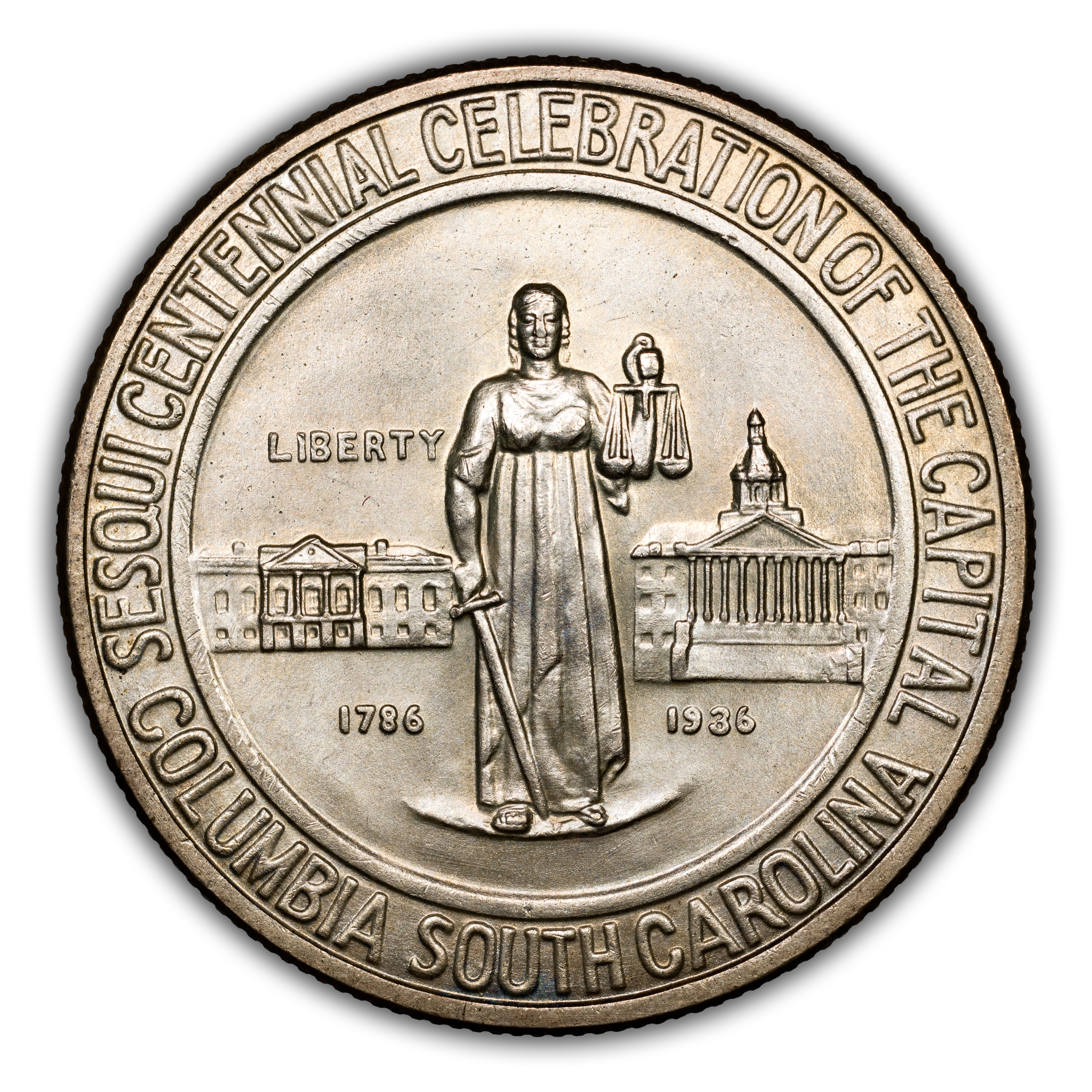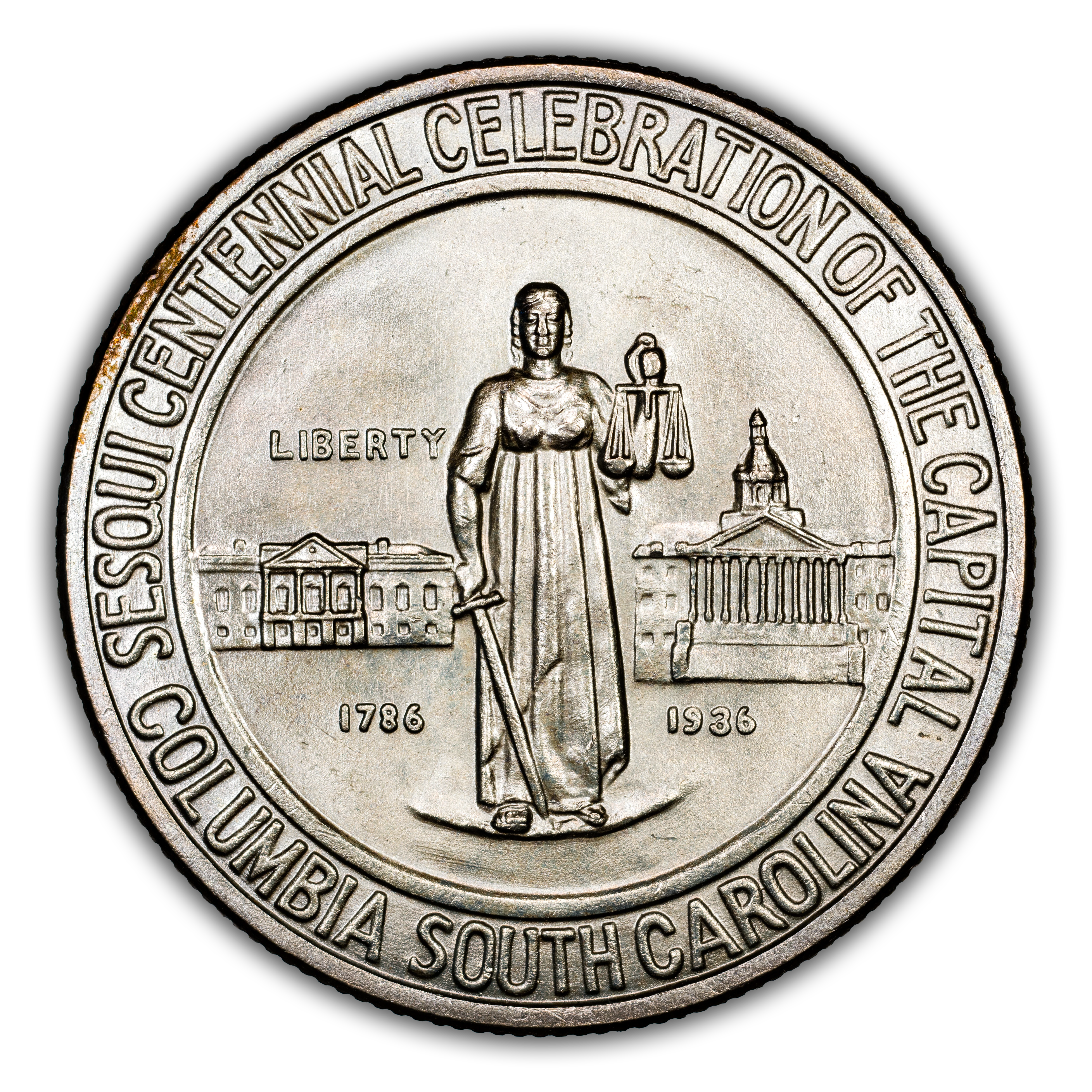 The 150th anniversary of the South Carolina's capital city of Columbia is honored on this 1936 coin. The city of Columbia, founded in 1786, is honored on the obverse by a statue of Justice with Old State House of 1790 to the left and the New State House, completed by 1907, on the right. The reverse showcases a palmetto, which serves as the state's iconic symbol. Some will note a broken oak limb below the palmetto; this symbolizes Fort Moultrie, built with palmetto wood, and its success in defeating King George's oak ships.