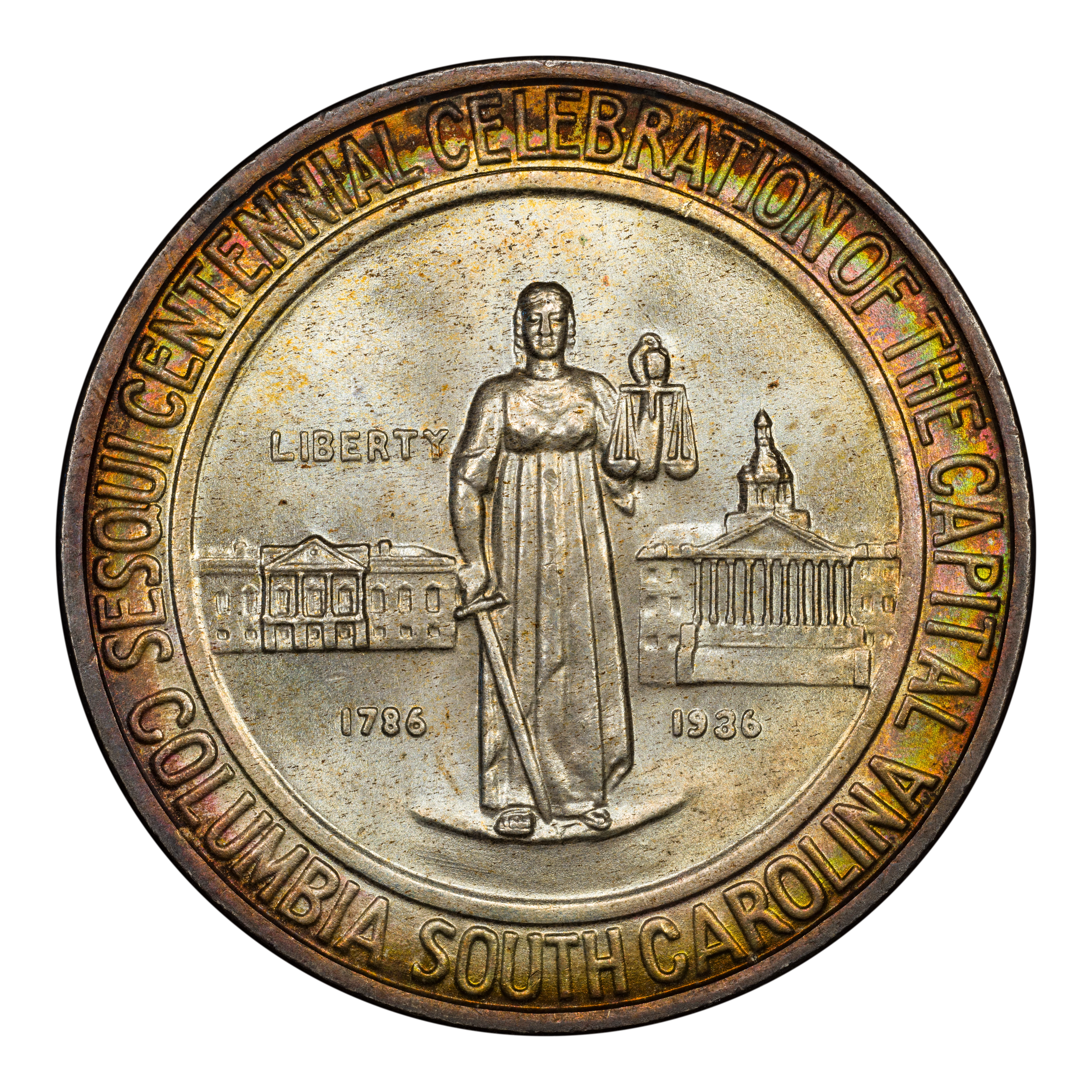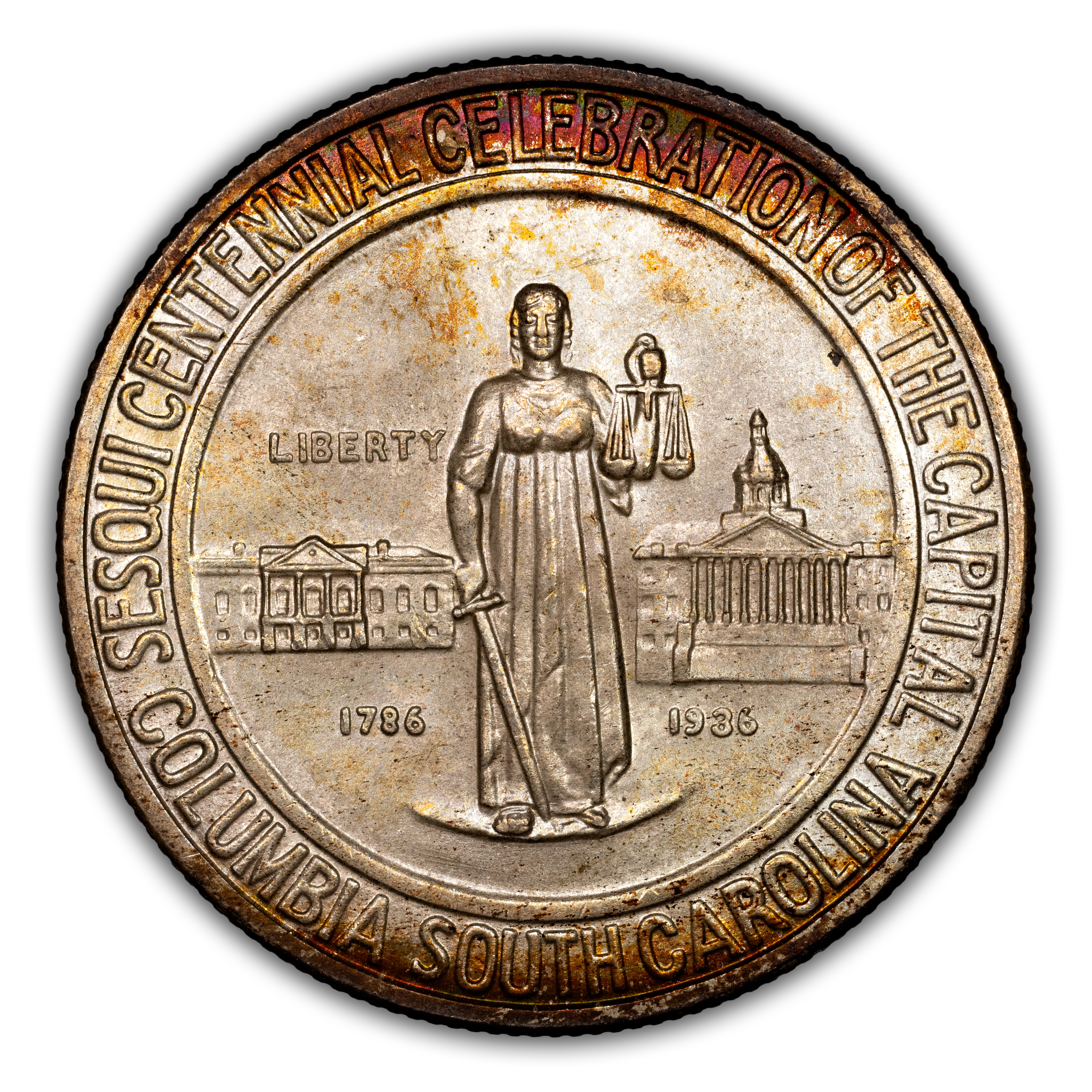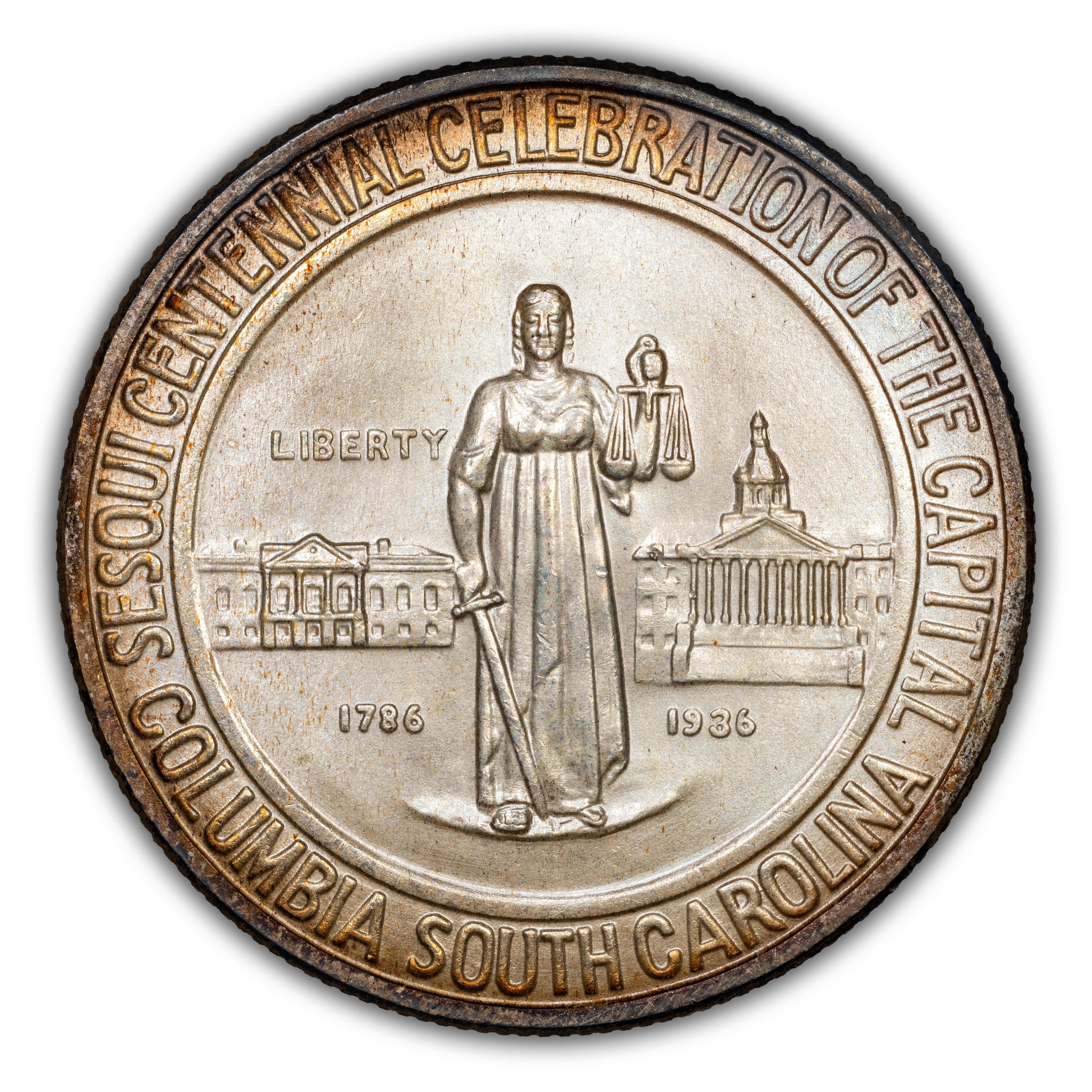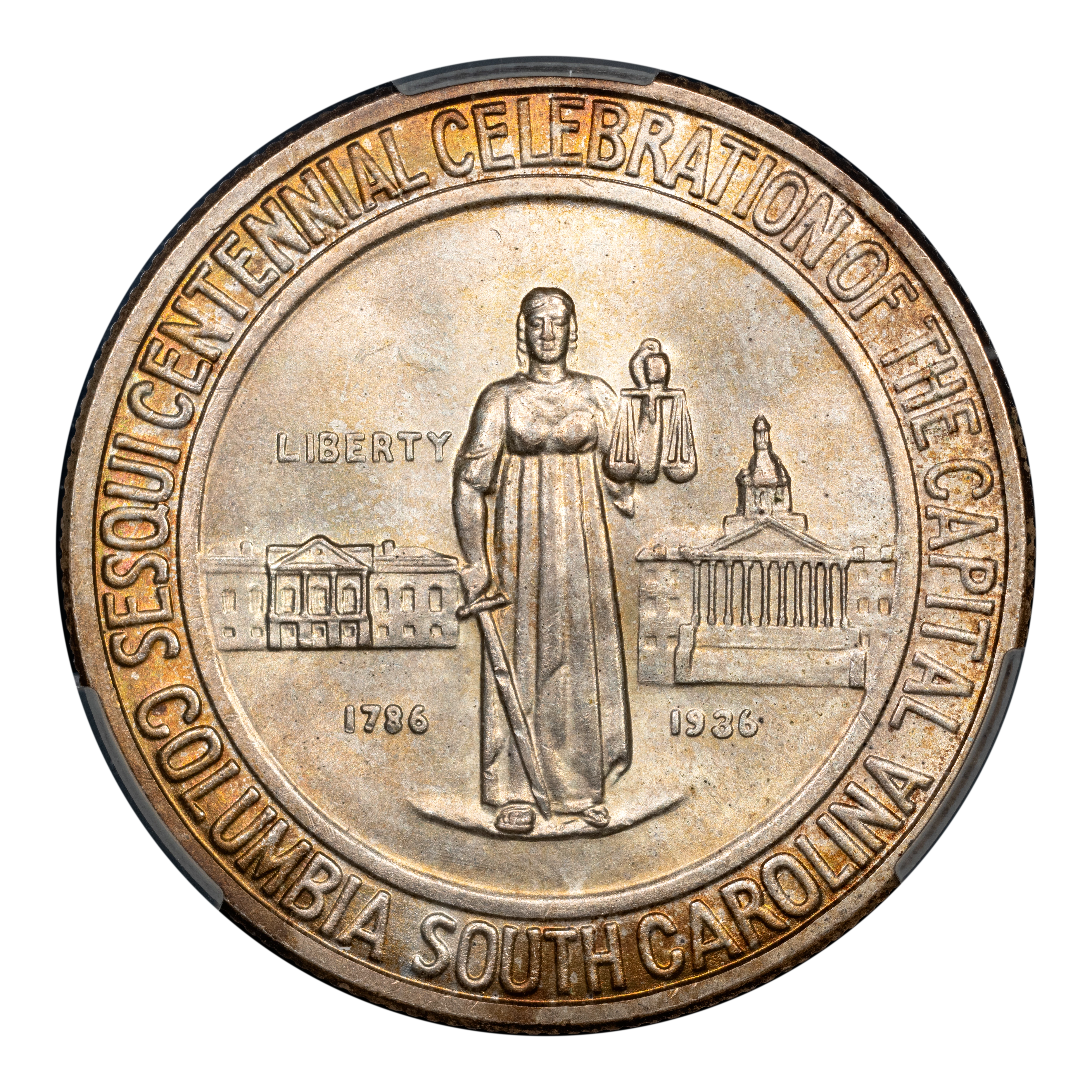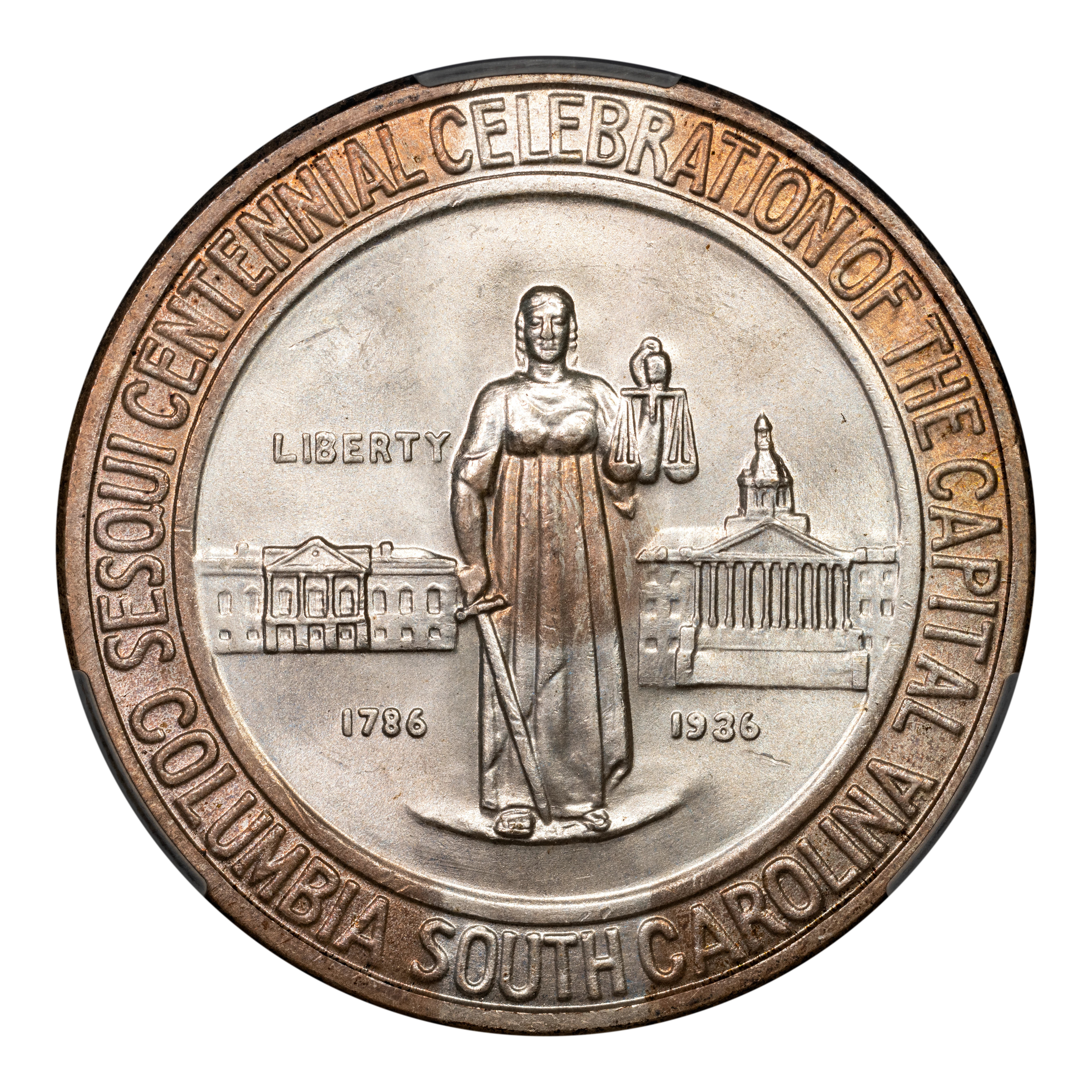 The 150th anniversary of the South Carolina's capital city of Columbia is honored on this 1936 coin. The city of Columbia, founded in 1786, is honored on the obverse by a statue of Justice with Old State House of 1790 to the left and the New State House, completed by 1907, on the right. The reverse showcases a palmetto, which serves as the state's iconic symbol. Some will note a broken oak limb below the palmetto; this symbolizes Fort Moultrie, built with palmetto wood, and its success in defeating King George's oak ships.