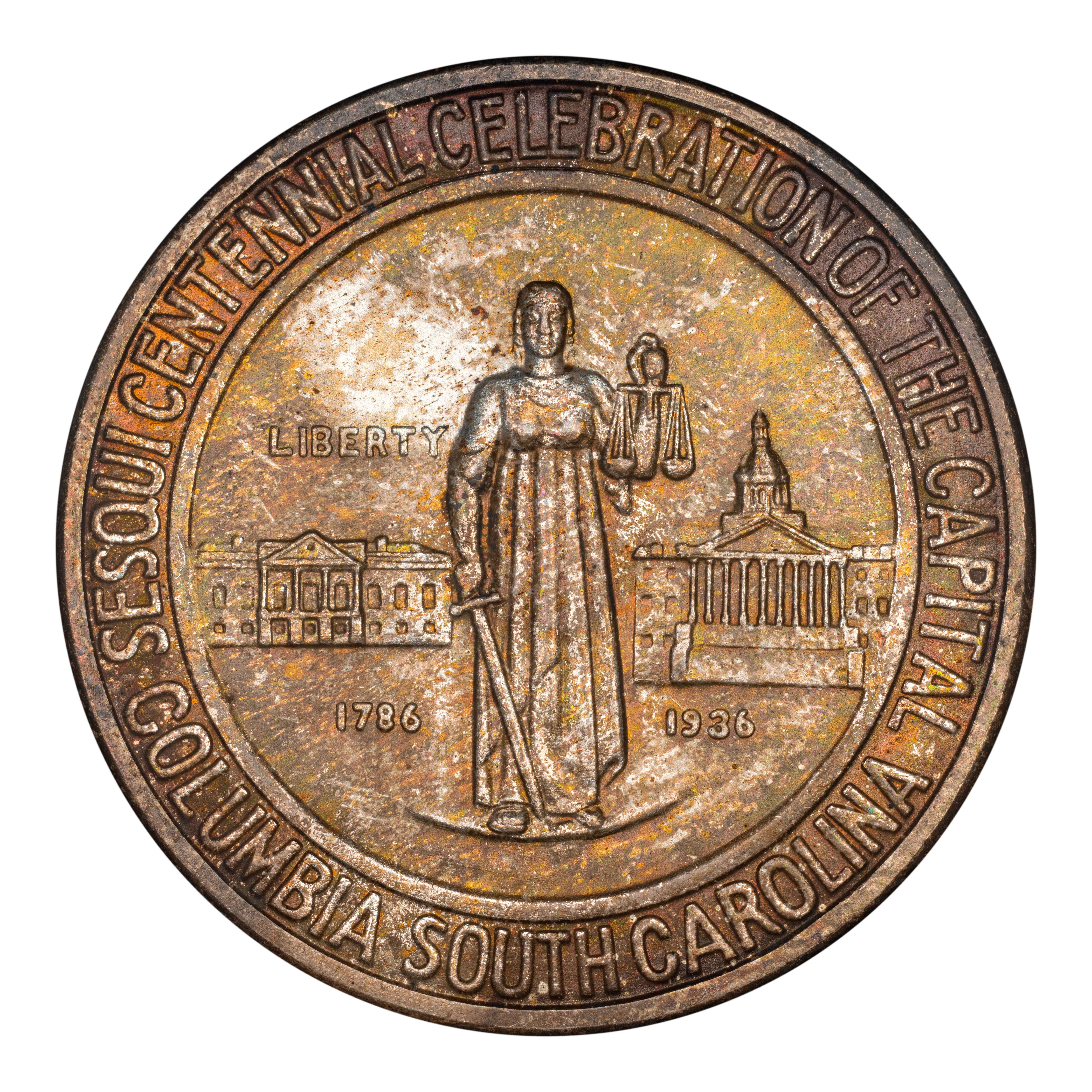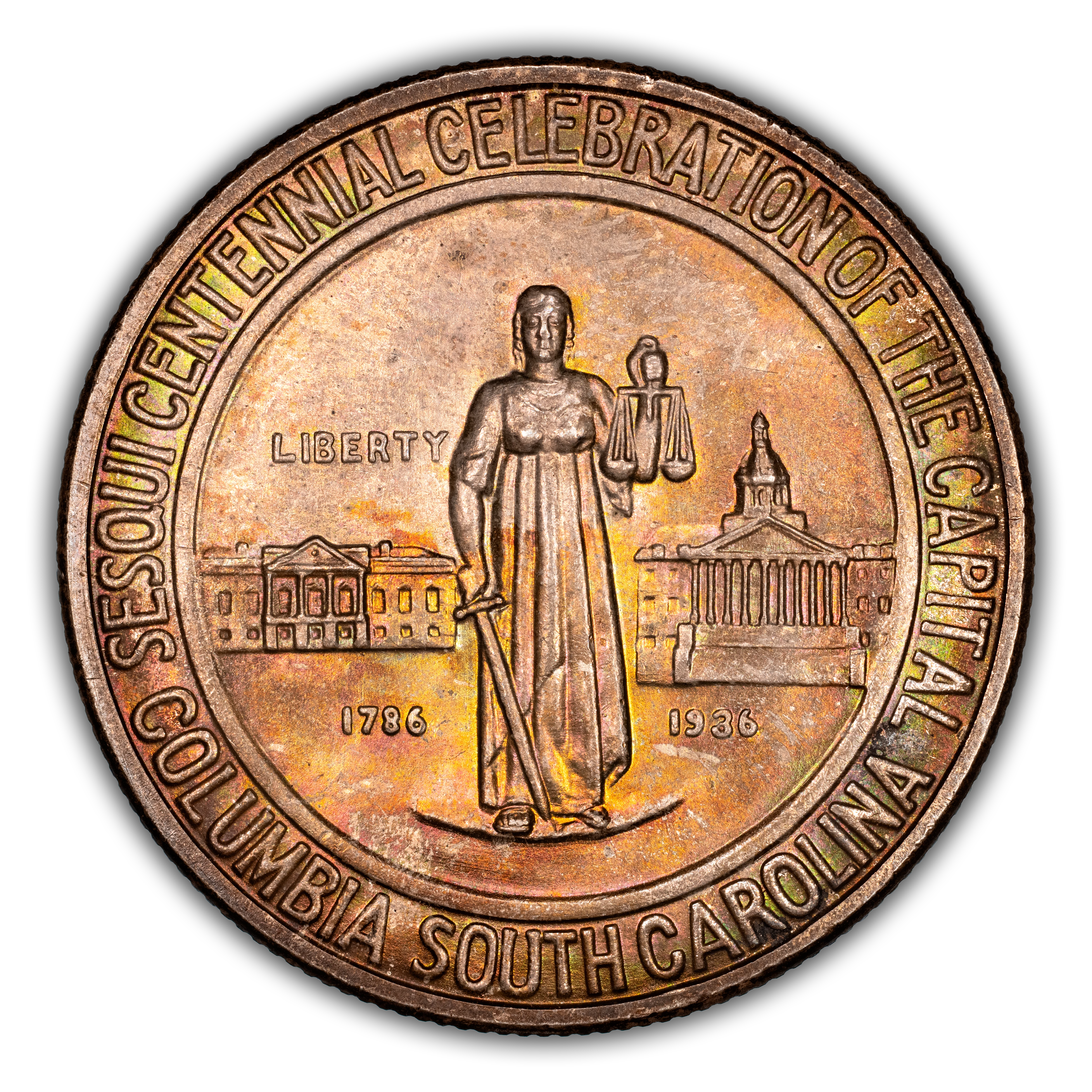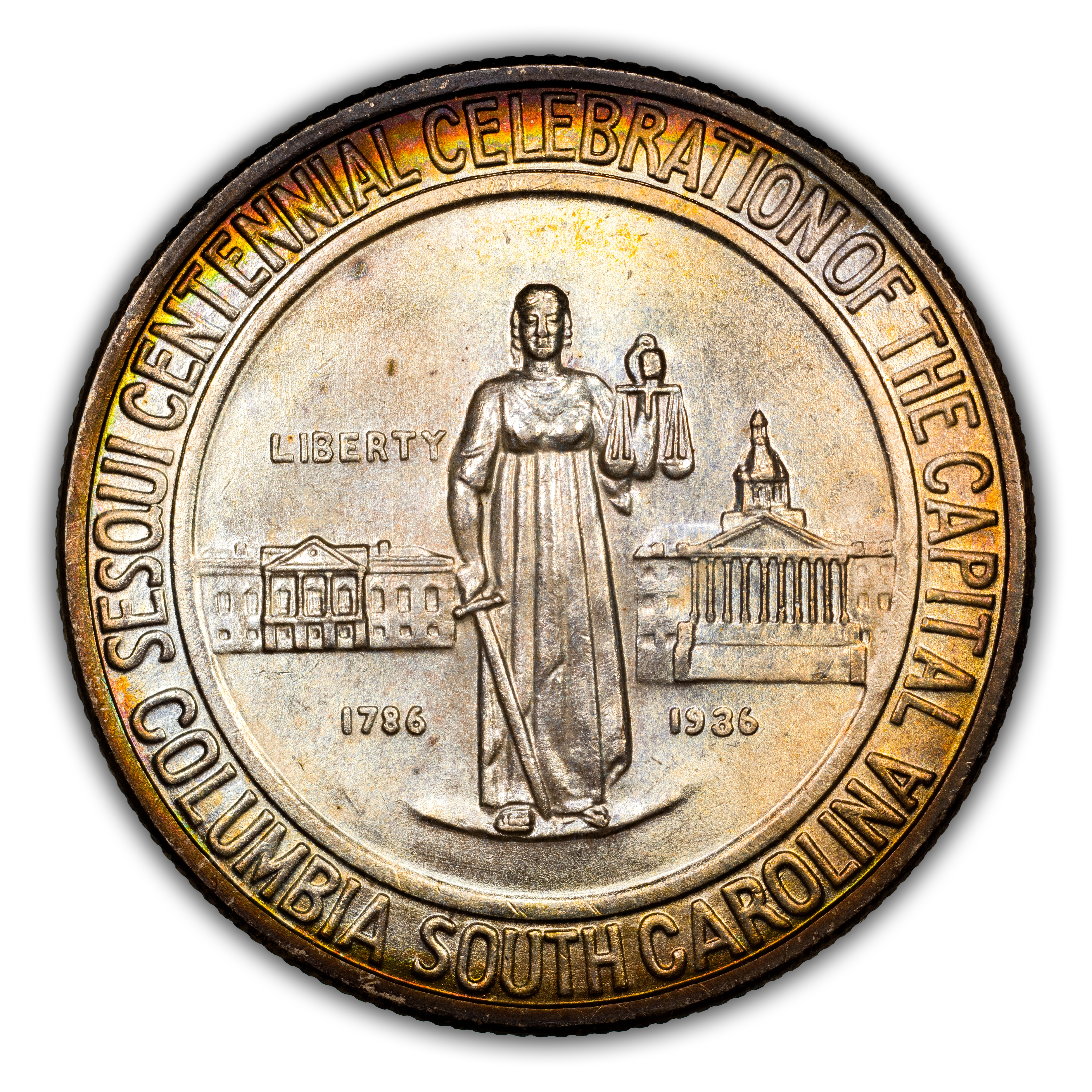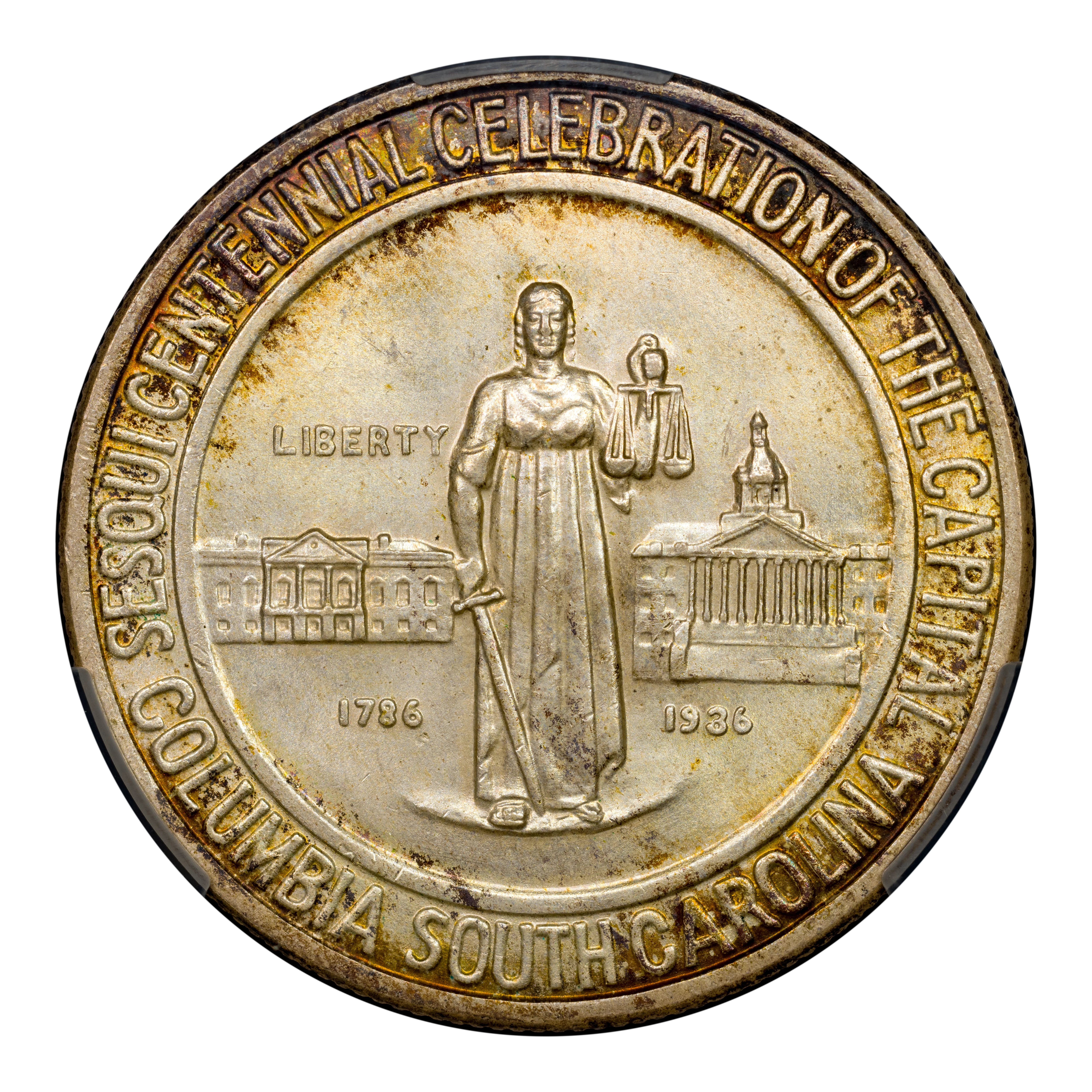The 150th anniversary of the South Carolina's capital city of Columbia is honored on this 1936 coin. The city of Columbia, founded in 1786, is honored on the obverse by a statue of Justice with Old State House of 1790 to the left and the New State House, completed by 1907, on the right. The reverse showcases a palmetto, which serves as the state's iconic symbol. Some will note a broken oak limb below the palmetto; this symbolizes Fort Moultrie, built with palmetto wood, and its success in defeating King George's oak ships.