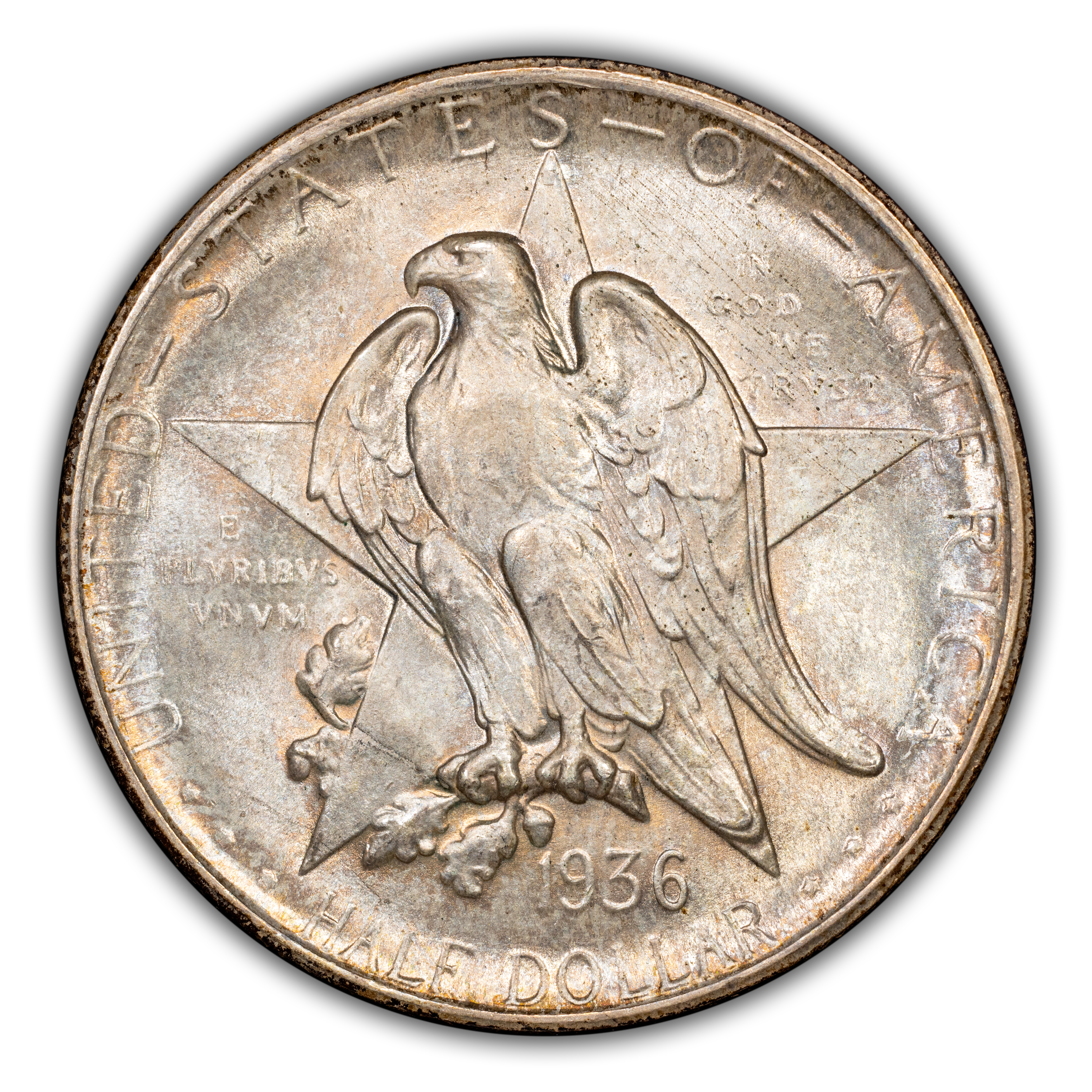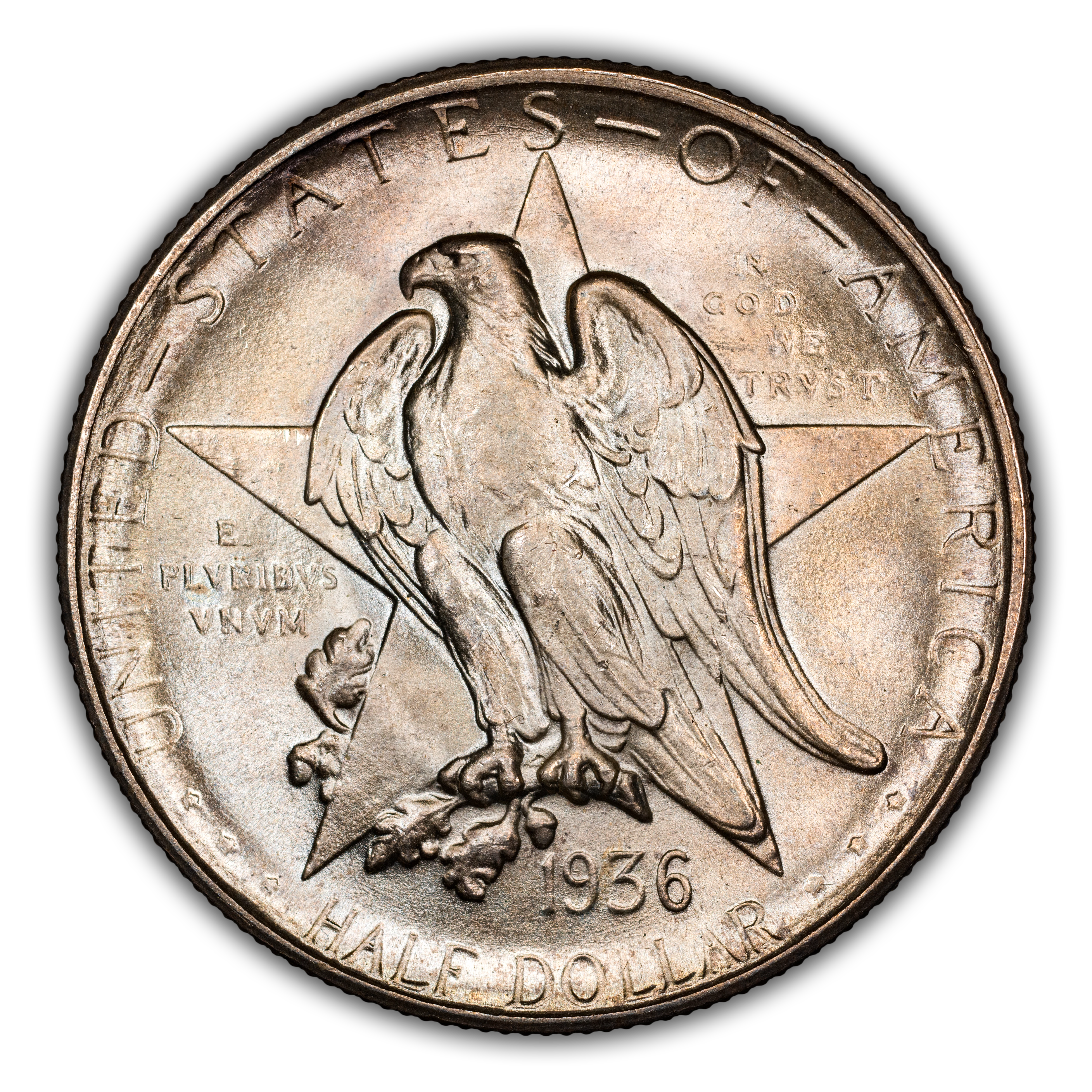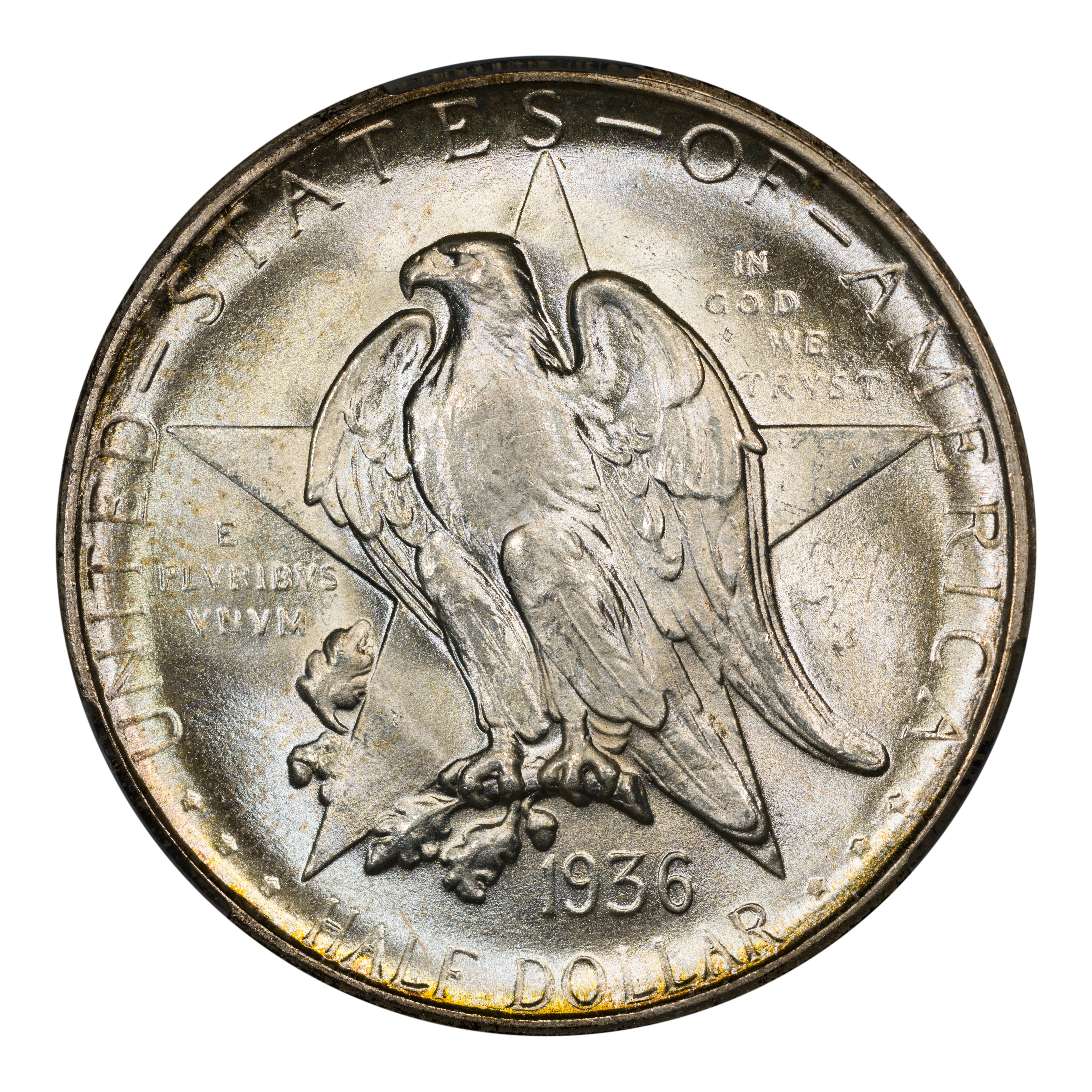 The 1936 Texas half dollars mark the third annual installment of this commemorative type, which was struck from 1934 through 1938. The coin, honoring the 100th anniversary of Texas independence from Mexico in 1836, was designed by Pompeo Coppini. It features on its obverse an eagle and five-pointed star, while the reverse showcases -- variety of elements, including the goddess Victory, the Alamo, and two cameo busts of Texas founders General Sam Houston and Stephen Austin. The coin was issued for $1.50, and most were saved in uncirculated condition.