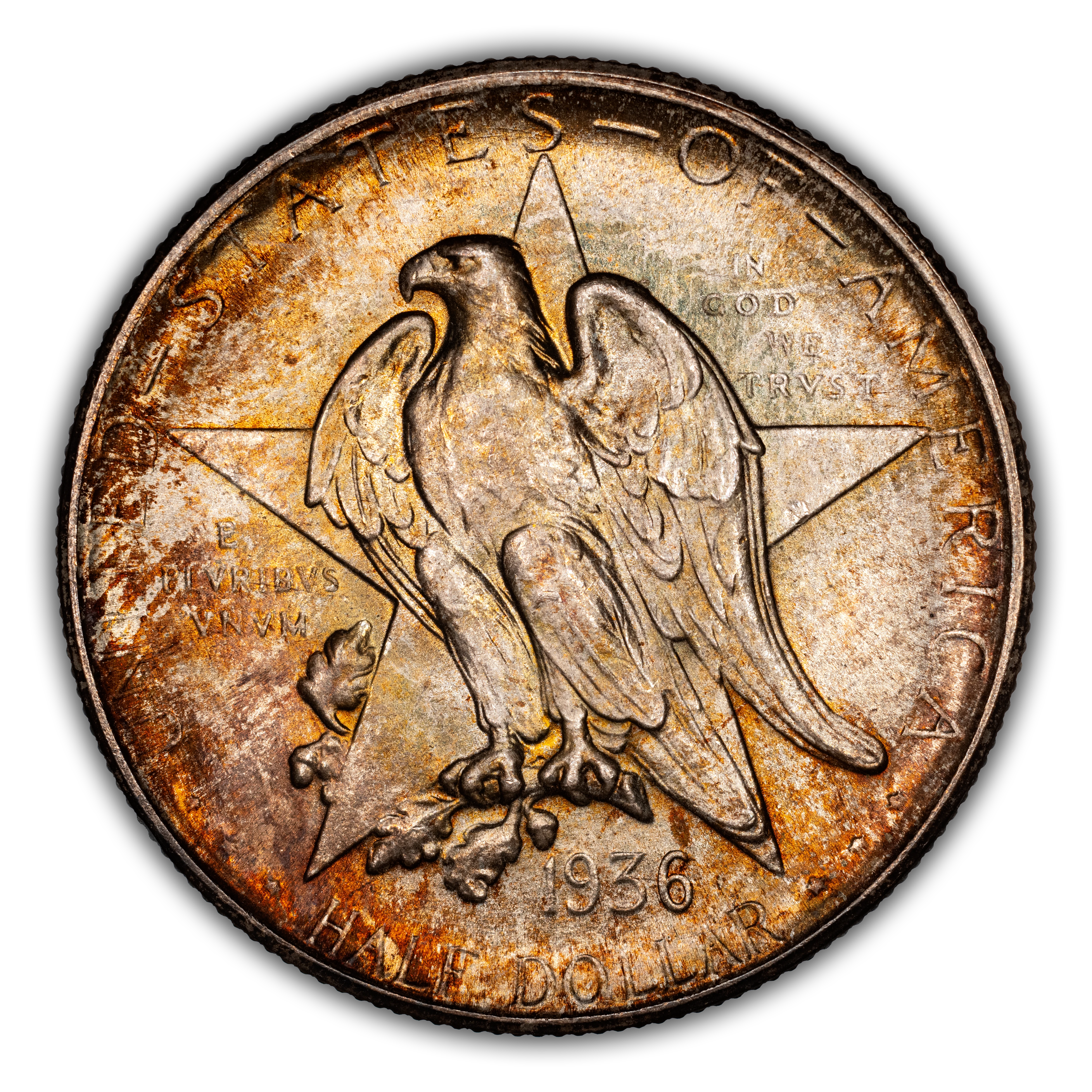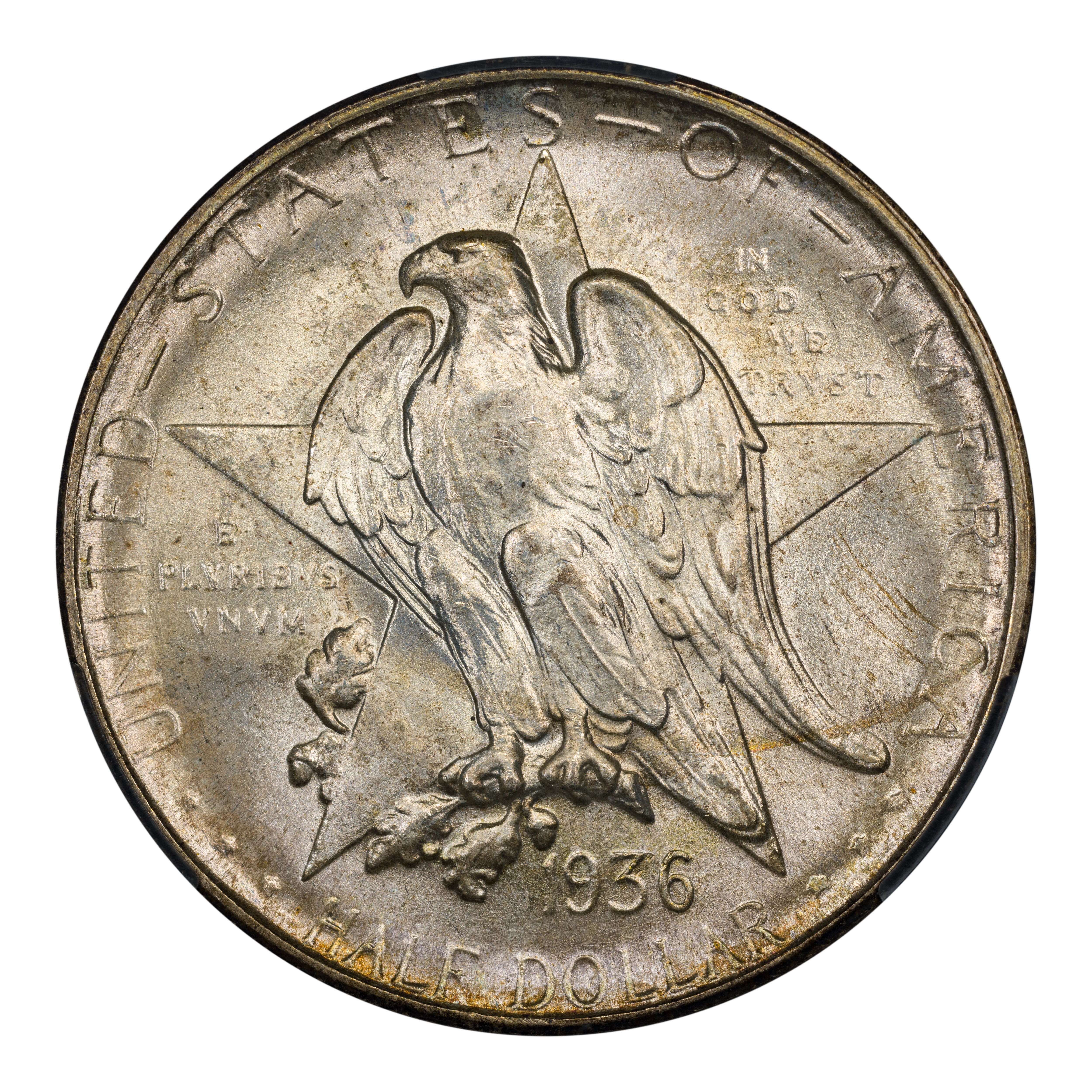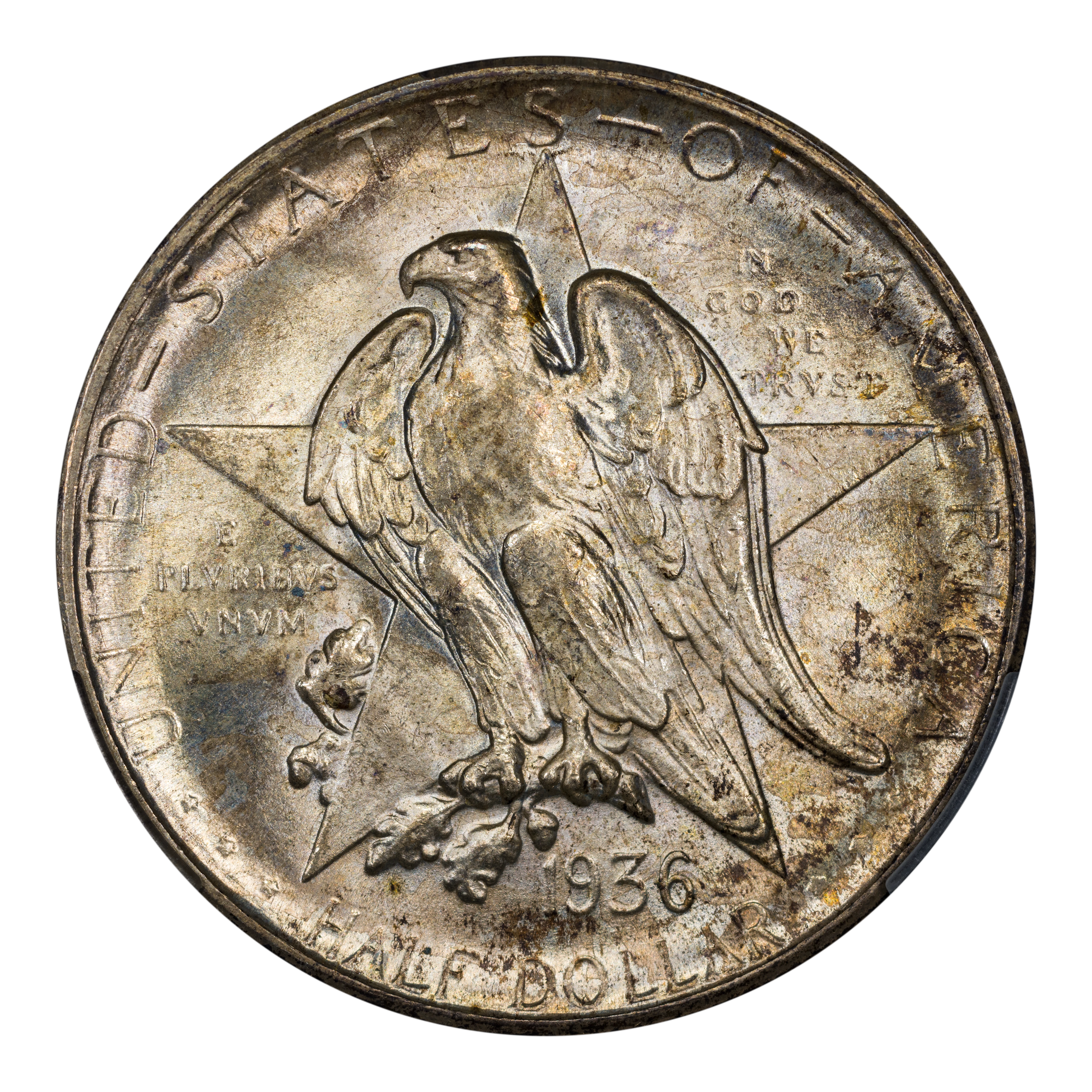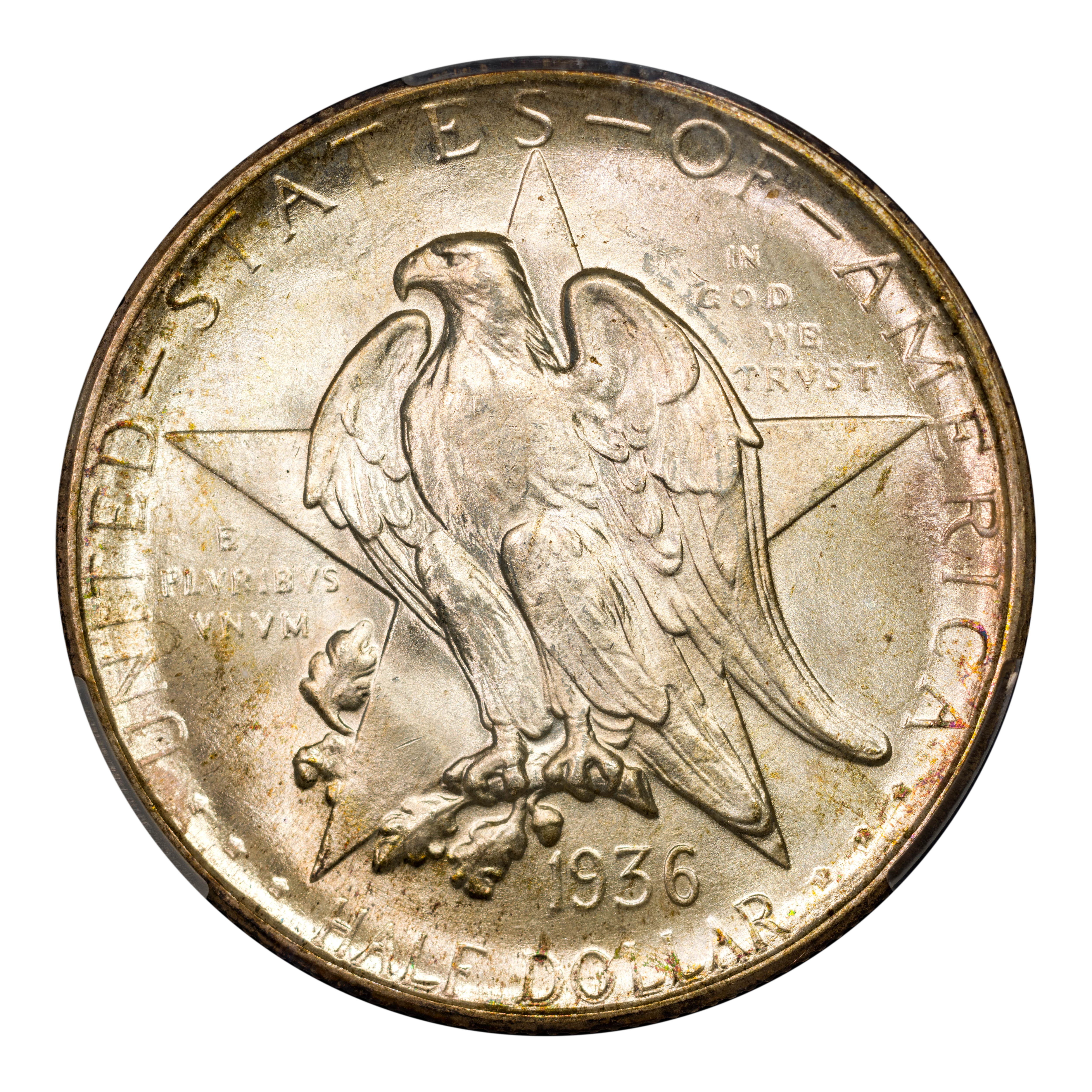 The 1936 Texas half dollars mark the third annual installment of this commemorative type, which was struck from 1934 through 1938. The coin, honoring the 100th anniversary of Texas independence from Mexico in 1836, was designed by Pompeo Coppini. It features on its obverse an eagle and five-pointed star, while the reverse showcases -- variety of elements, including the goddess Victory, the Alamo, and two cameo busts of Texas founders General Sam Houston and Stephen Austin. The coin was issued for $1.50, and most were saved in uncirculated condition.