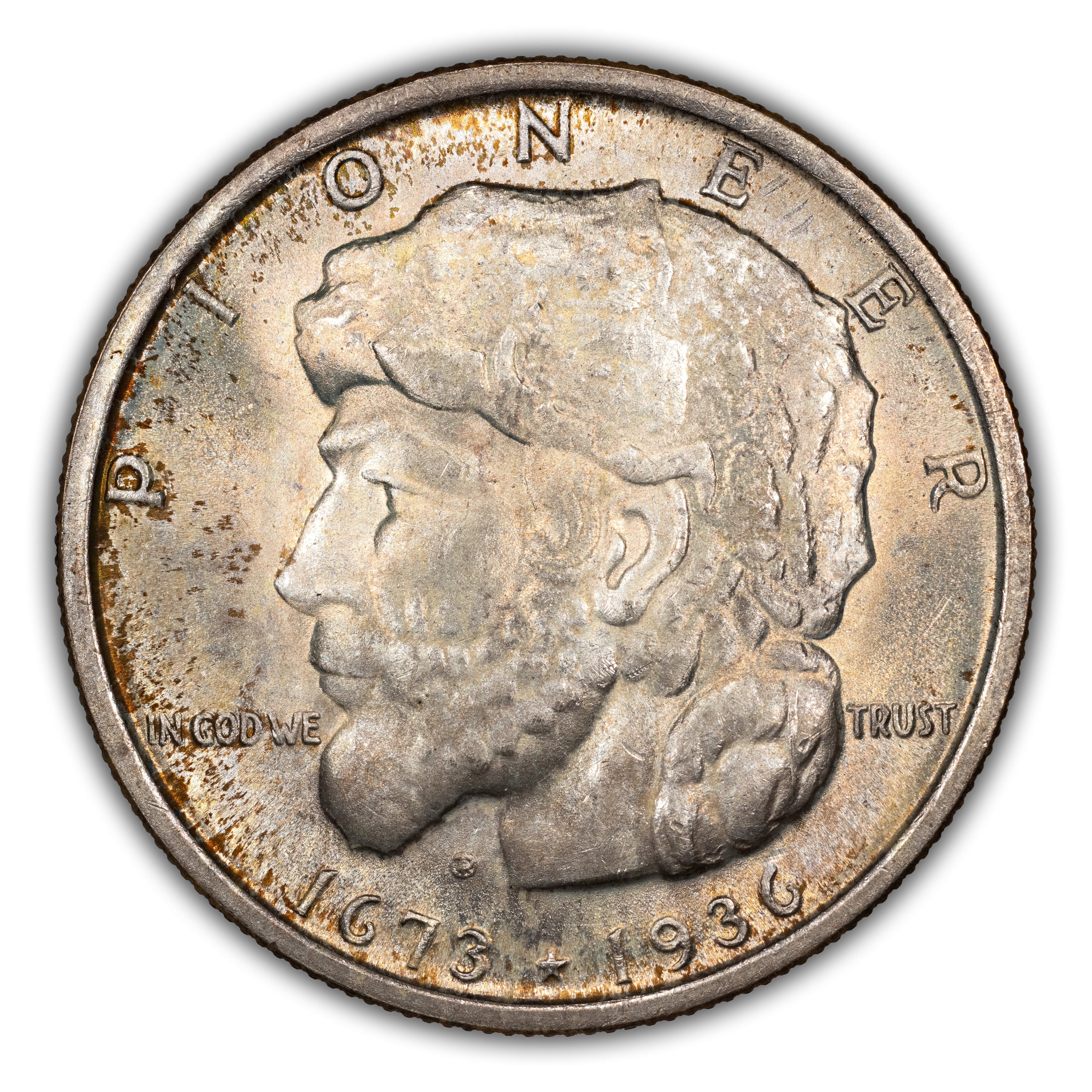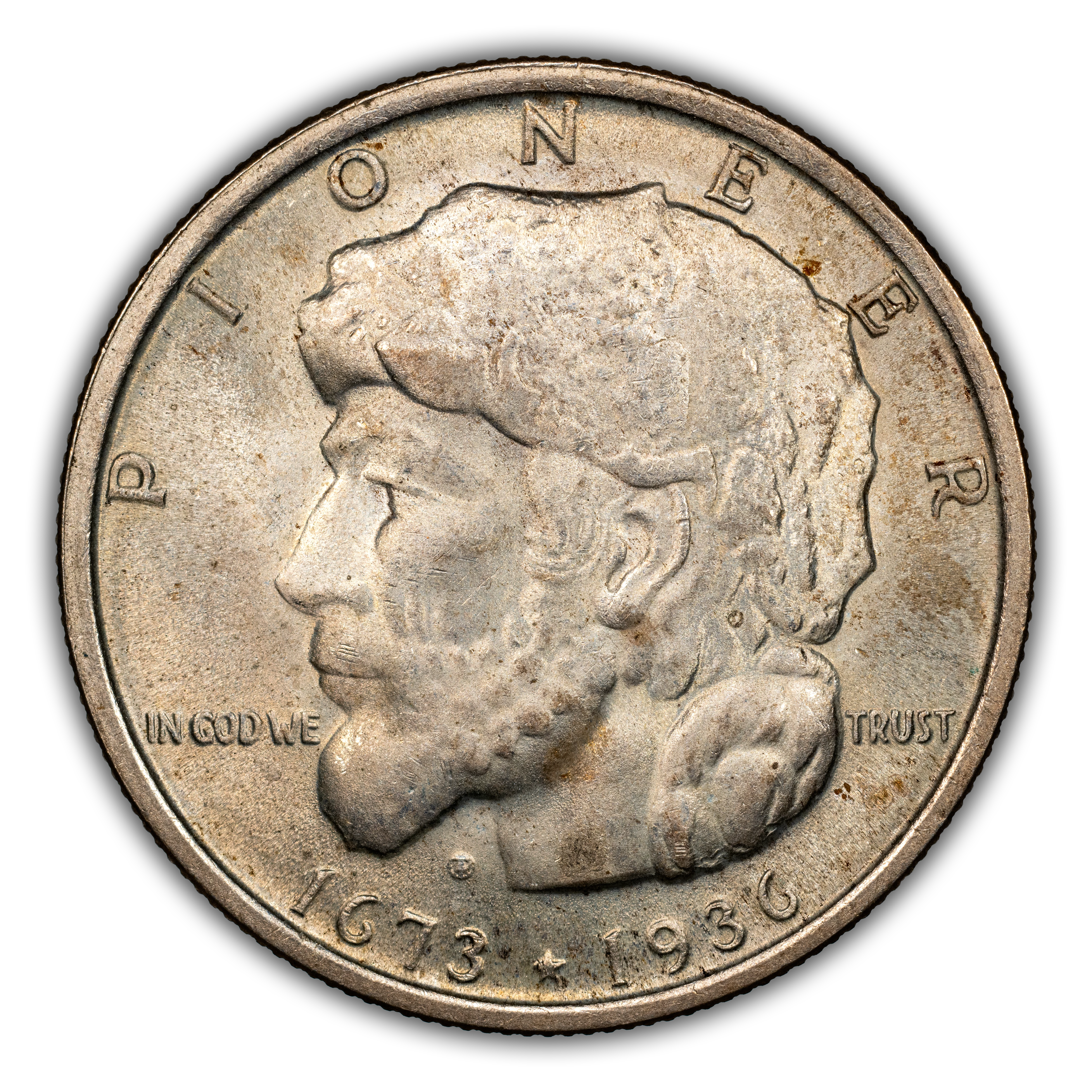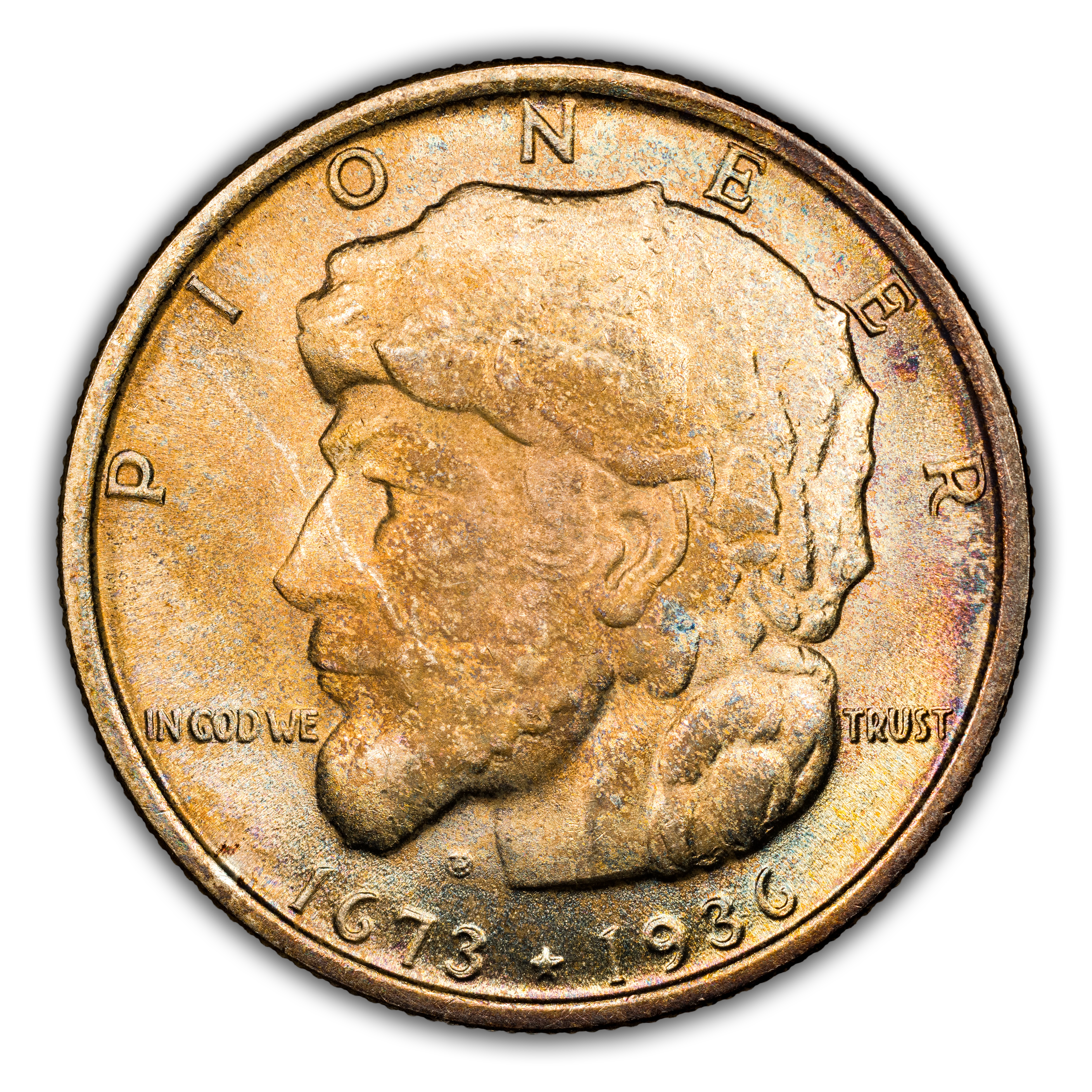 Arising during the most prolific year of new issues during the classic commemorative era, the 1936 Elgin half dollar honors the centennial of the moderately sized northern Illinois city. The coin, designed by Elgin sculptor and native Trygve A. Rovelstad, was issued to fund a memorial to local pioneer families. The obverse features the bust of a pioneer while the reverse depicts a pioneer family consisting of four adults and a baby.