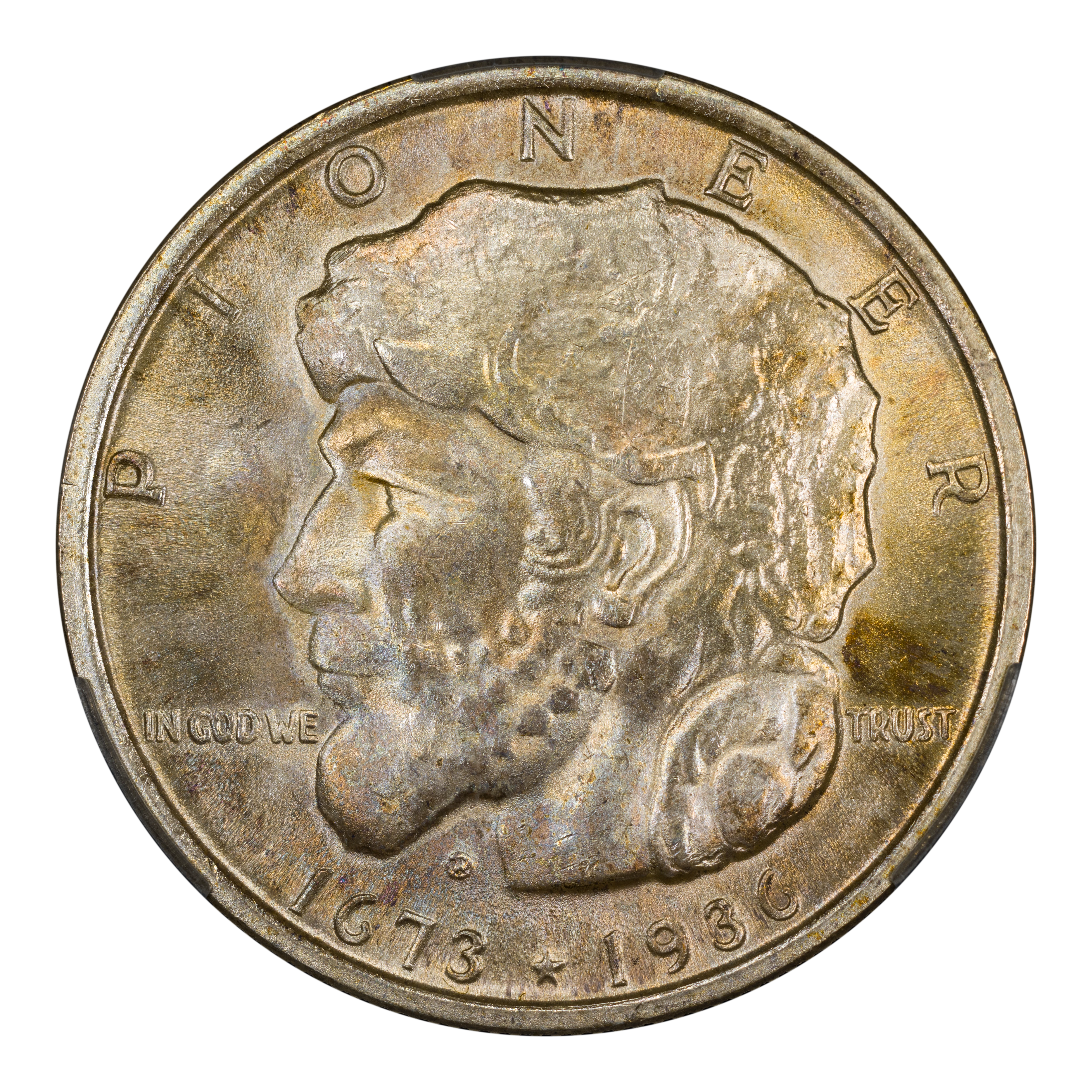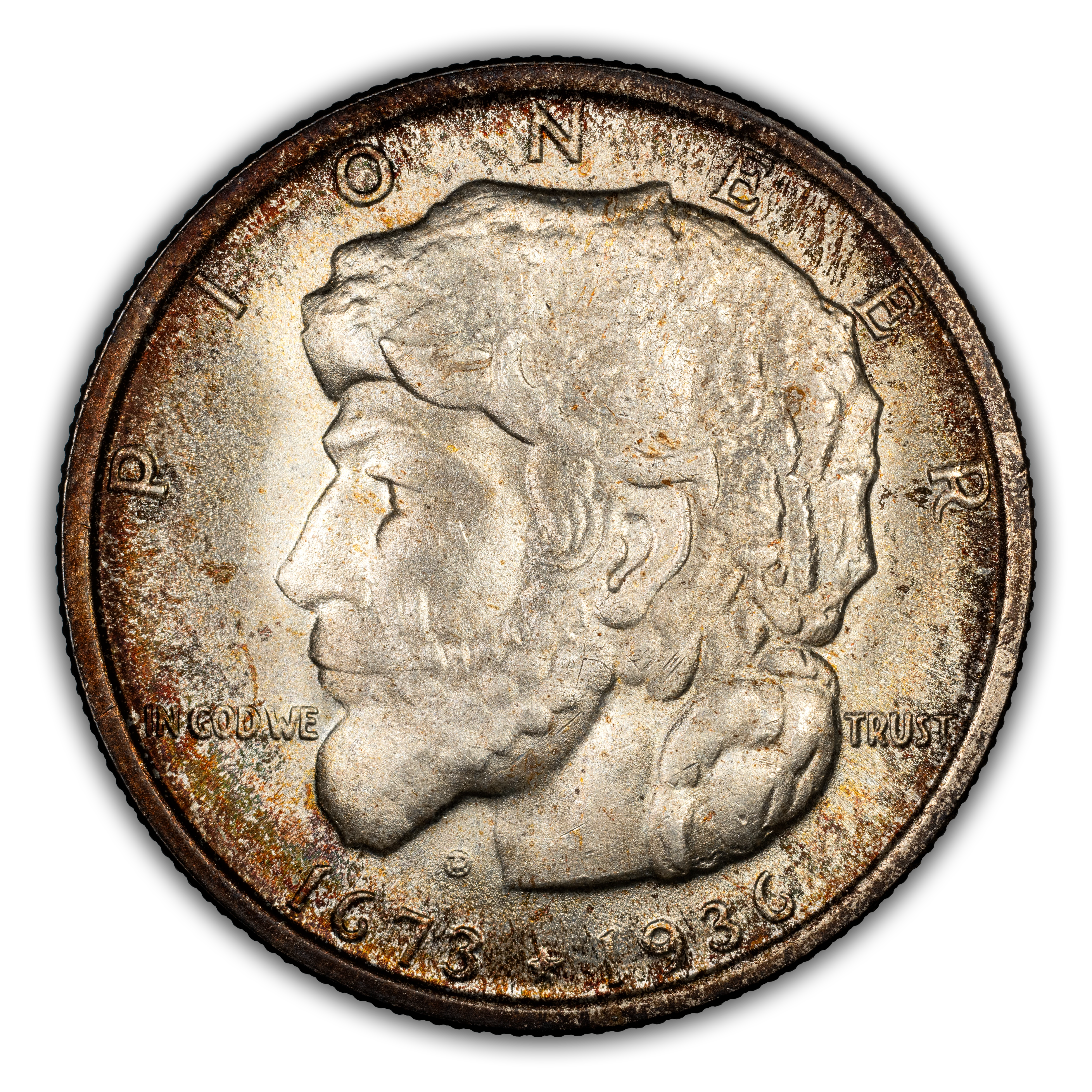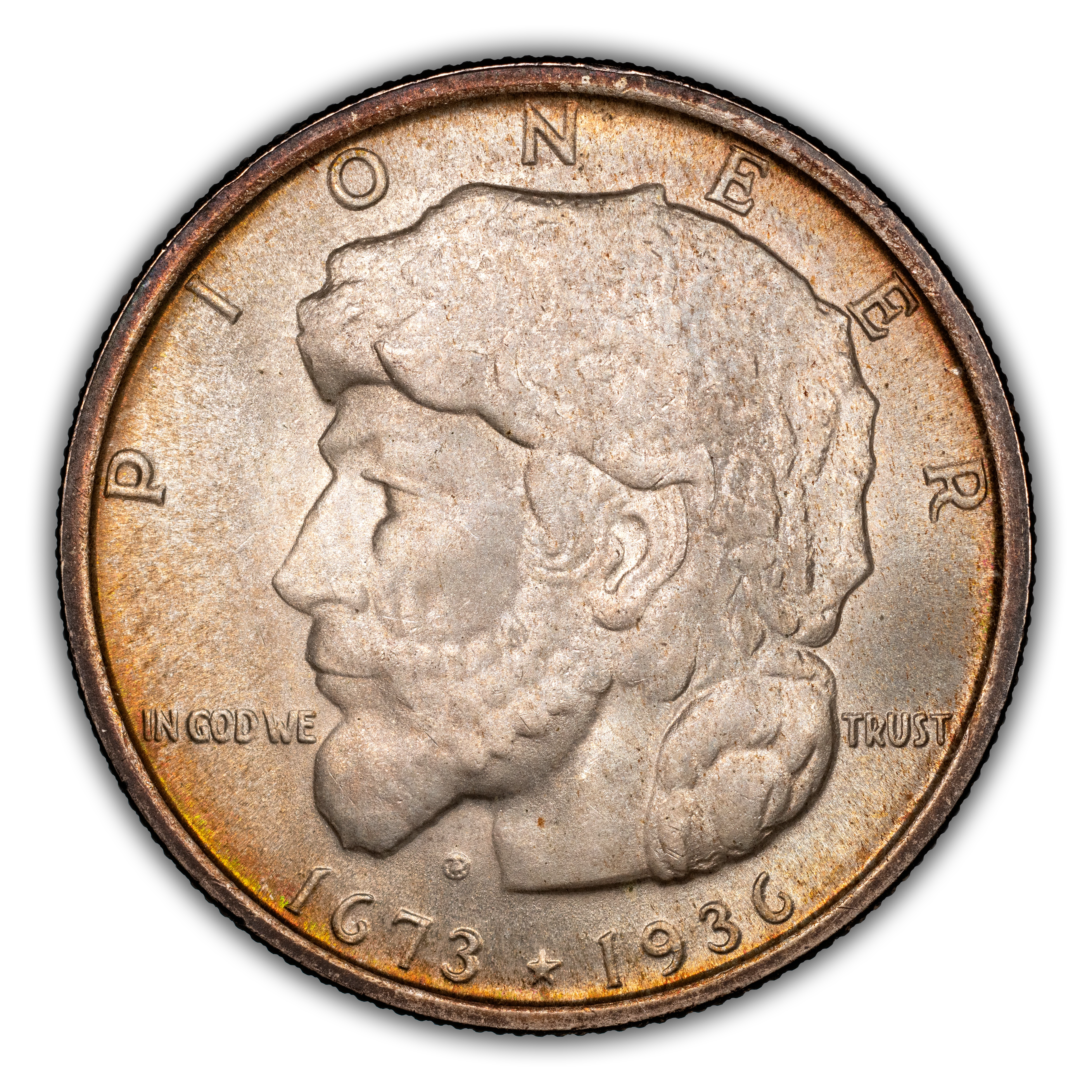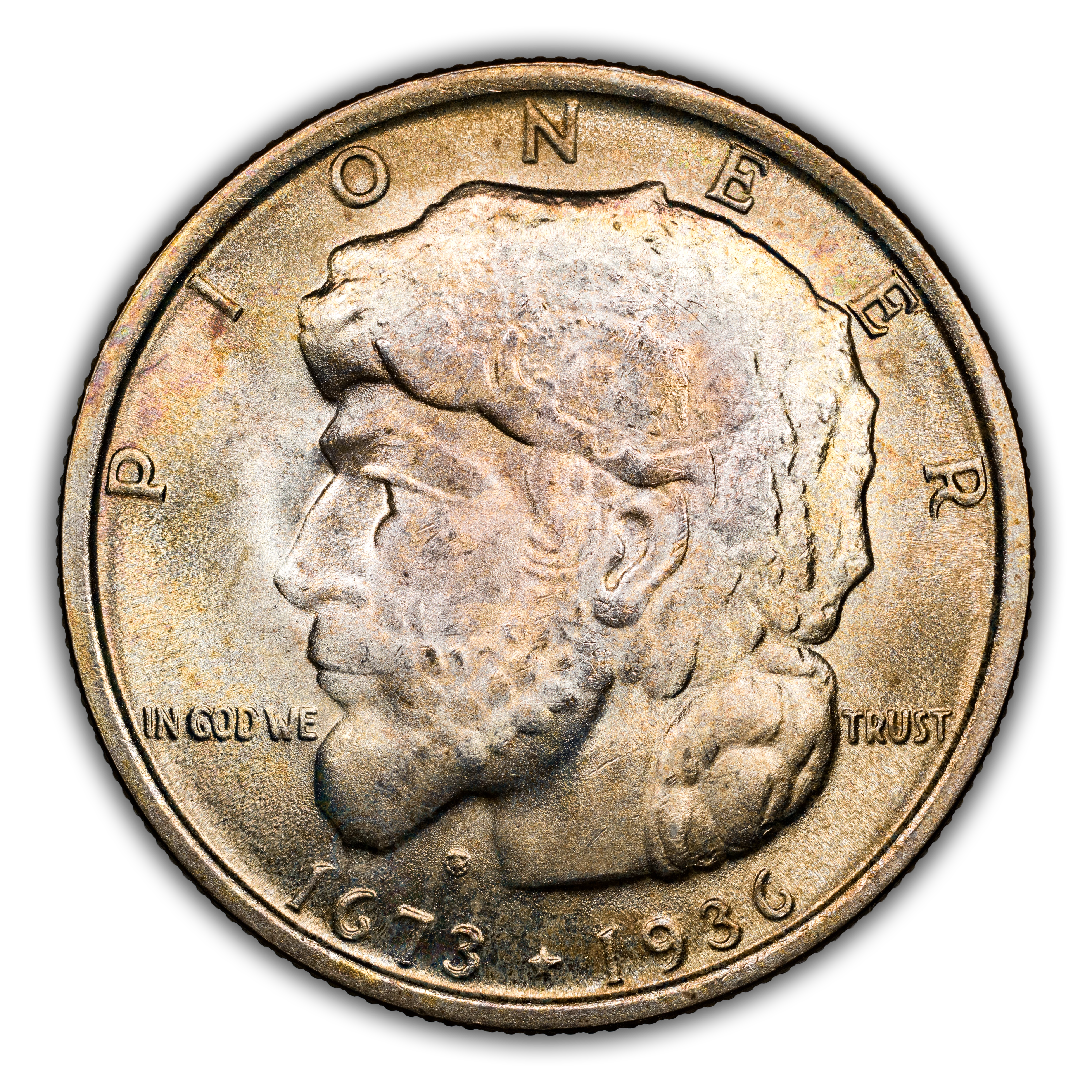 Arising during the most prolific year of new issues during the classic commemorative era, the 1936 Elgin half dollar honors the centennial of the moderately sized northern Illinois city. The coin, designed by Elgin sculptor and native Trygve A. Rovelstad, was issued to fund a memorial to local pioneer families. The obverse features the bust of a pioneer while the reverse depicts a pioneer family consisting of four adults and a baby.
