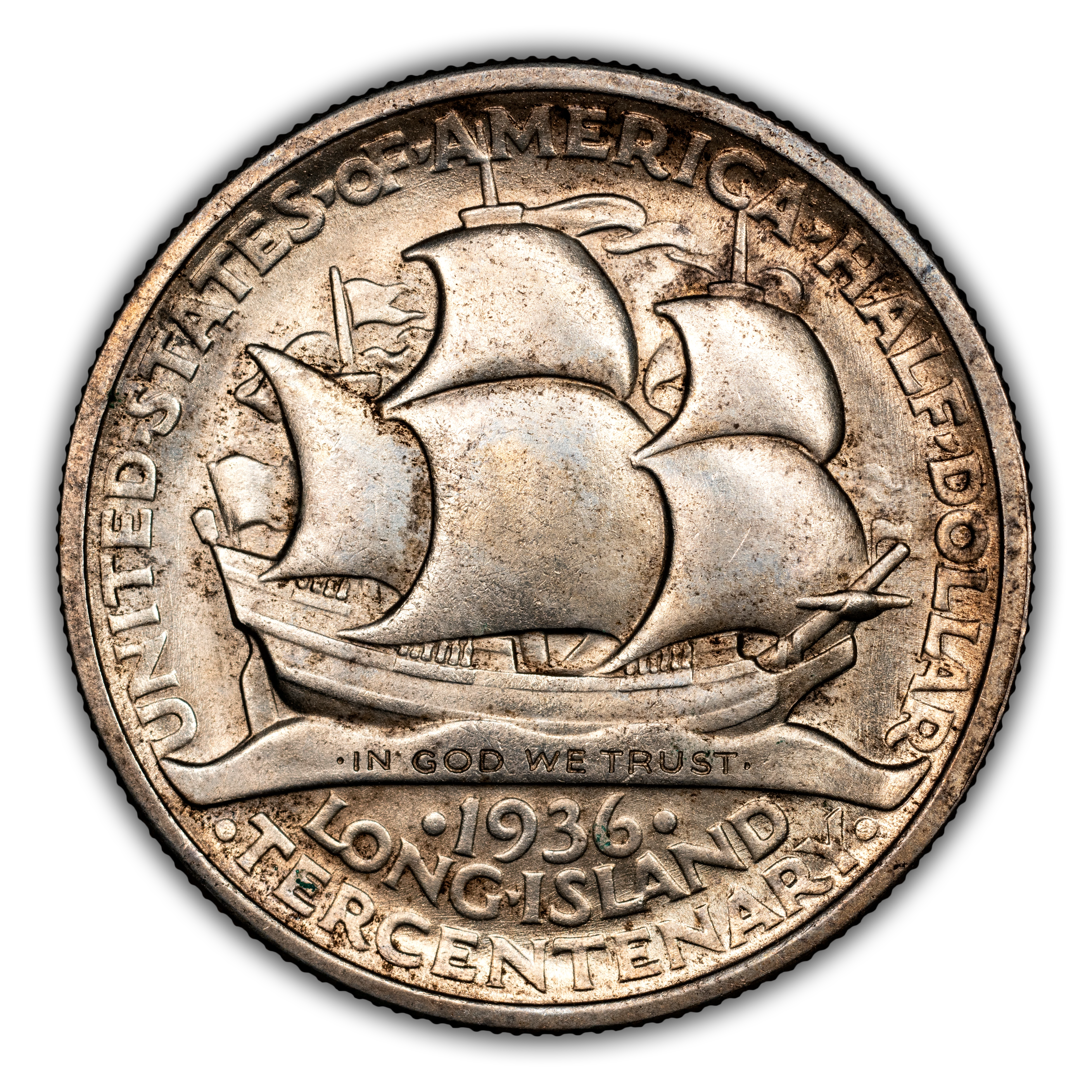 The Long Island Tercentenary, designed by Howard Kenneth Weinman, was issued during the height of the commemorative coin bonanza of the mid 1930s, a short but dizzying period when a dozen or more different commemoratives issued during any single year. More than 100,000 Long Island halves were struck and they were sold for $1 each. Hoards filtered into the marketplace into the 1960s, ensuring this coin remains relatively common in the industry even now.