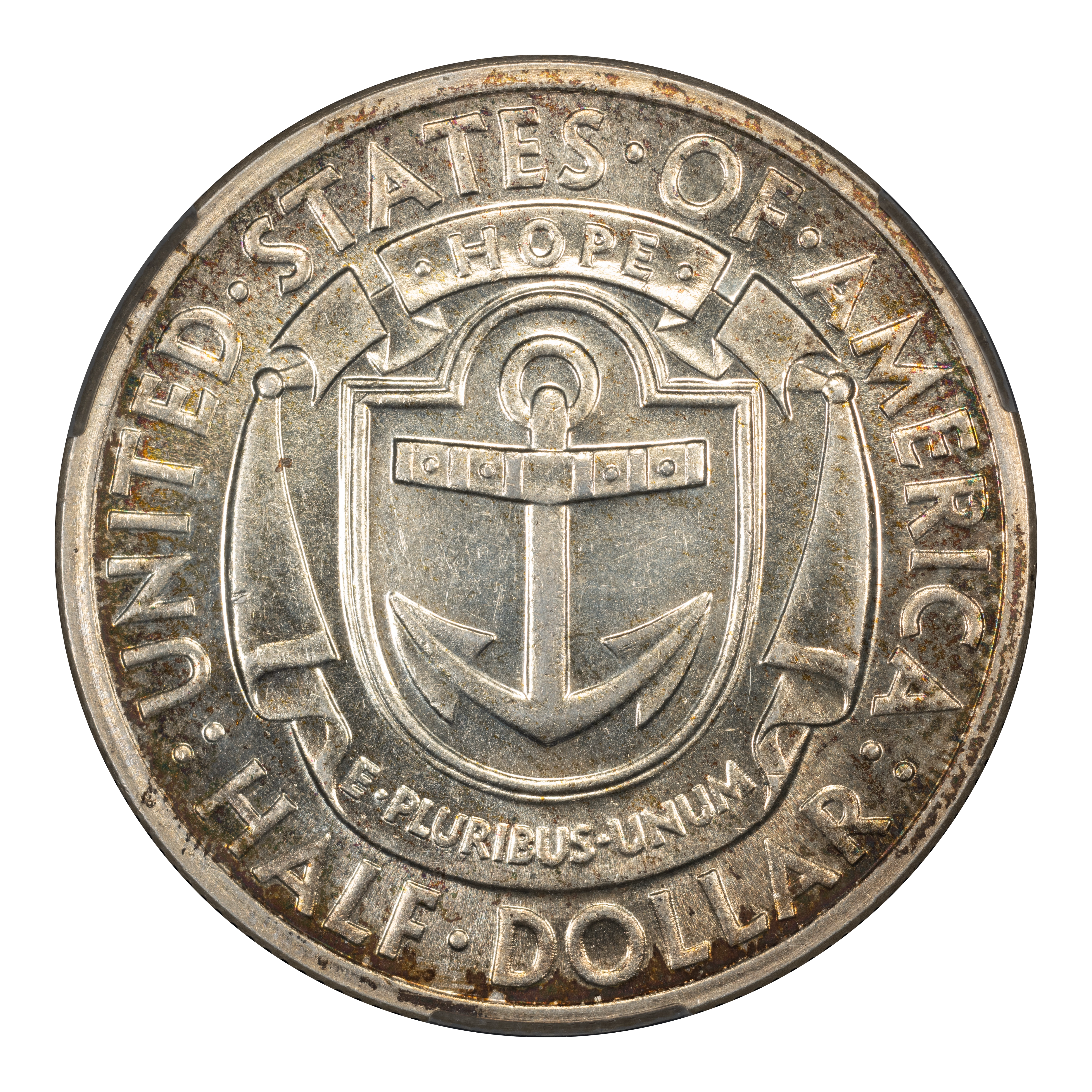 The Rhode Island half dollar was designed by Arthur Graham Carey and John Howard Benson and depicts a rather modernistic abstract obverse depiction of Roger Williams being greeted by a Native American upon arriving on his boat. The reverse features an anchor within a shield design carrying the word HOPE. The design is somewhat low relief with some broader flat surfaces, providing more numerous places for nicks and marks to become visible on the coin.