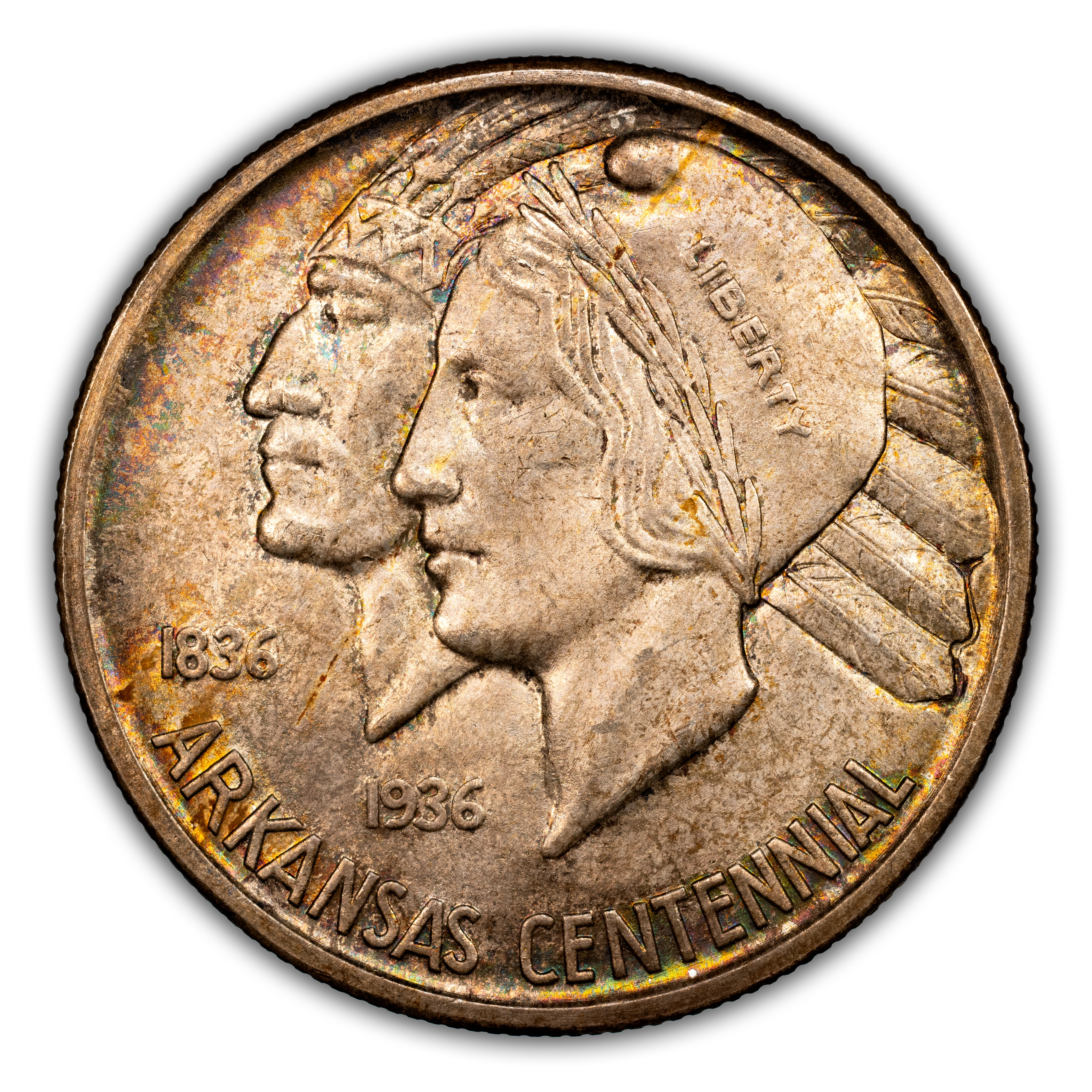 In 1936, the Arkansas halves sported two reverses. One features a jugate image of a Native American chief of 1836 and an American woman of 1935; the other was engraved by Henry Kreis and features then-current Arkansas Governor Joseph T. Robinson. Known as the Arkansas-Robinson half dollar, these half dollars were struck only in 1936 and with a total distribution of 25,265 pieces.