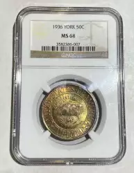 The 1936 Boone half dollars are among the most common of the five-year series, with the Philadelphia issue boasting the largest mintage of all 1936 Boone halves (they were also struck at the Denver and San Francisco Mints). These pieces are widely available in the grades of MS62-66, though they are rare in MS67 levels or higher. Most possess decent to beautiful luster and color and overall nice eye appeal.
