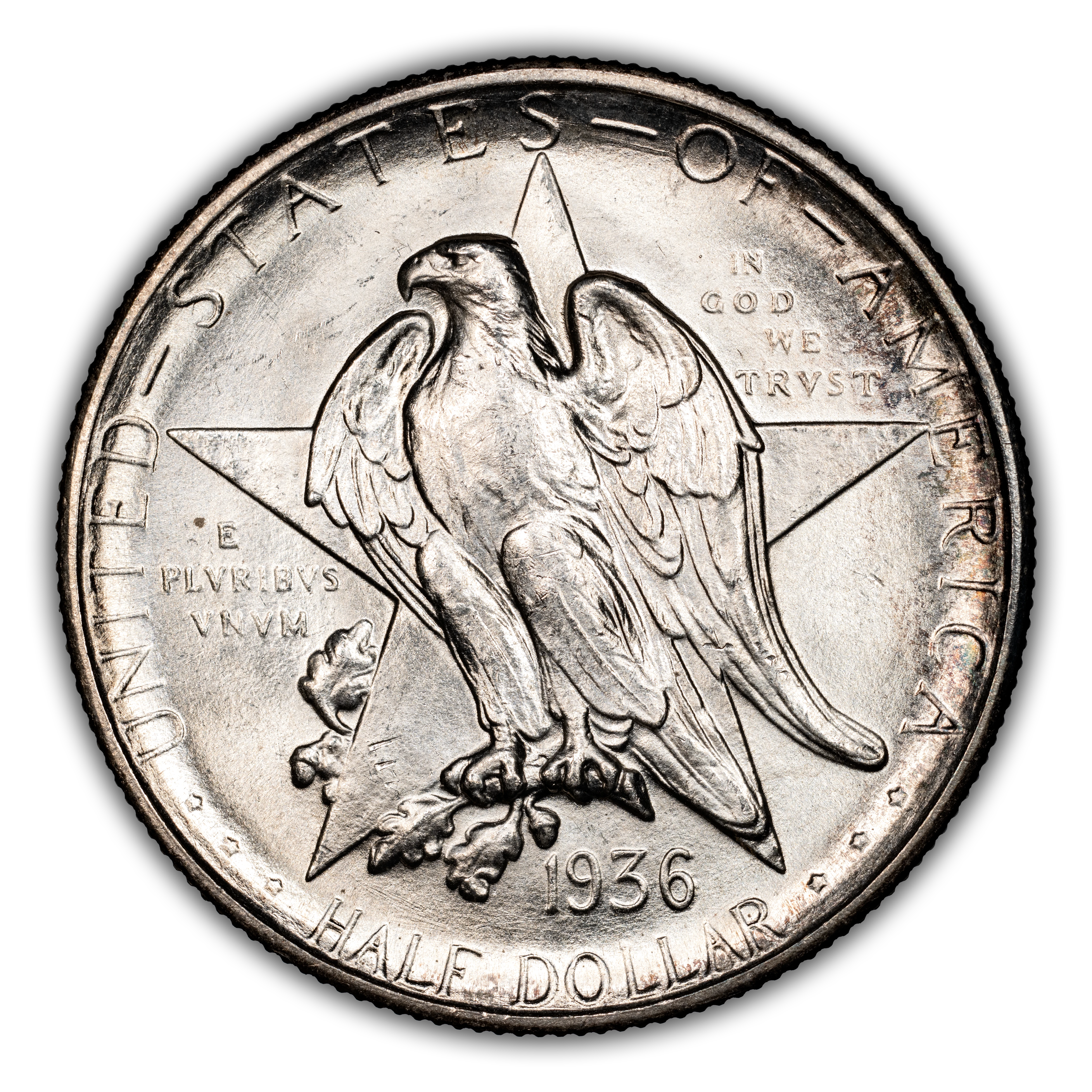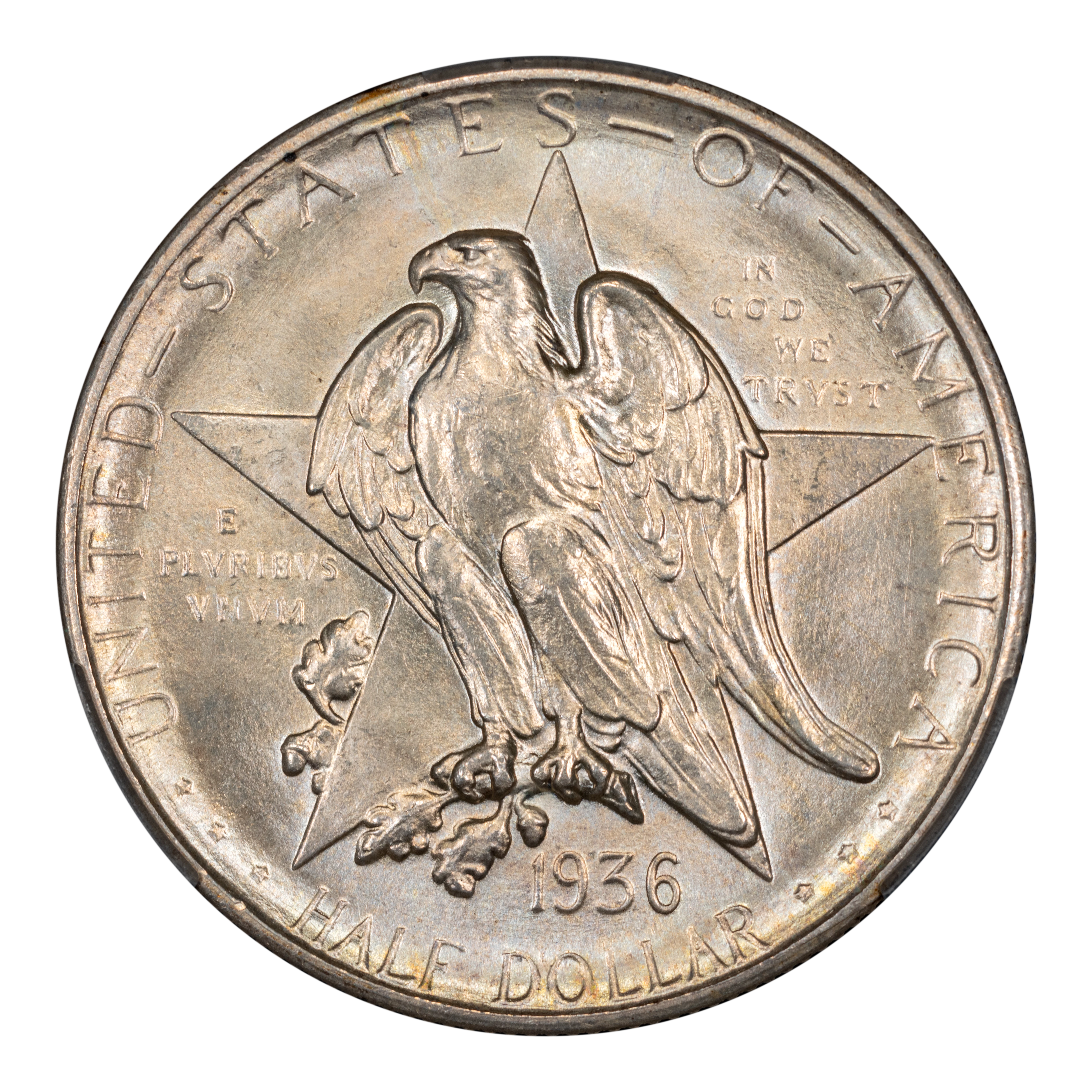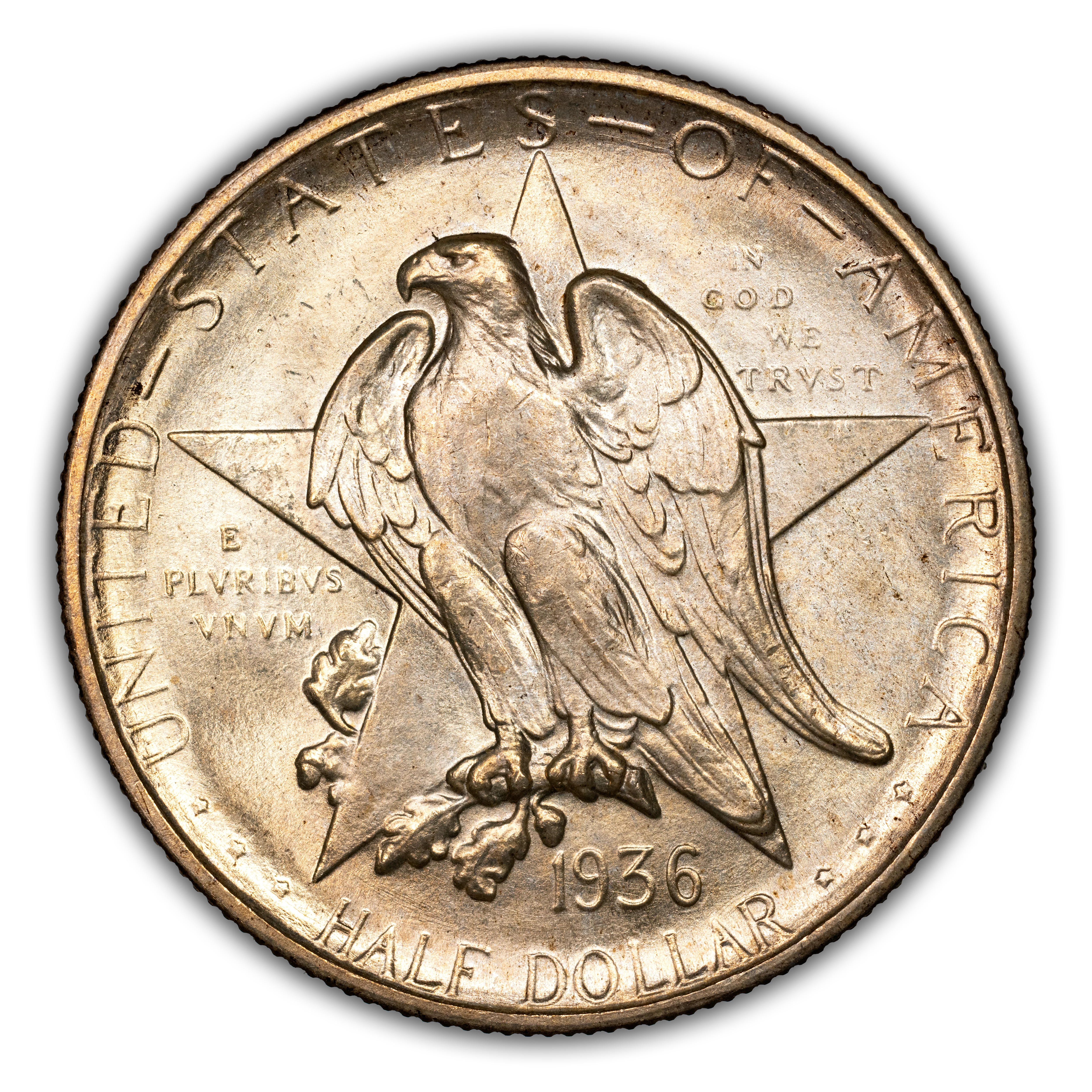 The 1936 Texas half dollars mark the third annual installment of this commemorative type, which was struck from 1934 through 1938. The coin, honoring the 100th anniversary of Texas independence from Mexico in 1836, was designed by Pompeo Coppini. It features on its obverse an eagle and five-pointed star, while the reverse showcases -- variety of elements, including the goddess Victory, the Alamo, and two cameo busts of Texas founders General Sam Houston and Stephen Austin. The coin was issued for $1.50, and most were saved in uncirculated condition.