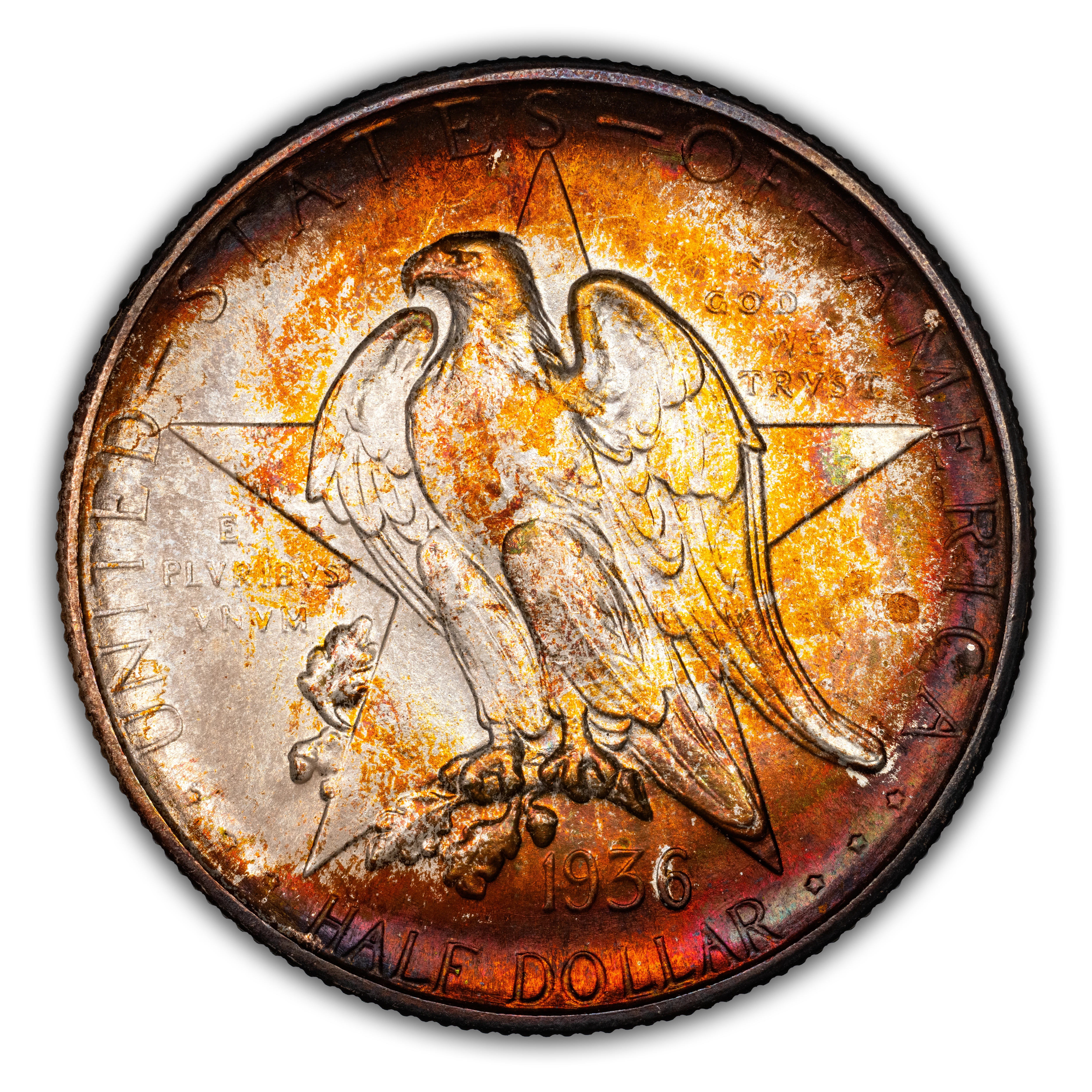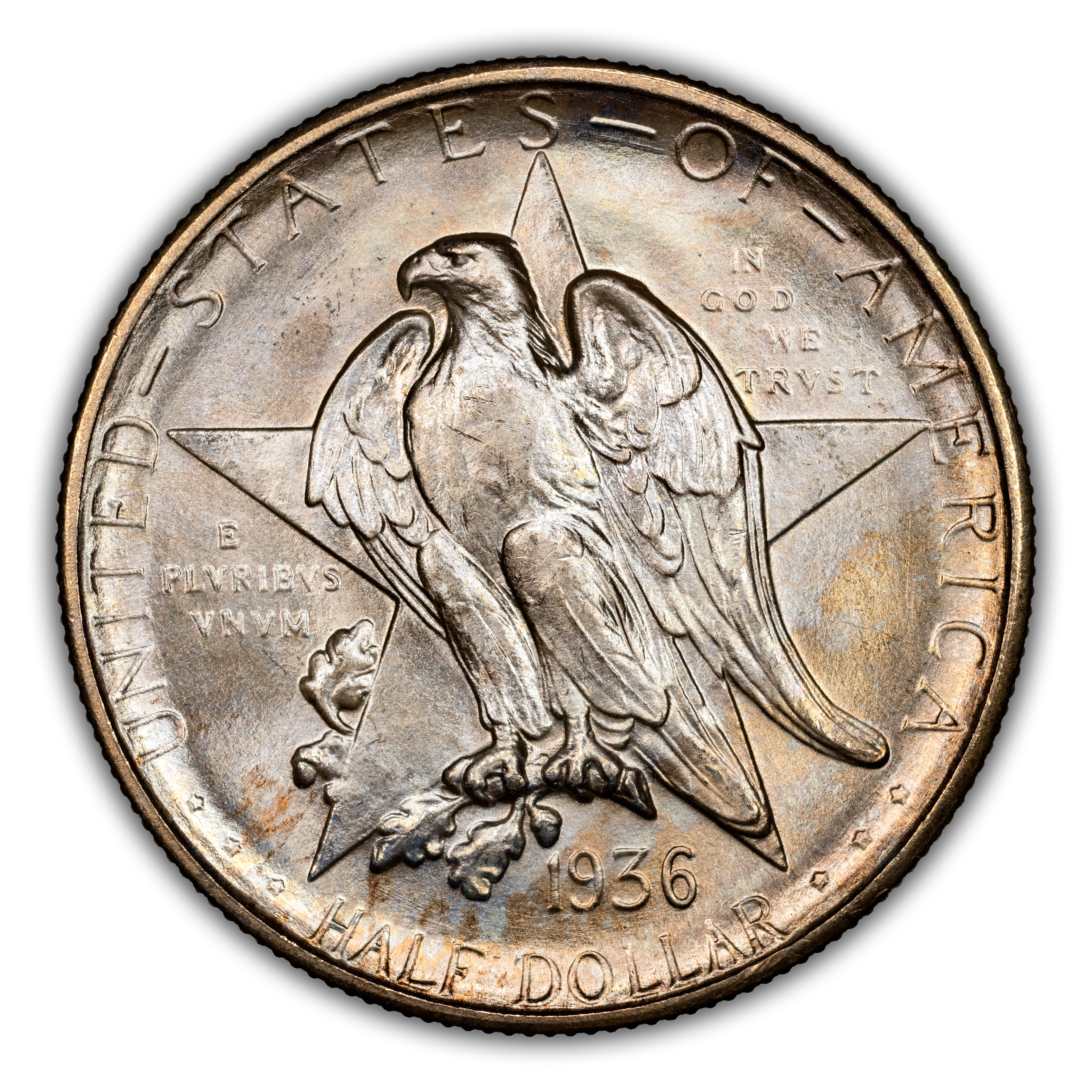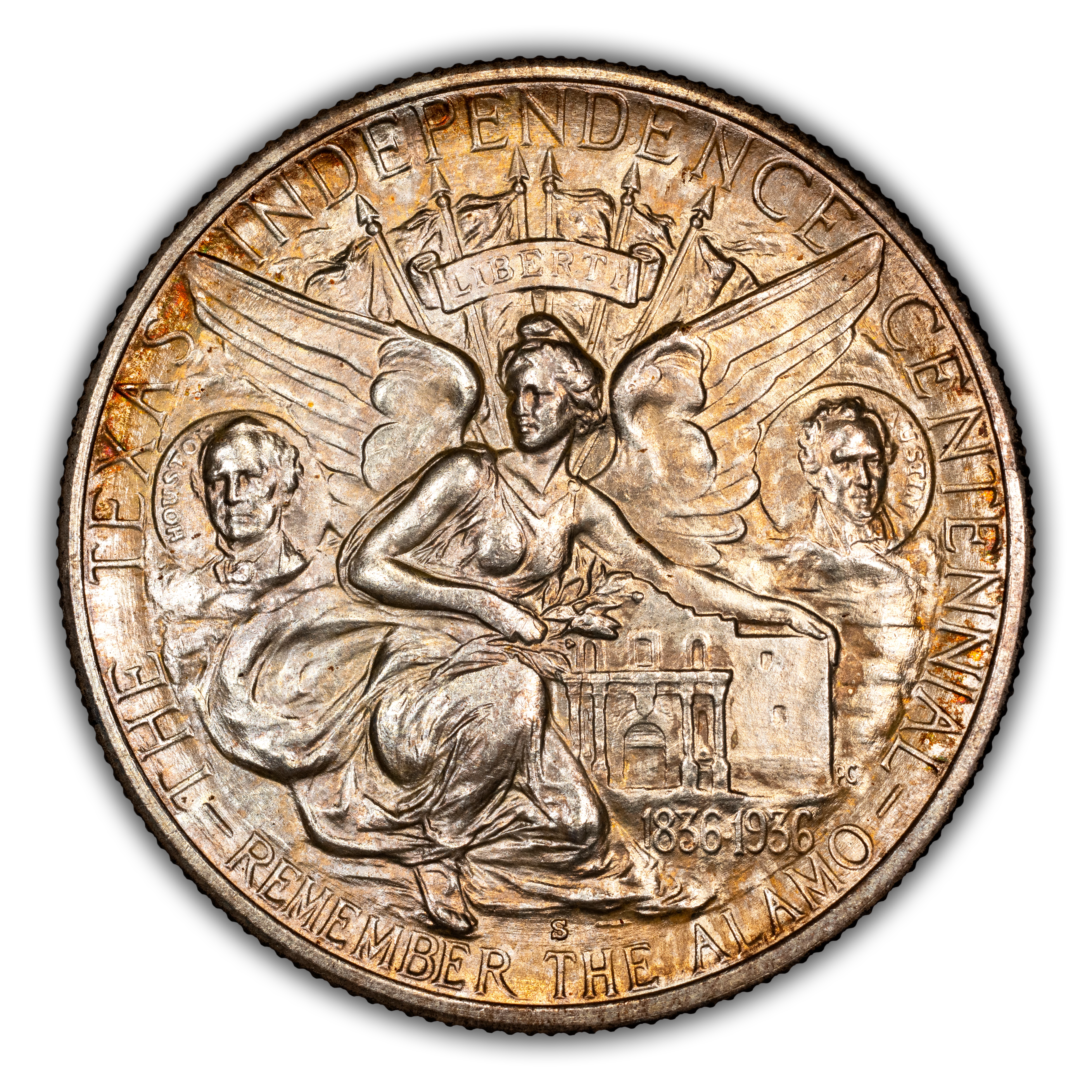 The 1936 Texas half dollars mark the third annual installment of this commemorative type, which was struck from 1934 through 1938. The coin, honoring the 100th anniversary of Texas independence from Mexico in 1836, was designed by Pompeo Coppini. It features on its obverse an eagle and five-pointed star, while the reverse showcases -- variety of elements, including the goddess Victory, the Alamo, and two cameo busts of Texas founders General Sam Houston and Stephen Austin. The coin was issued for $1.50, and most were saved in uncirculated condition.