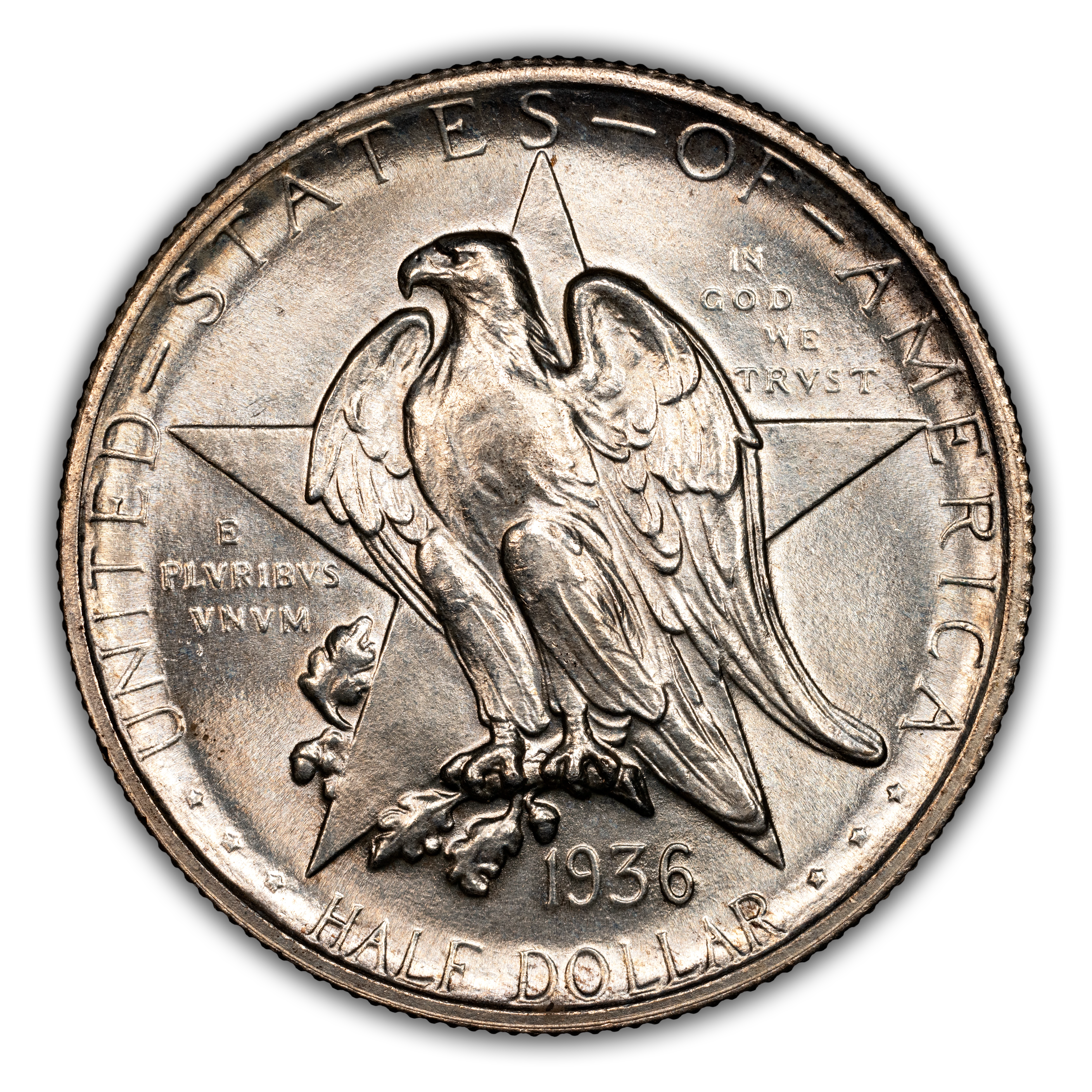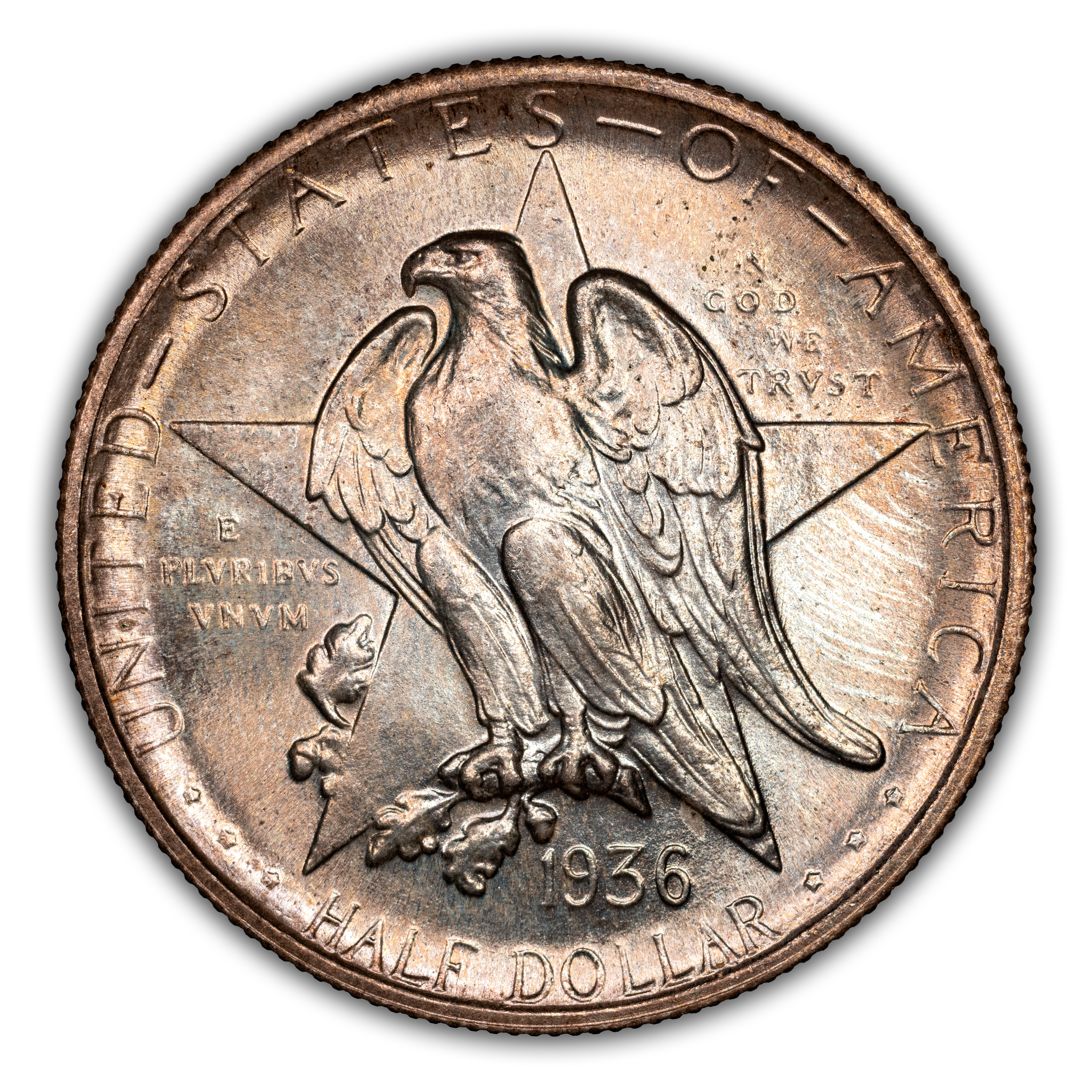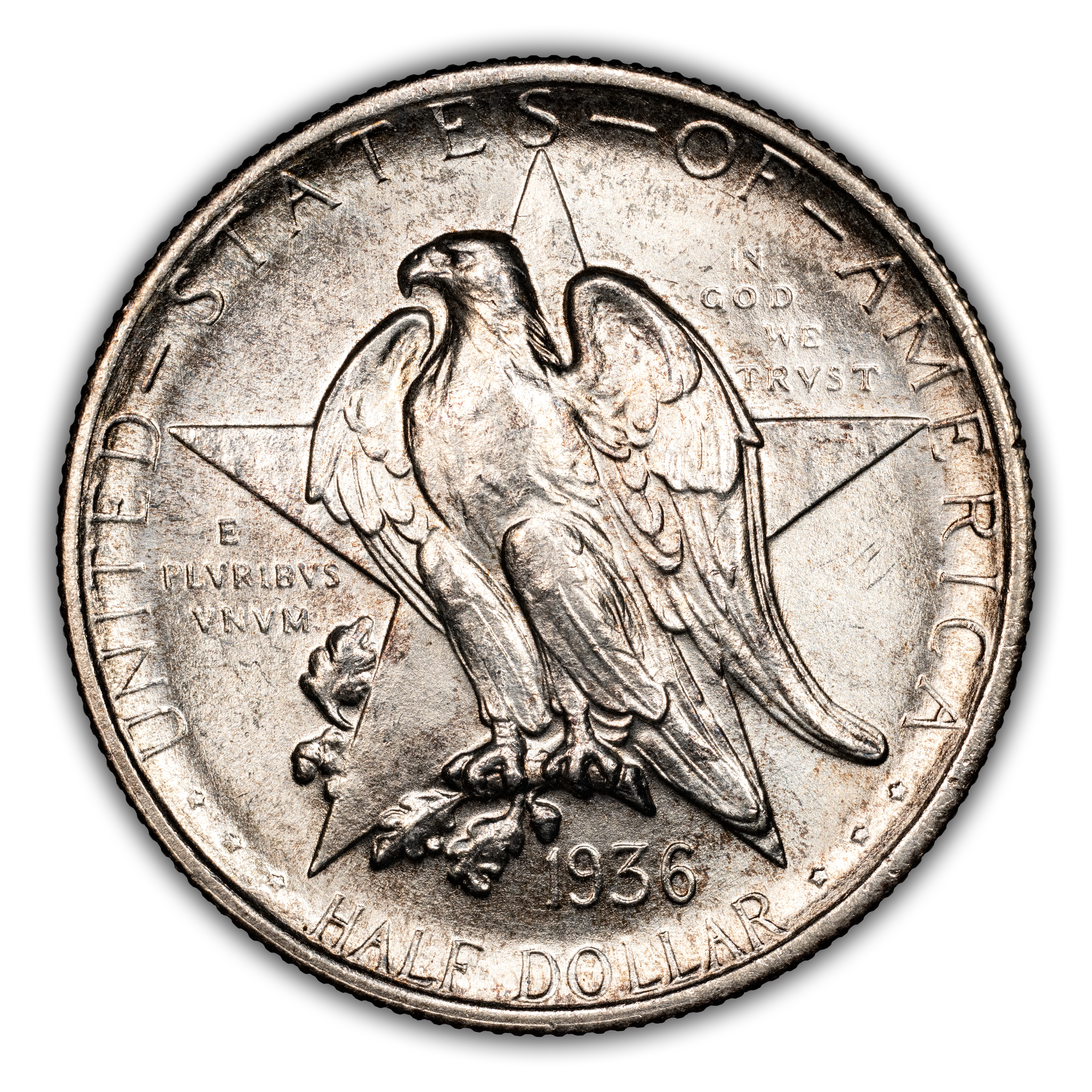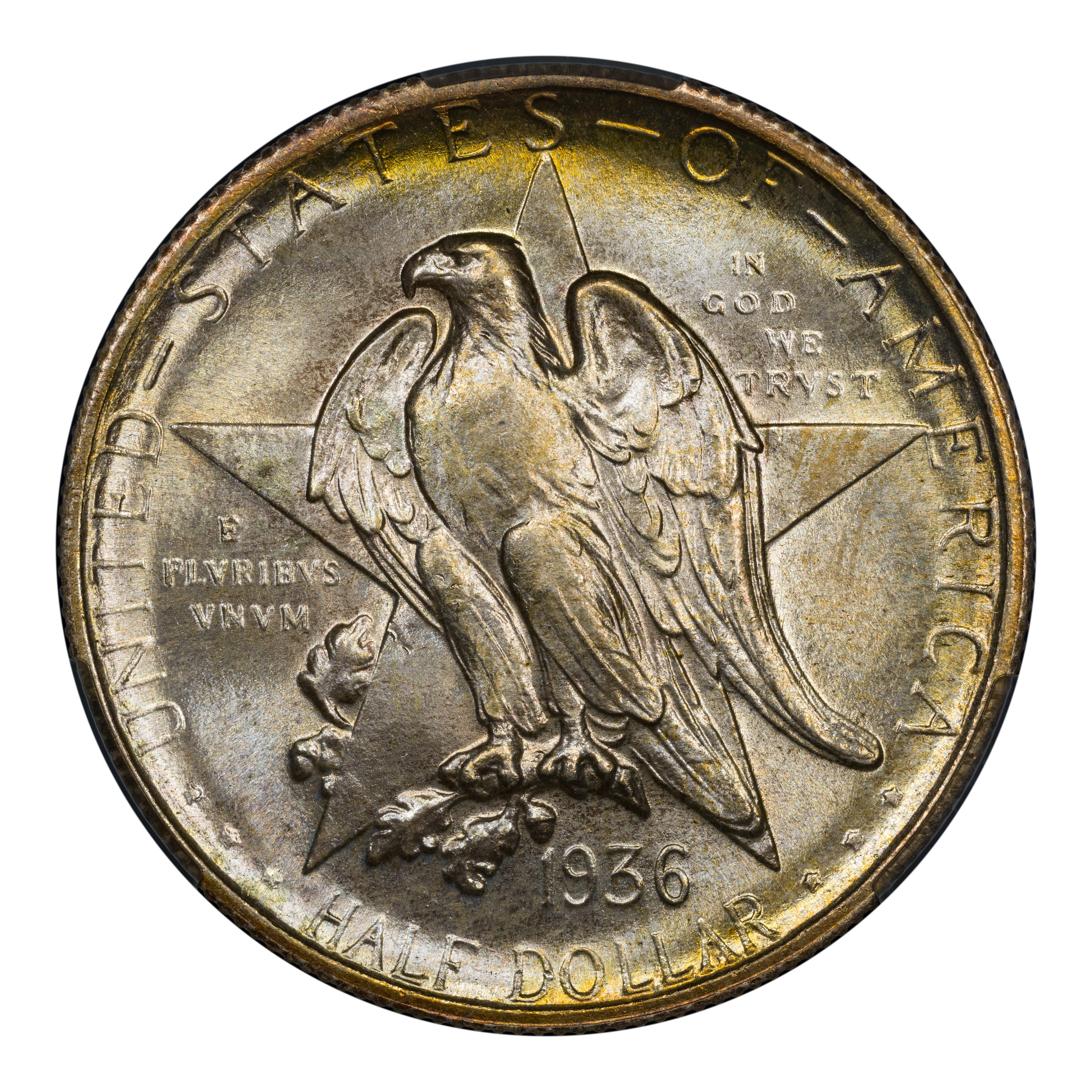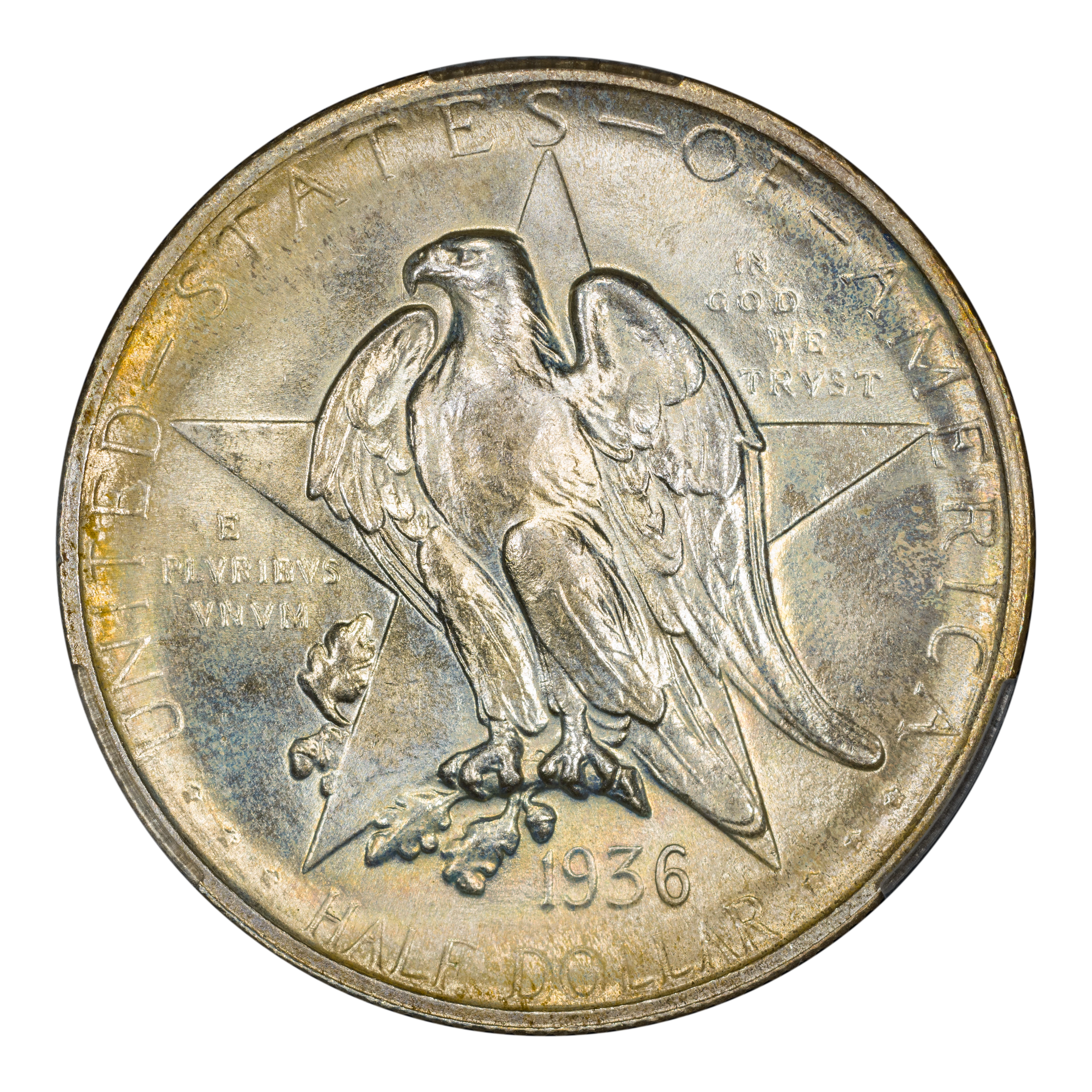 The 1936 Texas half dollars mark the third annual installment of this commemorative type, which was struck from 1934 through 1938. The coin, honoring the 100th anniversary of Texas independence from Mexico in 1836, was designed by Pompeo Coppini. It features on its obverse an eagle and five-pointed star, while the reverse showcases -- variety of elements, including the goddess Victory, the Alamo, and two cameo busts of Texas founders General Sam Houston and Stephen Austin. The coin was issued for $1.50, and most were saved in uncirculated condition.
