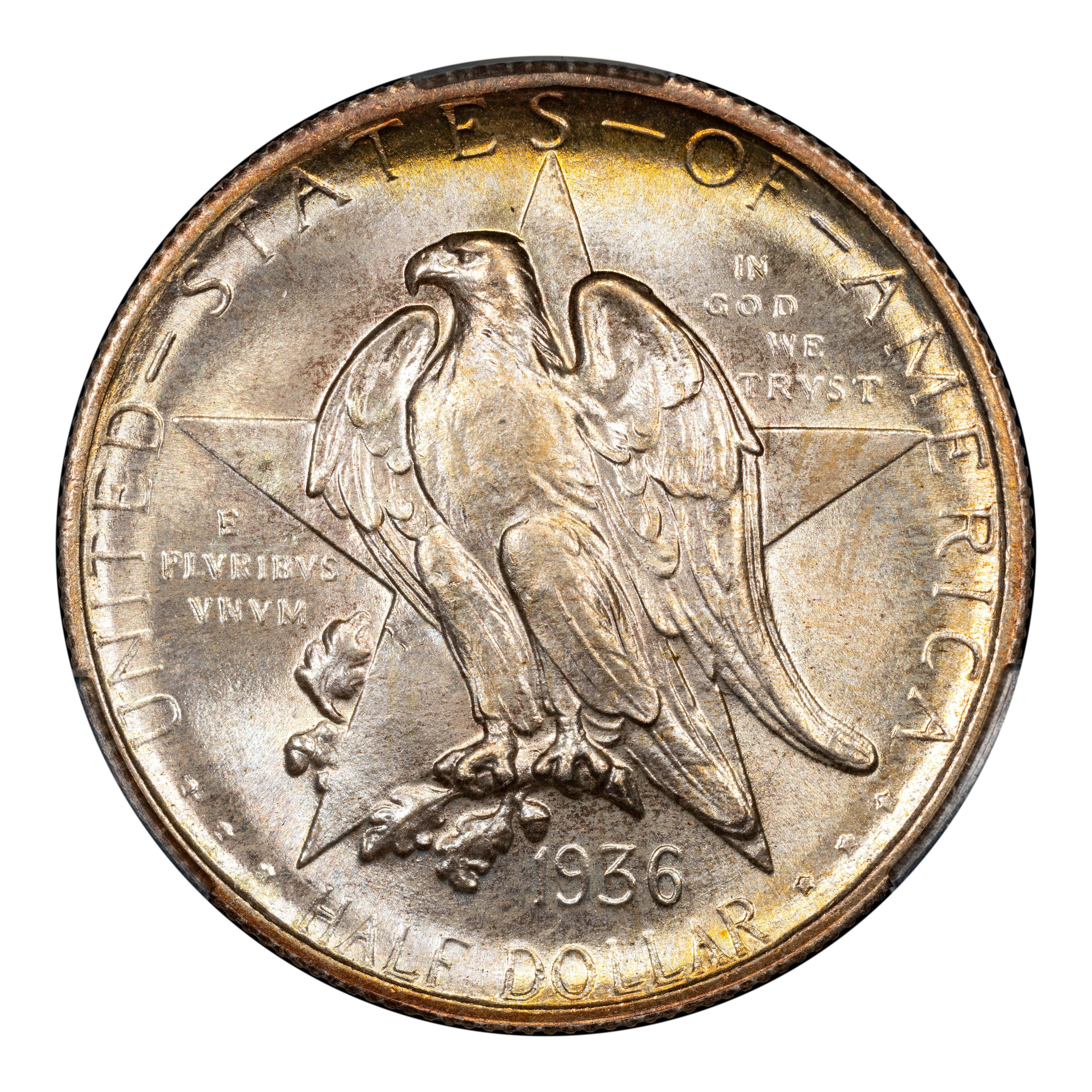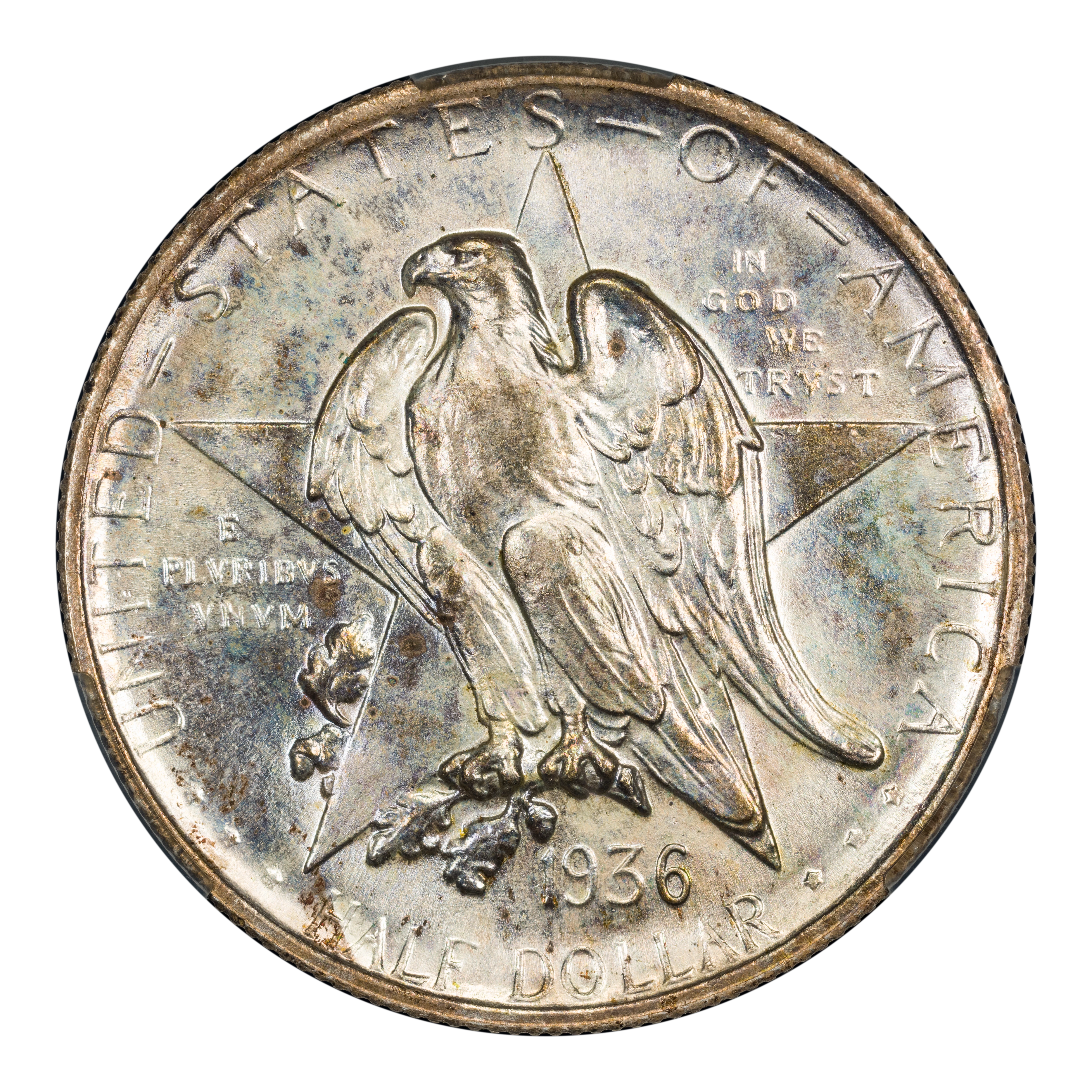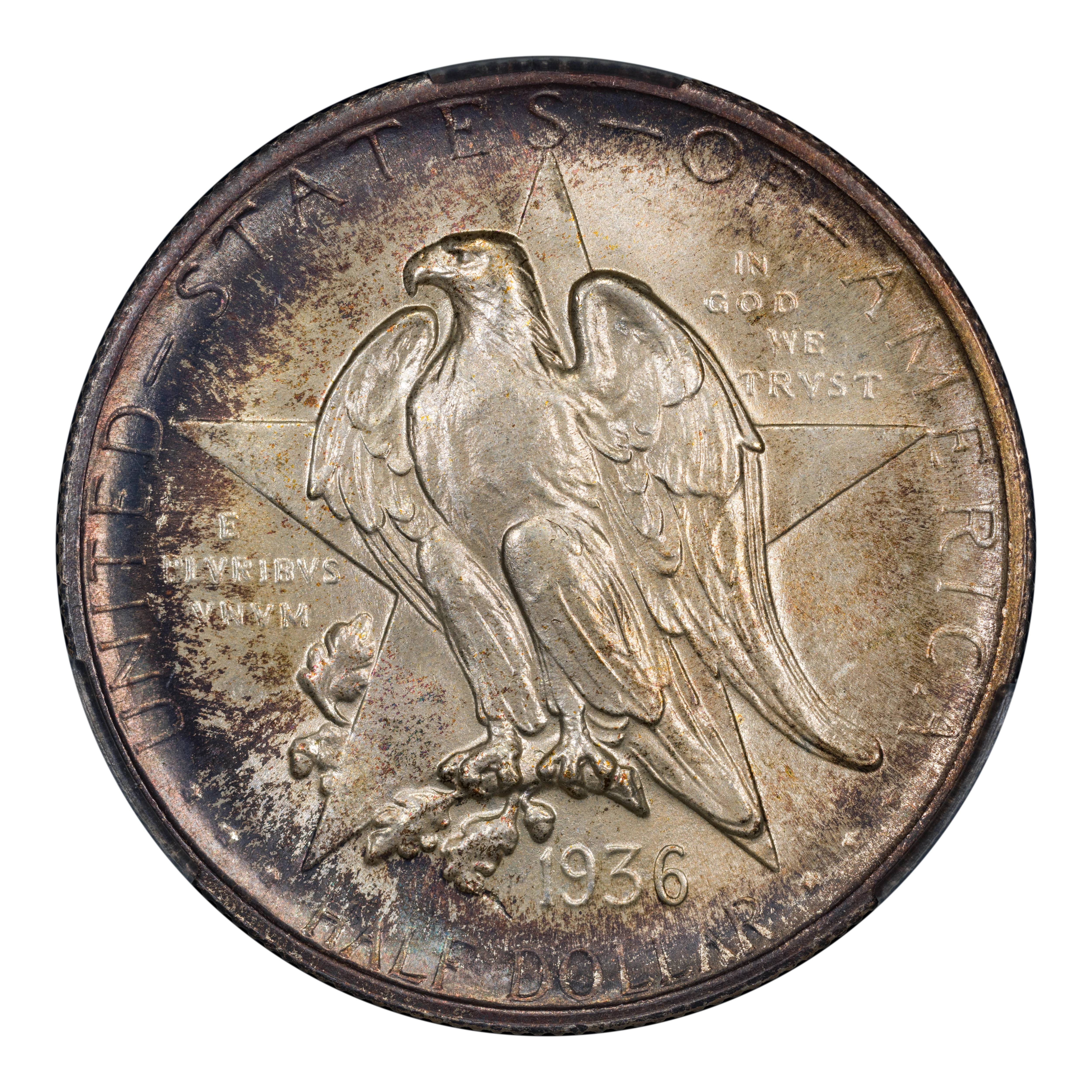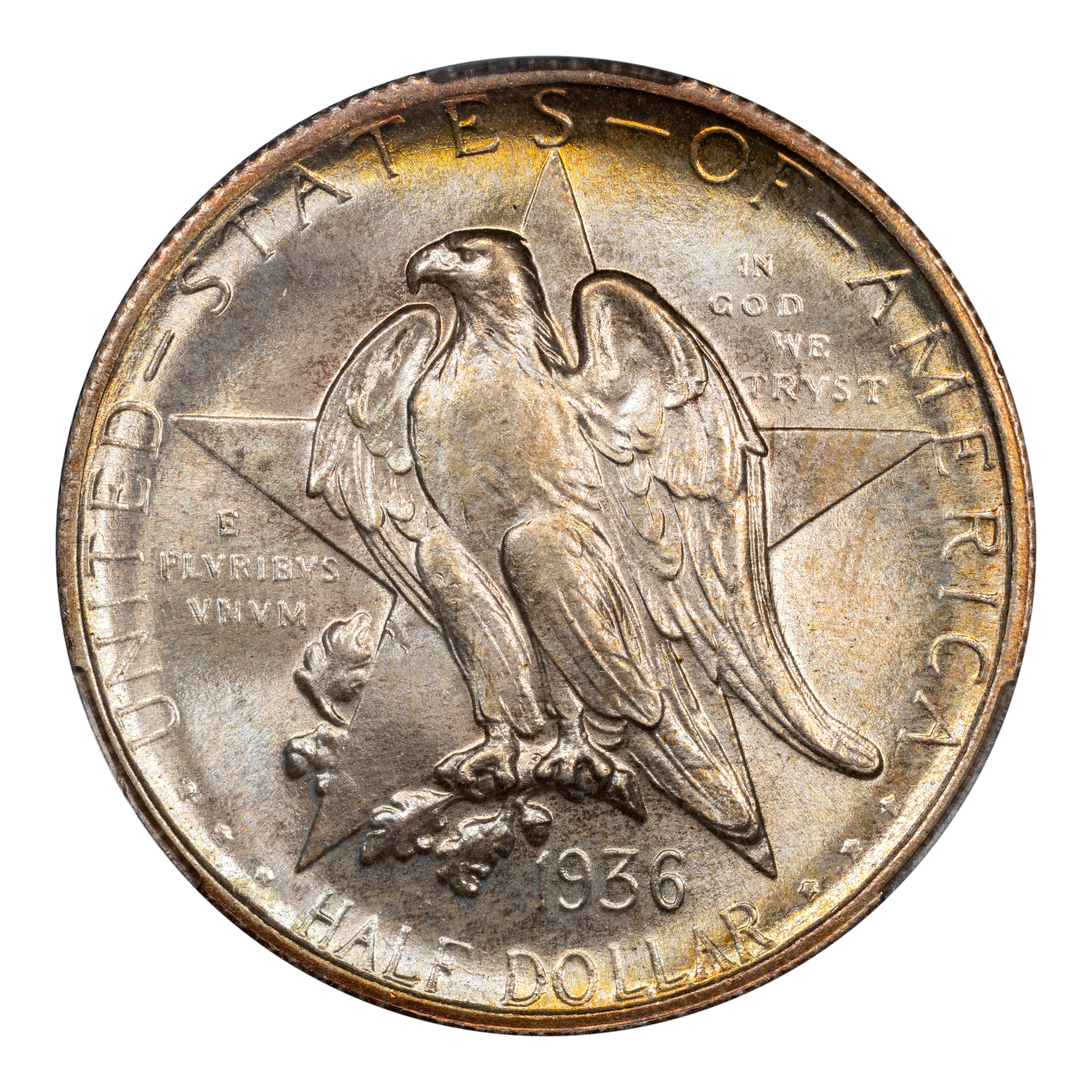 The 1936 Texas half dollars mark the third annual installment of this commemorative type, which was struck from 1934 through 1938. The coin, honoring the 100th anniversary of Texas independence from Mexico in 1836, was designed by Pompeo Coppini. It features on its obverse an eagle and five-pointed star, while the reverse showcases -- variety of elements, including the goddess Victory, the Alamo, and two cameo busts of Texas founders General Sam Houston and Stephen Austin. The coin was issued for $1.50, and most were saved in uncirculated condition.