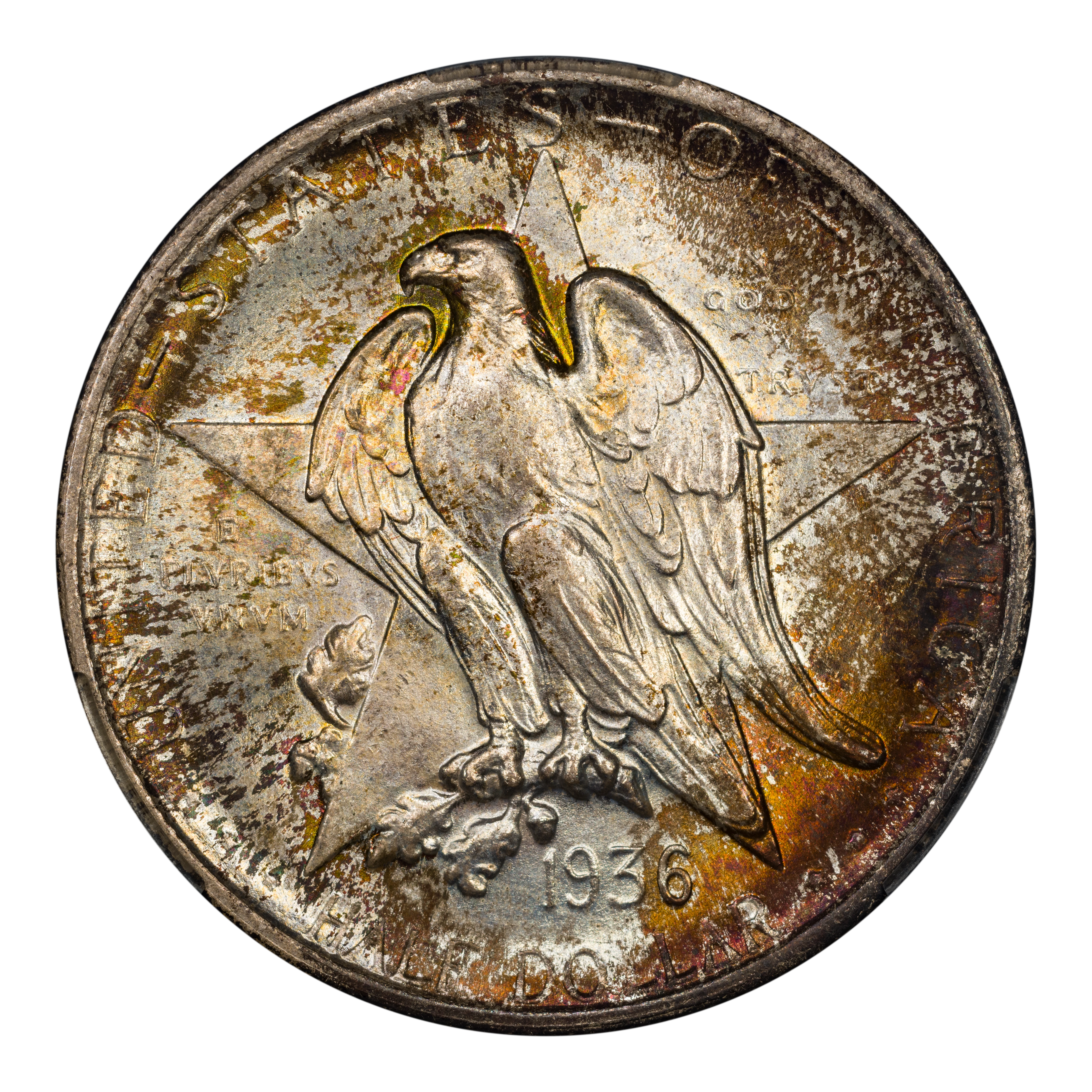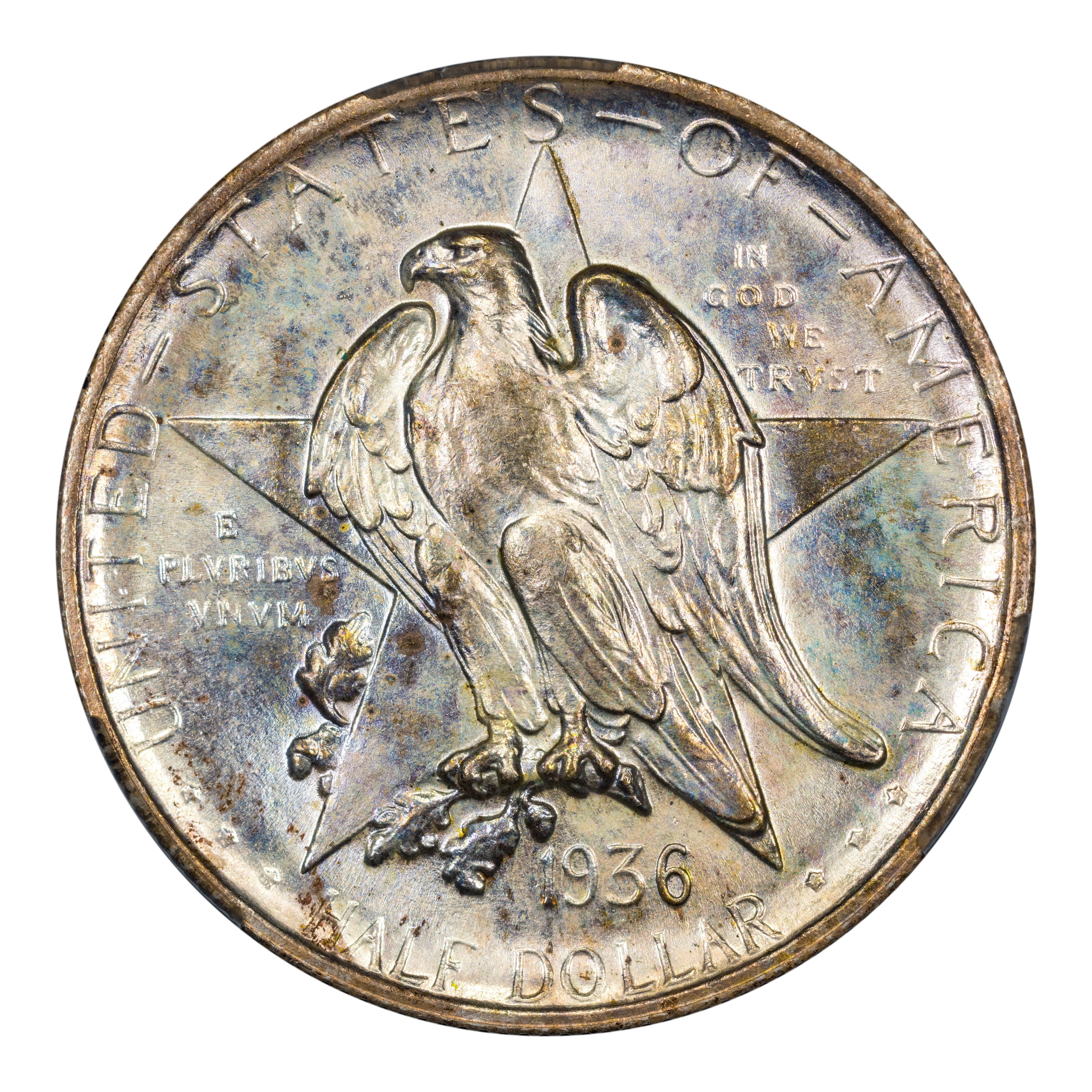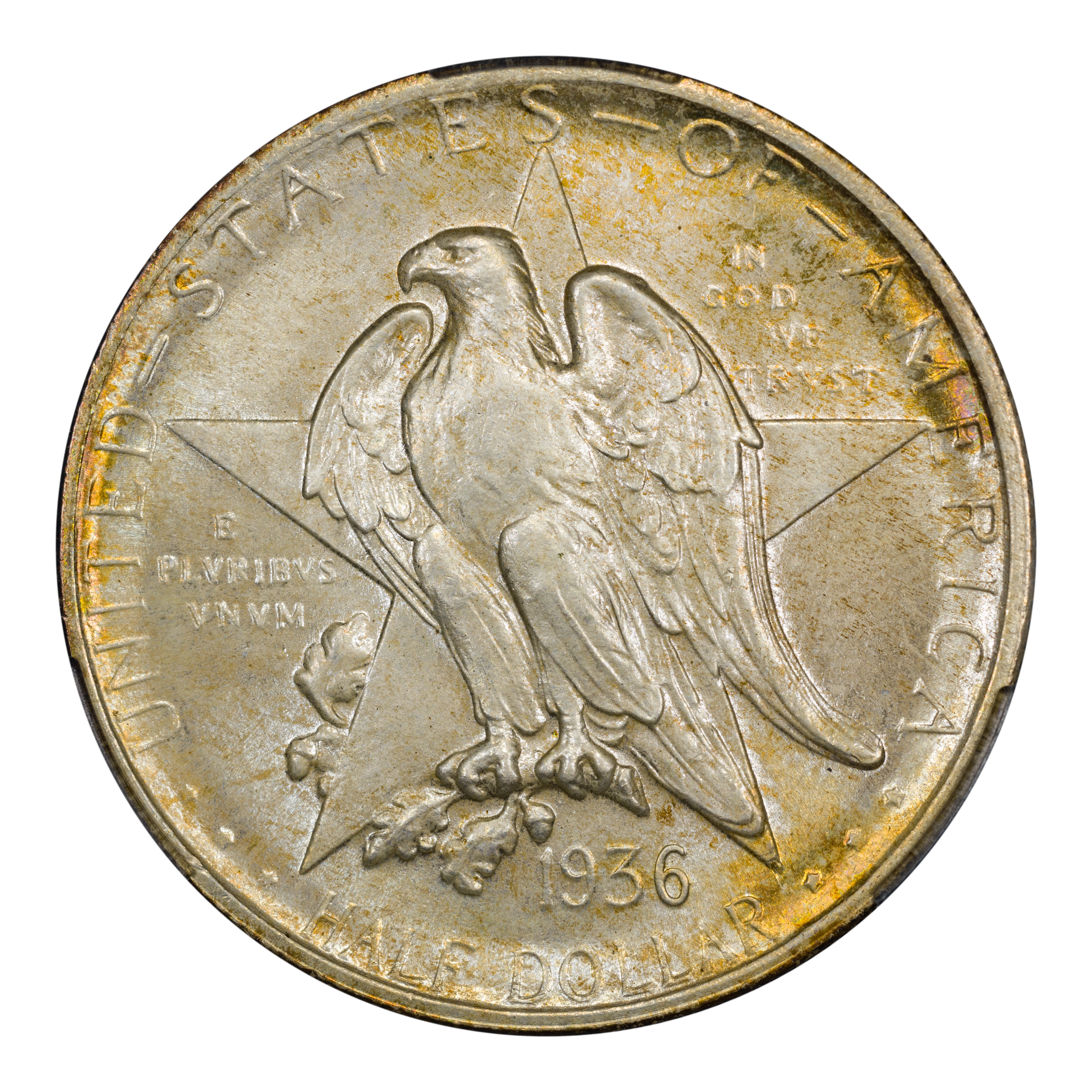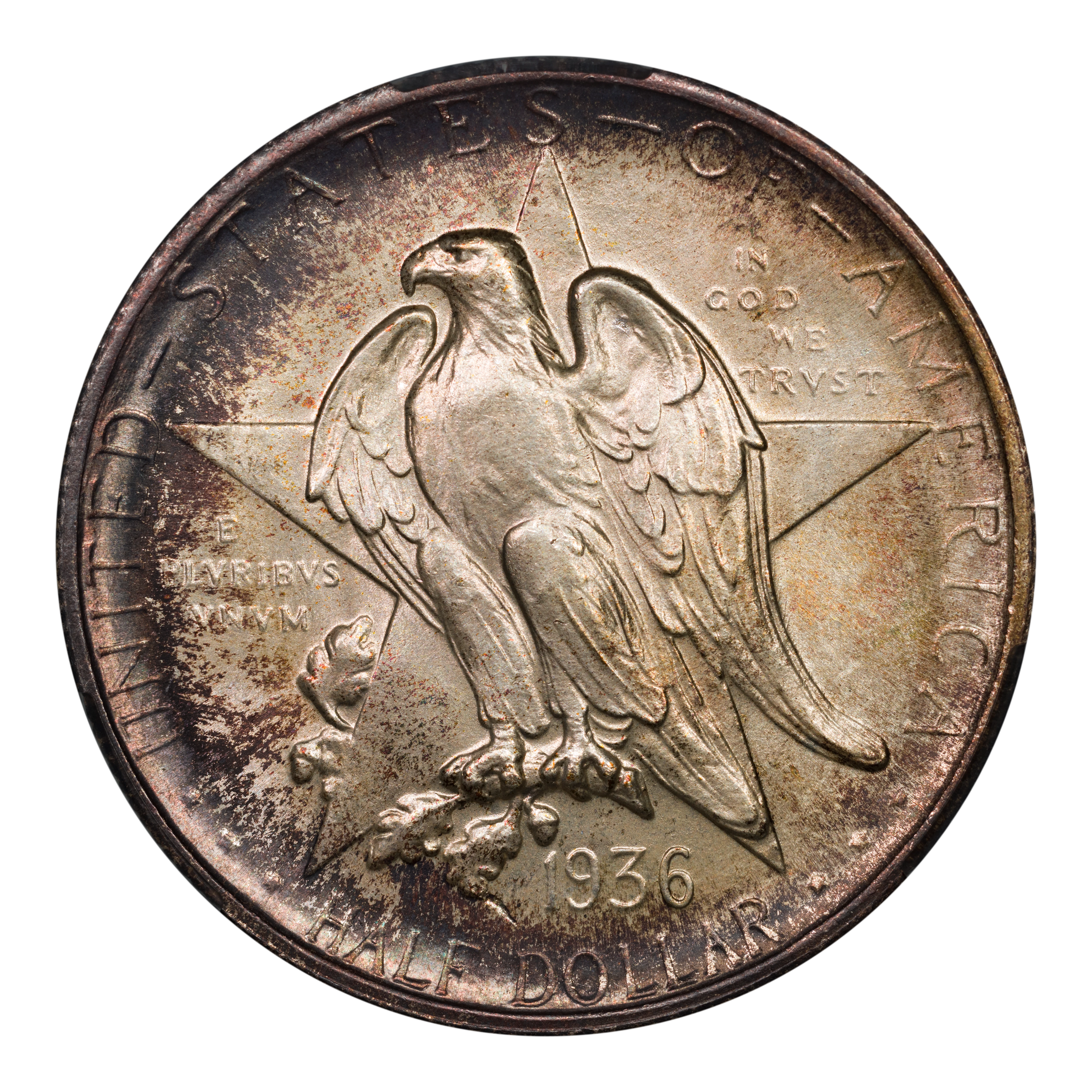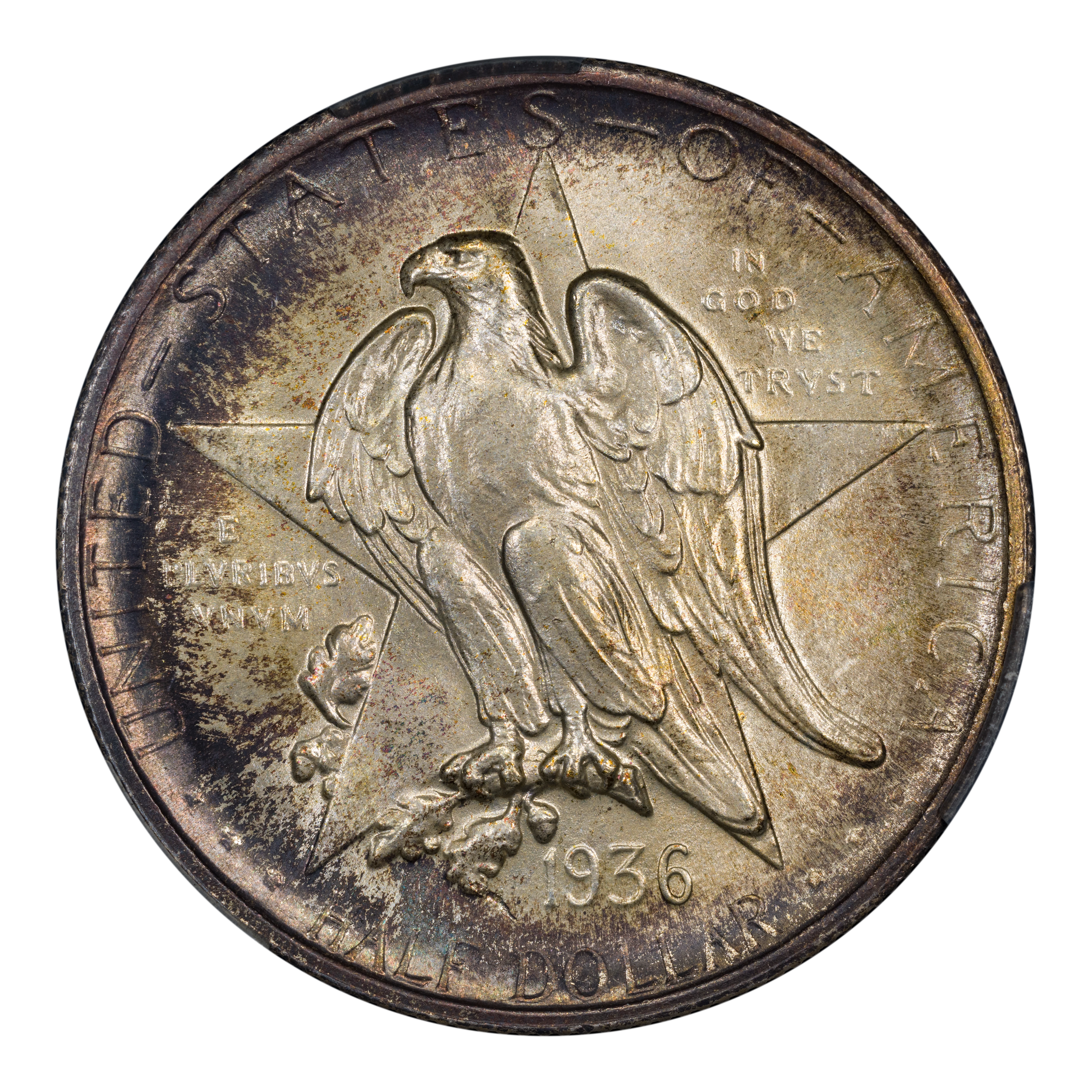 The 1936 Texas half dollars mark the third annual installment of this commemorative type, which was struck from 1934 through 1938. The coin, honoring the 100th anniversary of Texas independence from Mexico in 1836, was designed by Pompeo Coppini. It features on its obverse an eagle and five-pointed star, while the reverse showcases -- variety of elements, including the goddess Victory, the Alamo, and two cameo busts of Texas founders General Sam Houston and Stephen Austin. The coin was issued for $1.50, and most were saved in uncirculated condition.