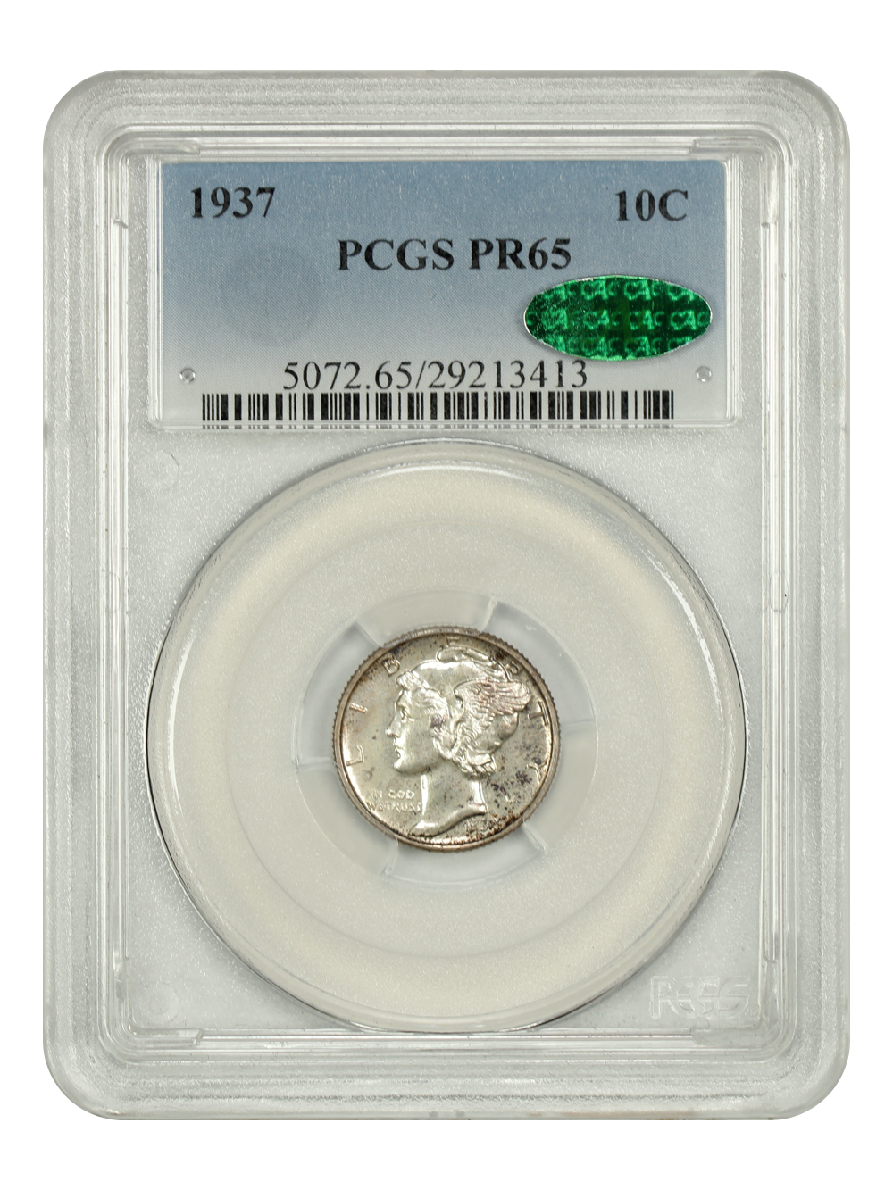 <B>1937 10C PR67 PCGS. CAC.</B></I> CAC: 204 in 67, 8 finer (10/25). CDN: $660 Whsle. Bid for NGC/PCGS PR67. Mintage 5,756. ...