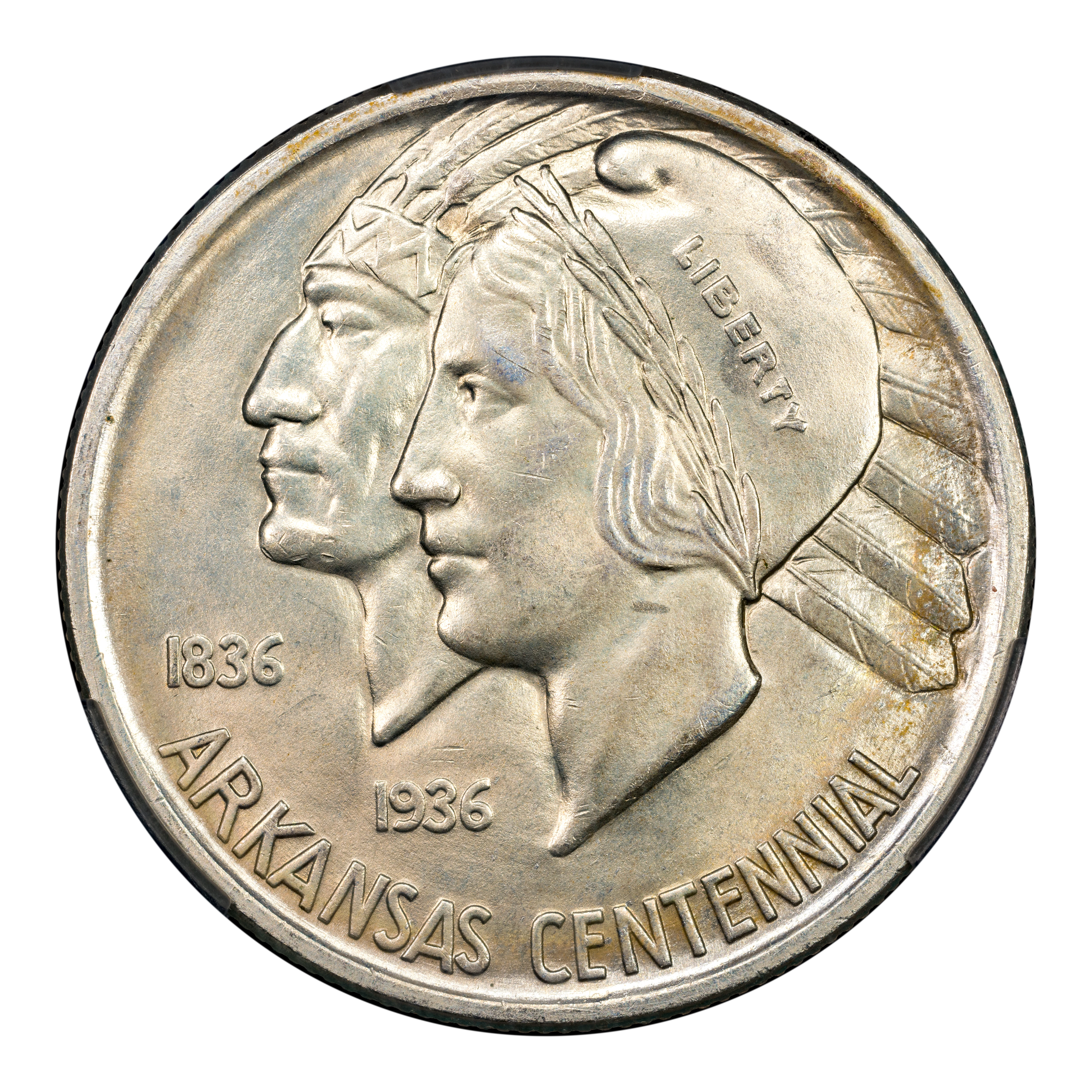 Obverse: A double portrait of Liberty and Native American Chieftain with the words ARKANSAS CENTENNIAL at the bottom periphery.