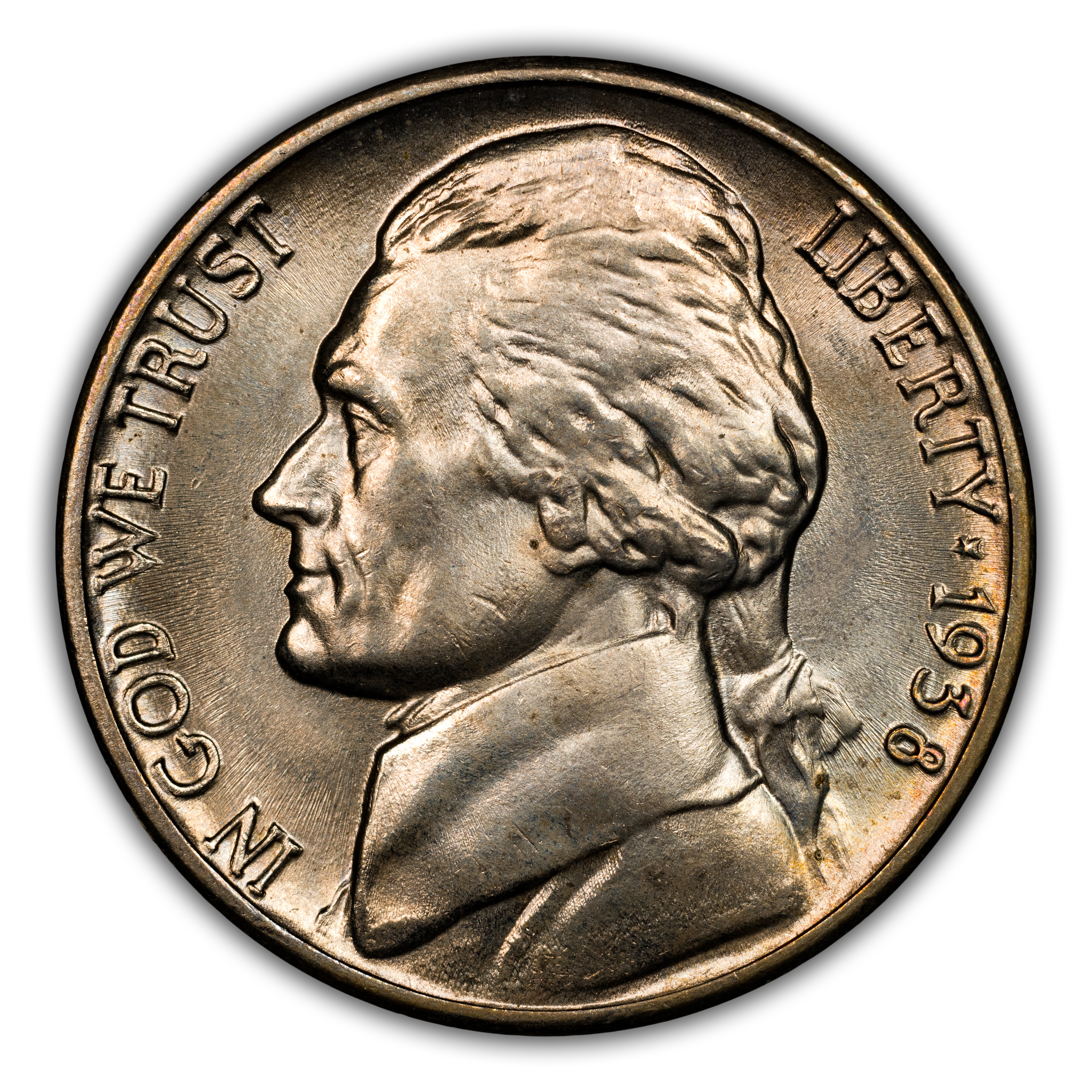 Reverse: The Jefferson home is prominently centered with the name MONTICELLO captioned below. The denomination FIVE CENTS is spelled out in half circle underneath and the words E PLURIBUS UNUM and UNITED STATES OF AMERICA appear at the top and bottom periphery.