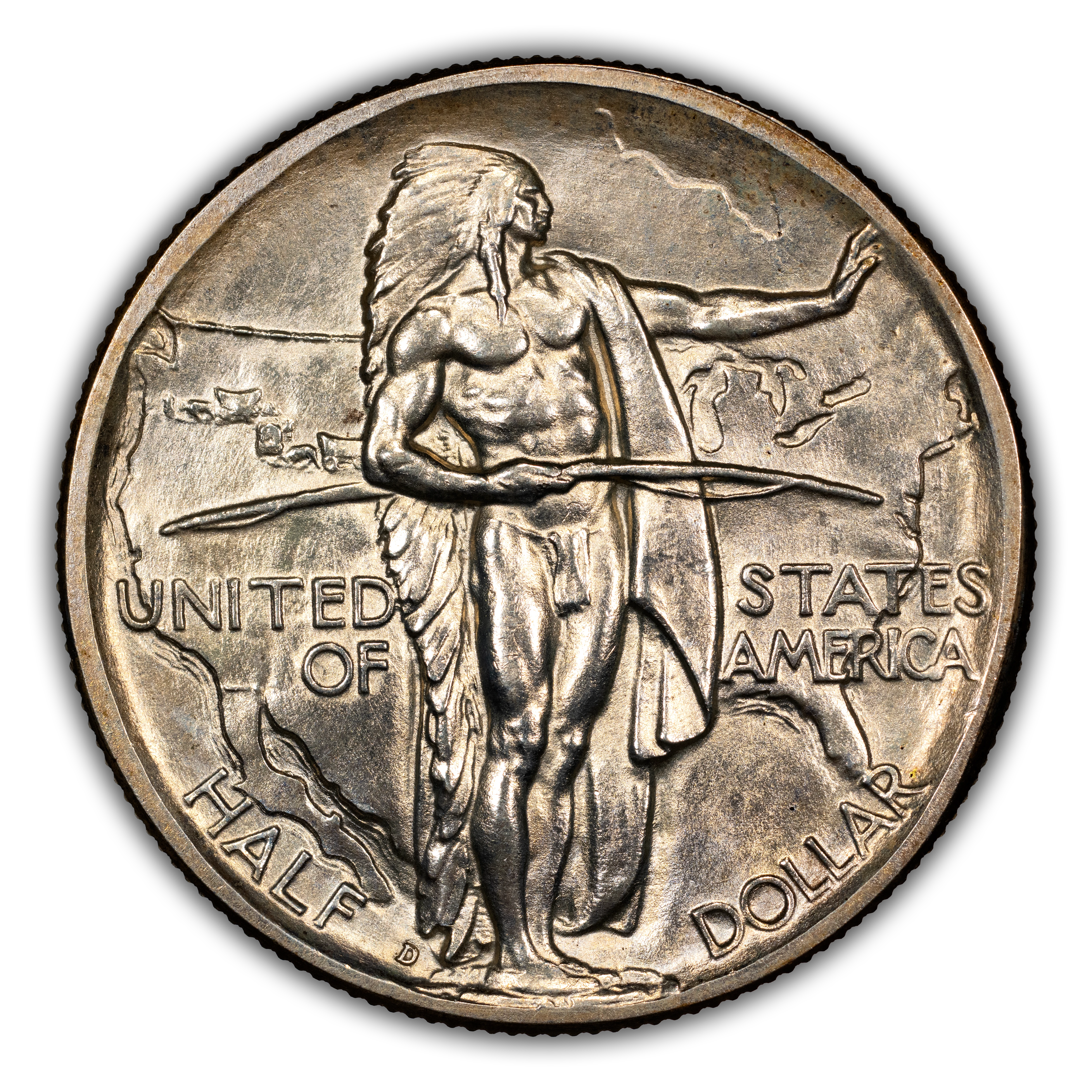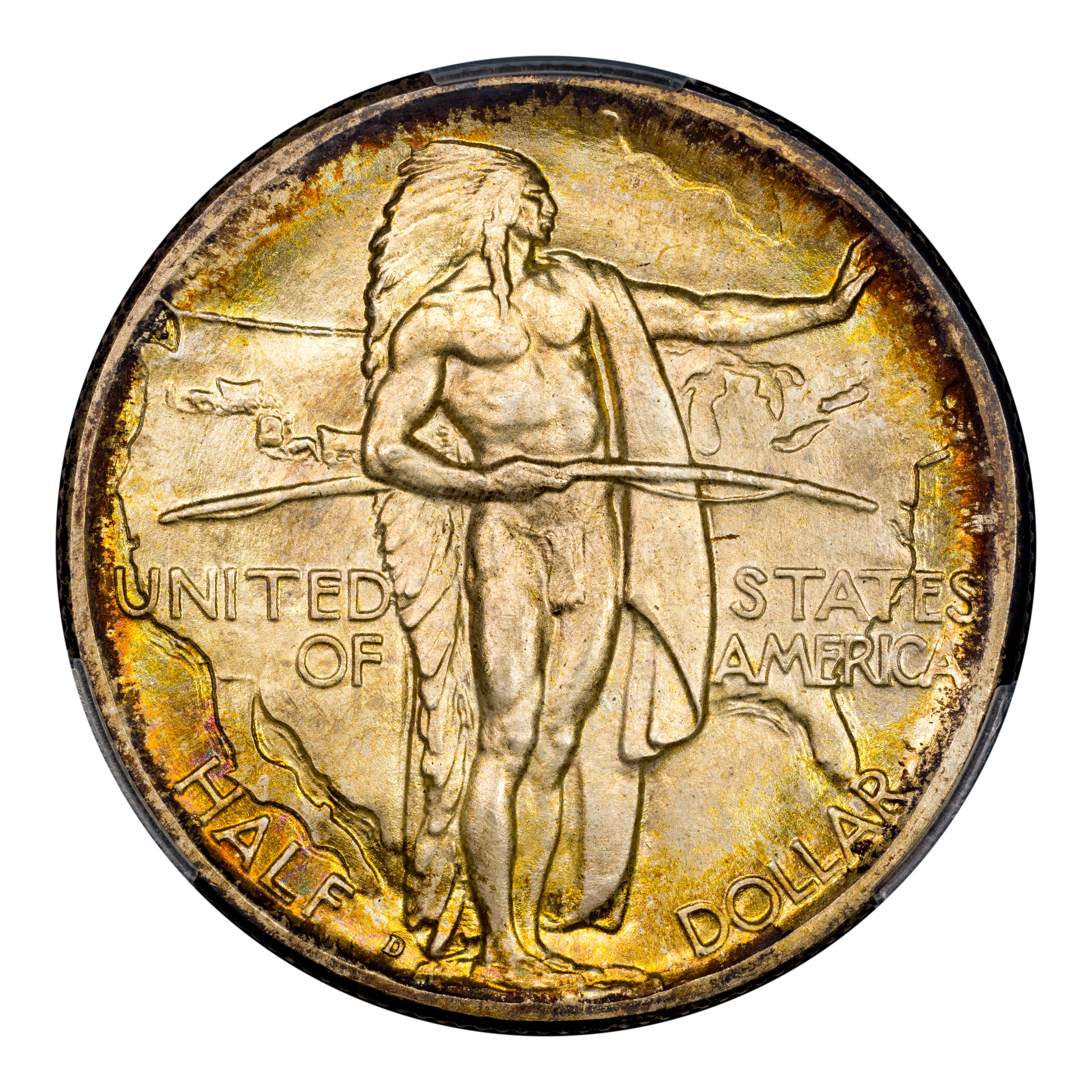 The coins were designed by James Earle Fraser and Laura Gardin Fraser, a husband-and-wife coin design team known for producing some beautiful numismatic art. The Oregon half dollar was no exception, with many calling it one of the most beautiful commemorative coins ever produced in the United States. The obverse features a Native American standing tall before a geographical outline of the United States, itself tracing a wagon train path across the western portion of the map where the 2,000-mile Oregon Trail was charted in the early 19th century.