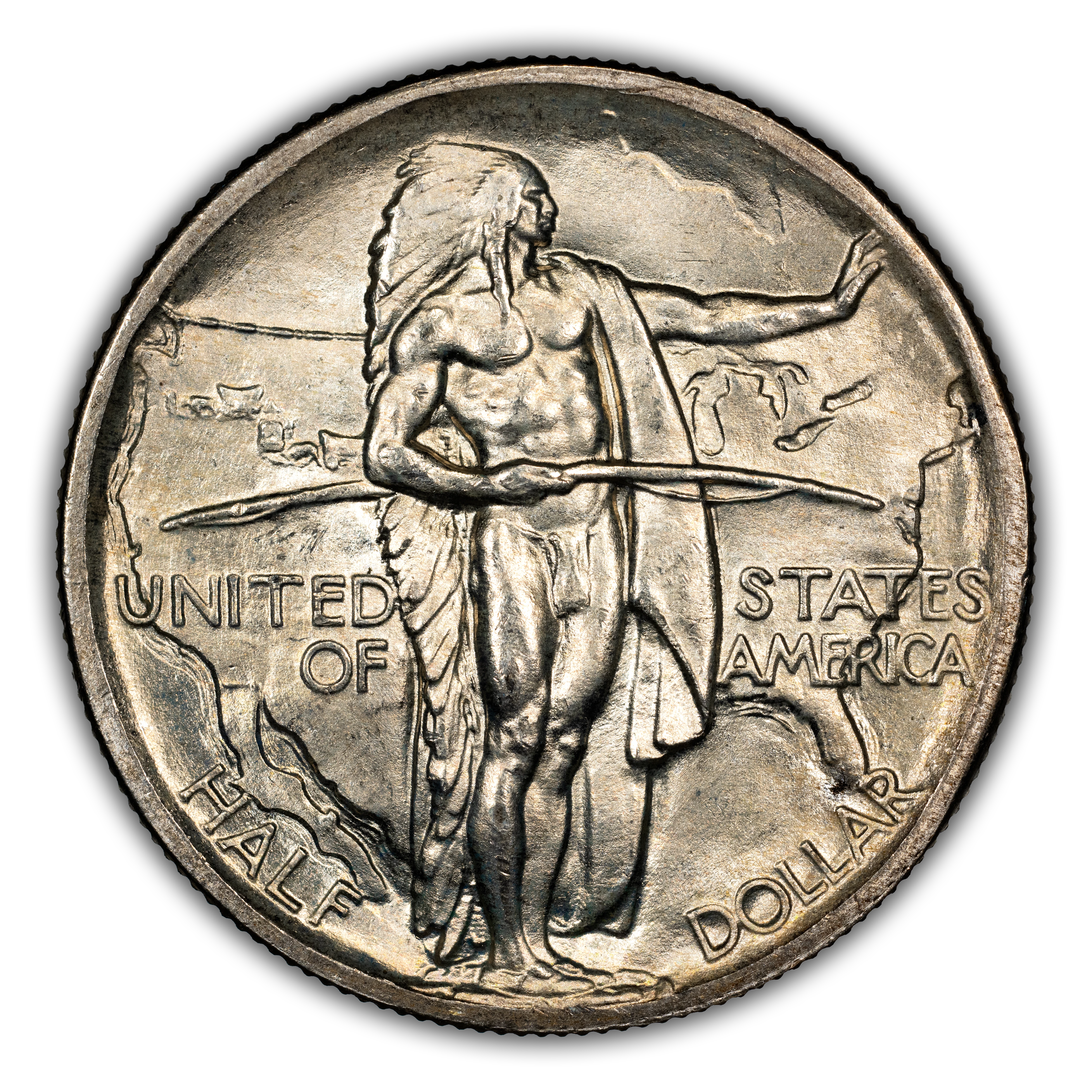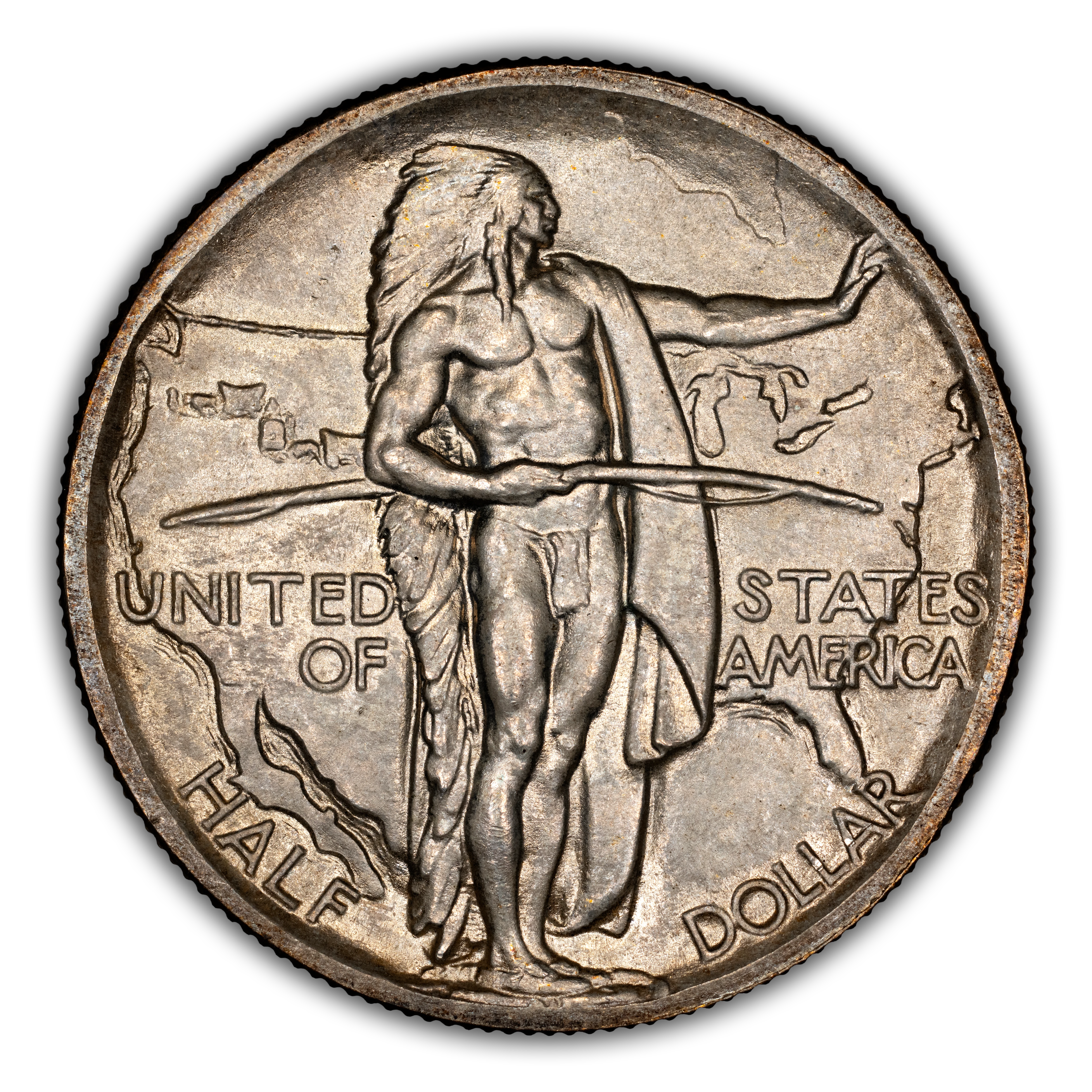 The coins were designed by James Earle Fraser and Laura Gardin Fraser, a husband-and-wife coin design team known for producing some beautiful numismatic art. The Oregon half dollar was no exception, with many calling it one of the most beautiful commemorative coins ever produced in the United States. The obverse features a Native American standing tall before a geographical outline of the United States, itself tracing a wagon train path across the western portion of the map where the 2,000-mile Oregon Trail was charted in the early 19th century.