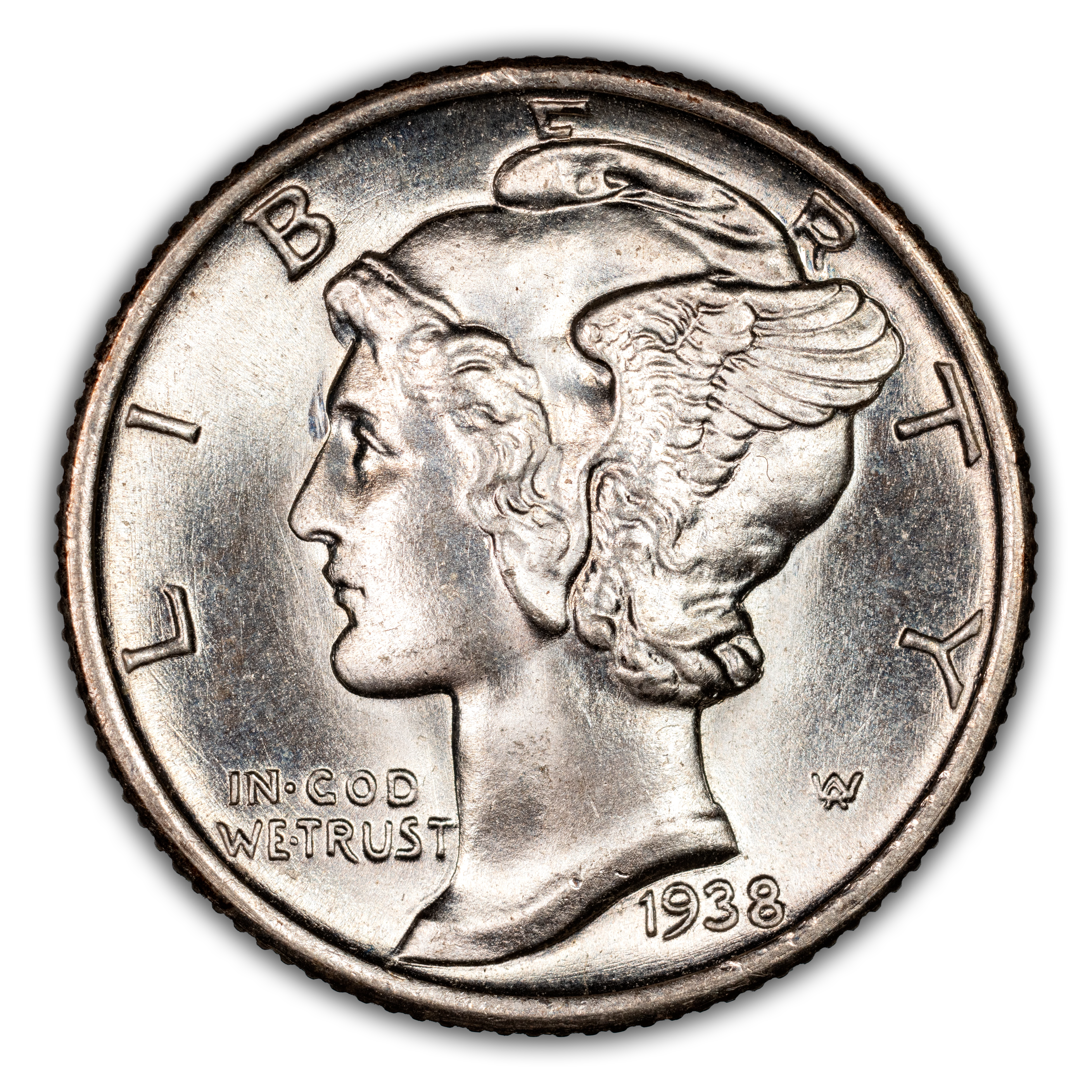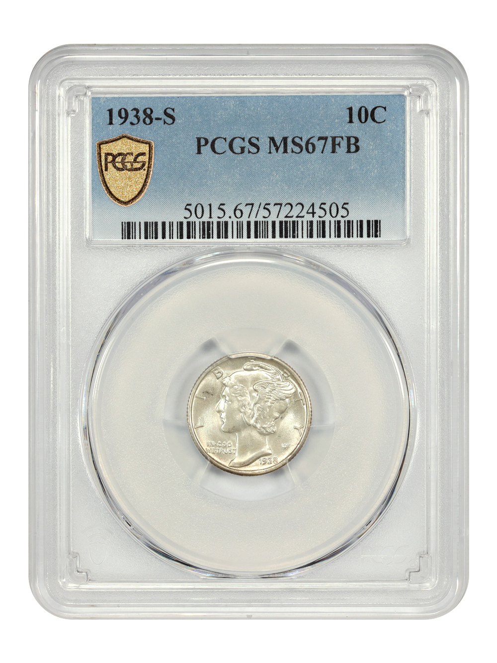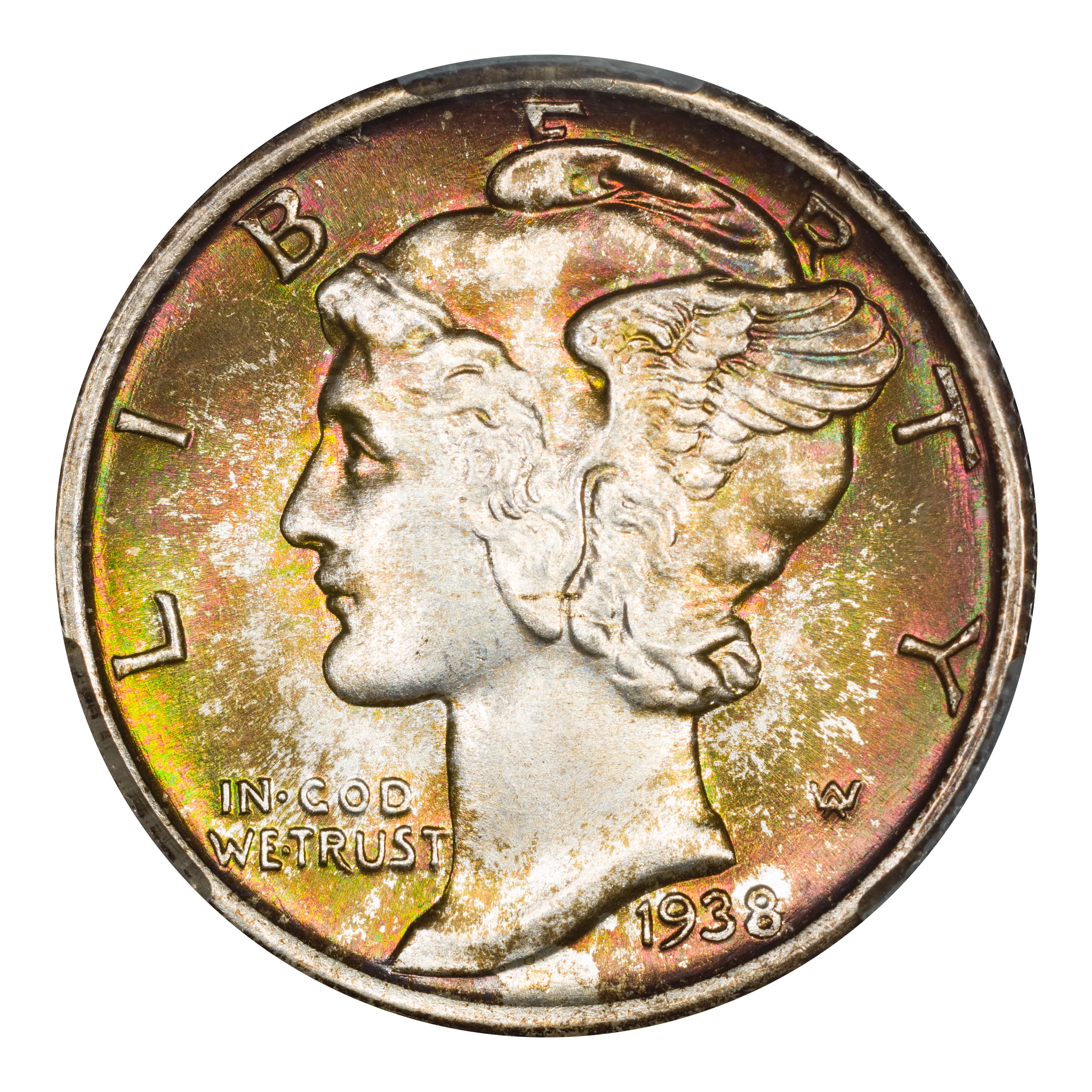 The 1938-S Mercury dime is a common coin by all accounts, with plentiful specimens in all circulated grades and thousands of uncirculated Full Bands specimens. This piece is readily available through MS66 and much scarcer in higher grades through MS68. The 1938-S Mercury dime set an incredible price record for this series when a rainbow-mottled example graded PCGS/CAC MS68 took a whopping $364,250 in June 2019.