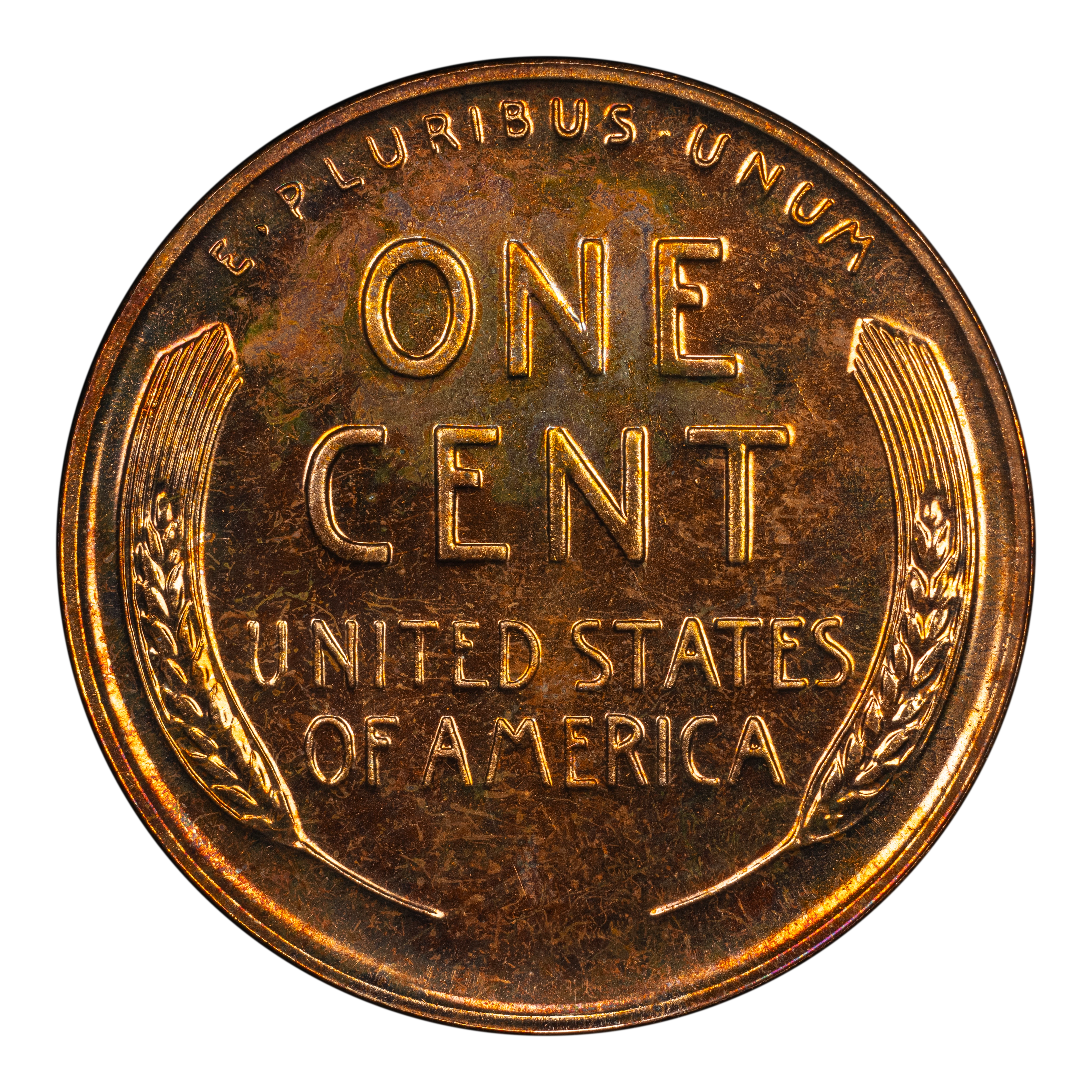 Reverse: Wheat ears flanking the words ONE CENT, UNITED STATES OF AMERICA. The motto E PLURIBUS UNUM on the top perimeter.