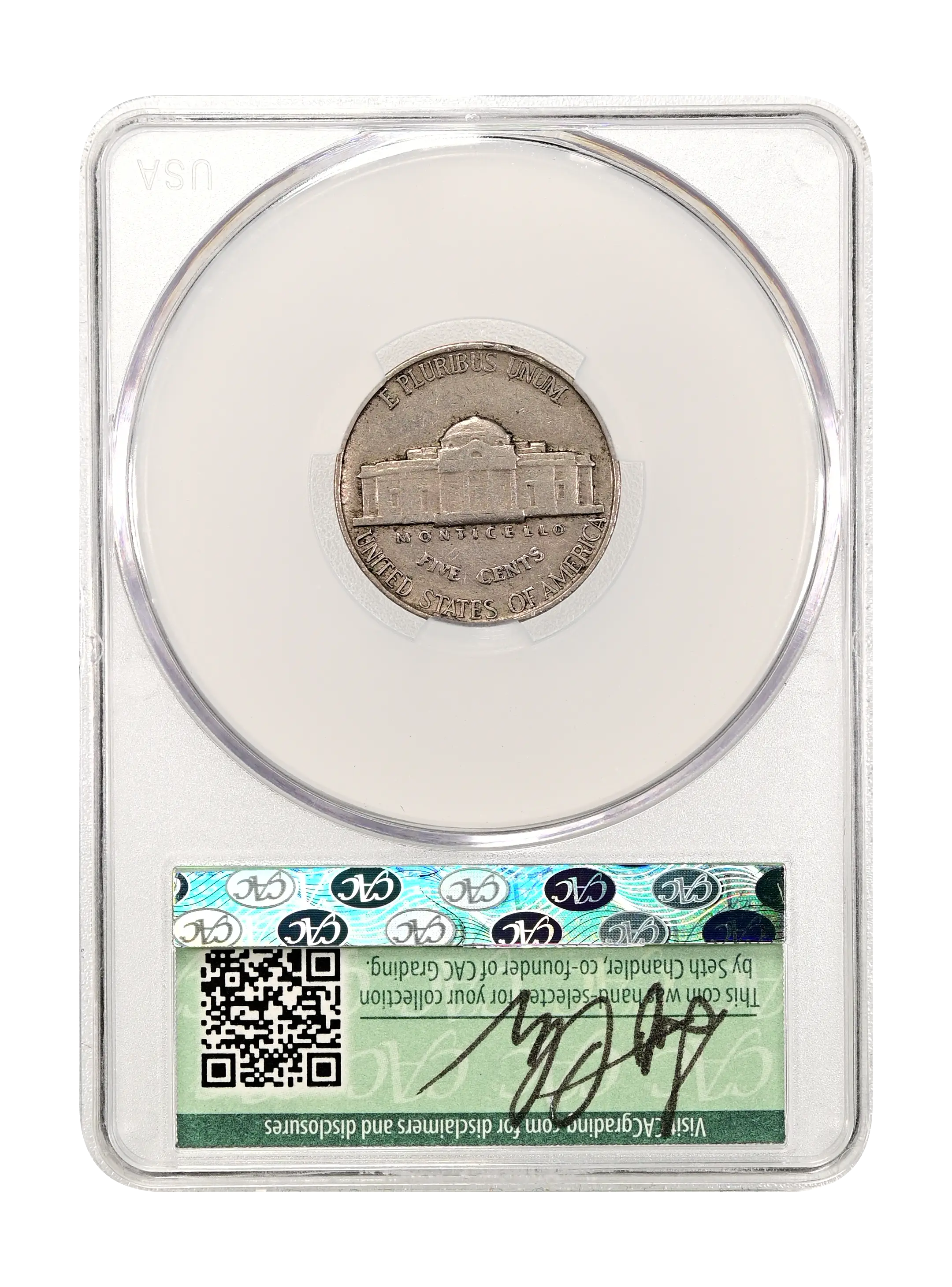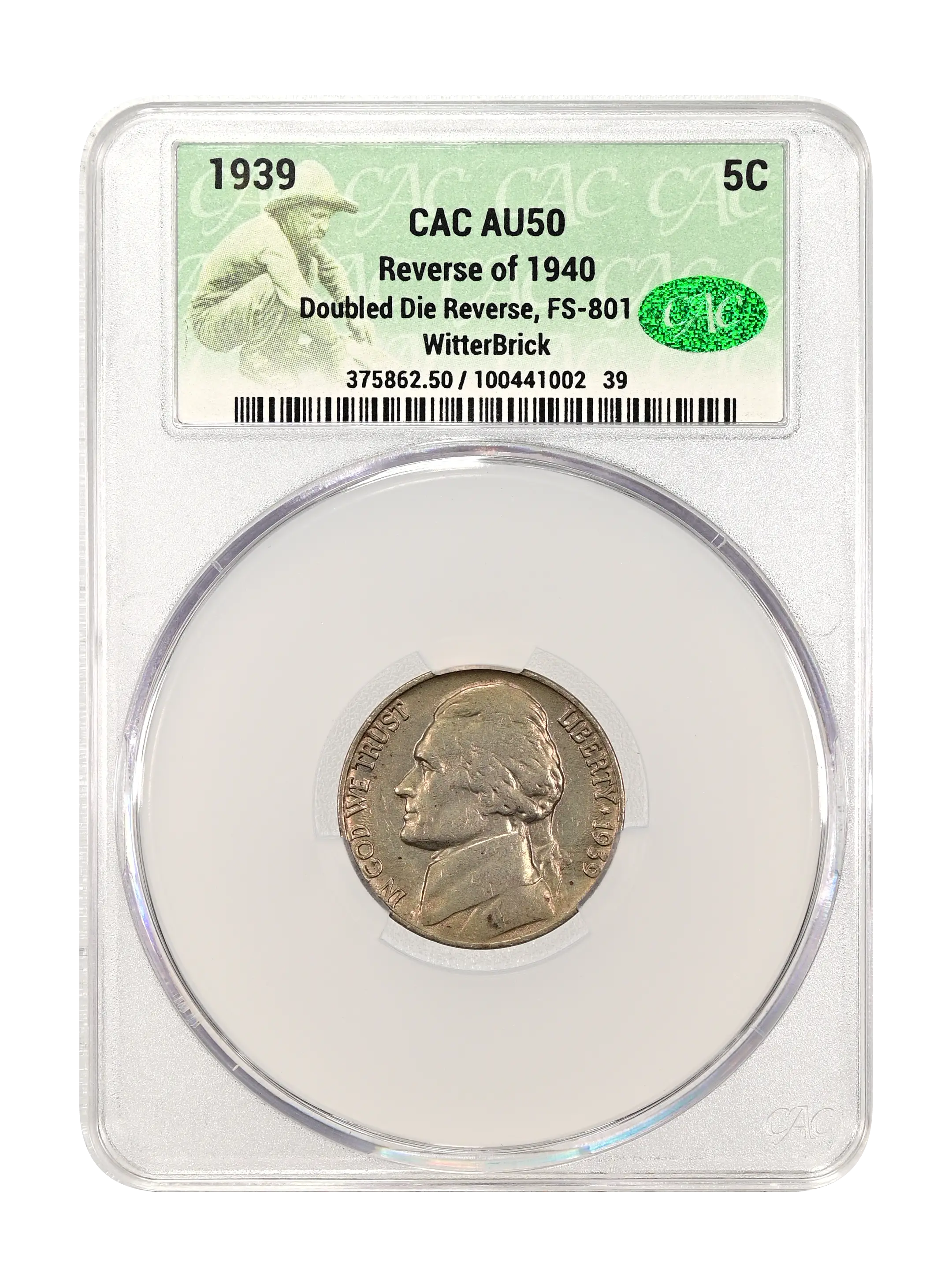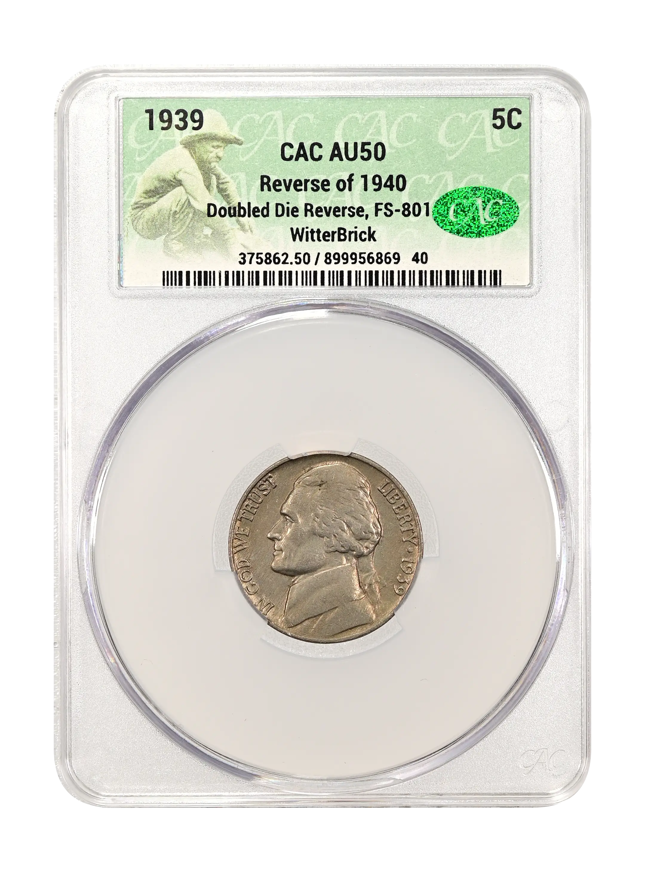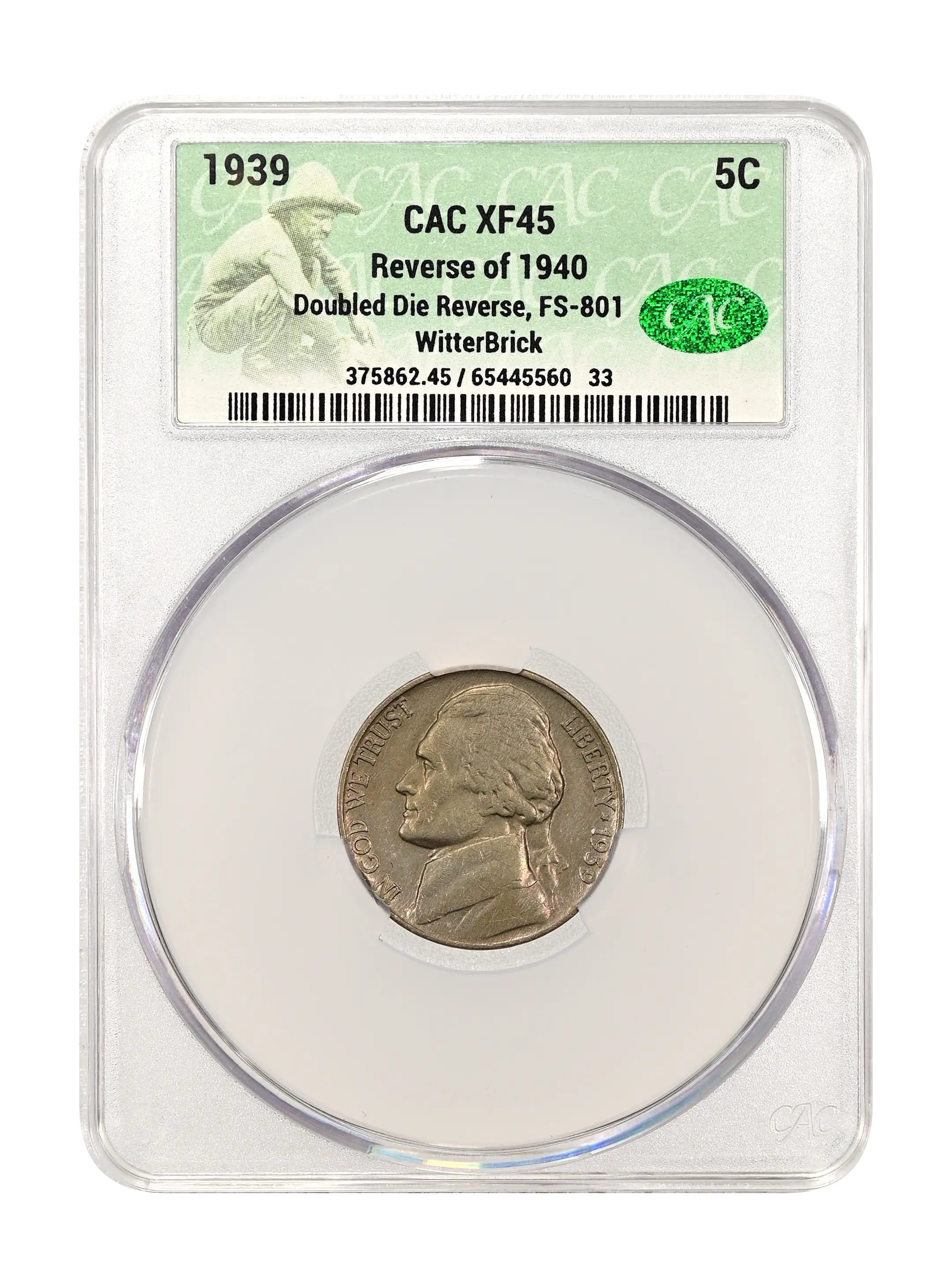 1939 Reverse of 1940 5c Doubled Die Reverse, FS-801 CAC XF45