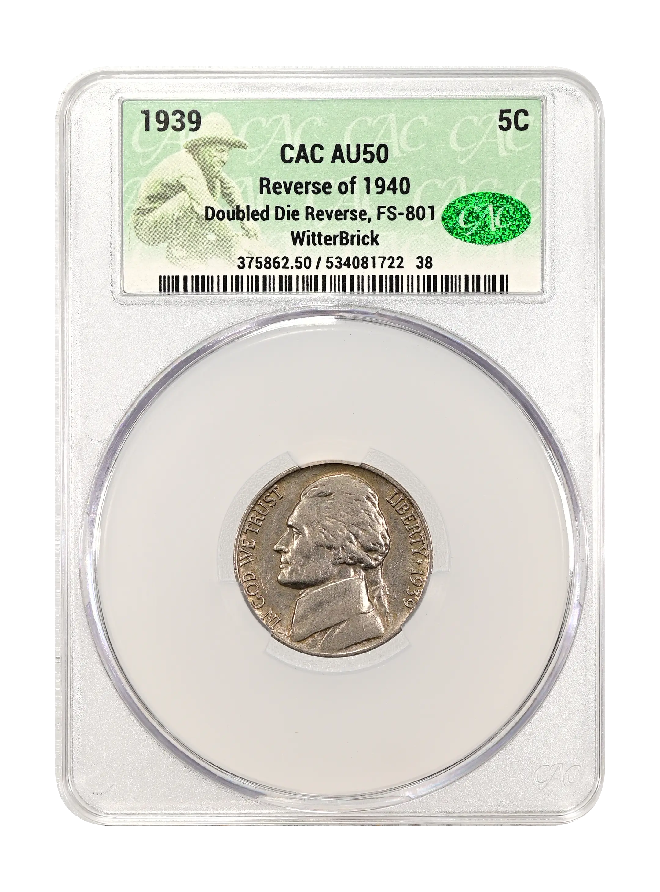 1939 Reverse of 1940 5c Doubled Die Reverse, FS-801 CAC AU50