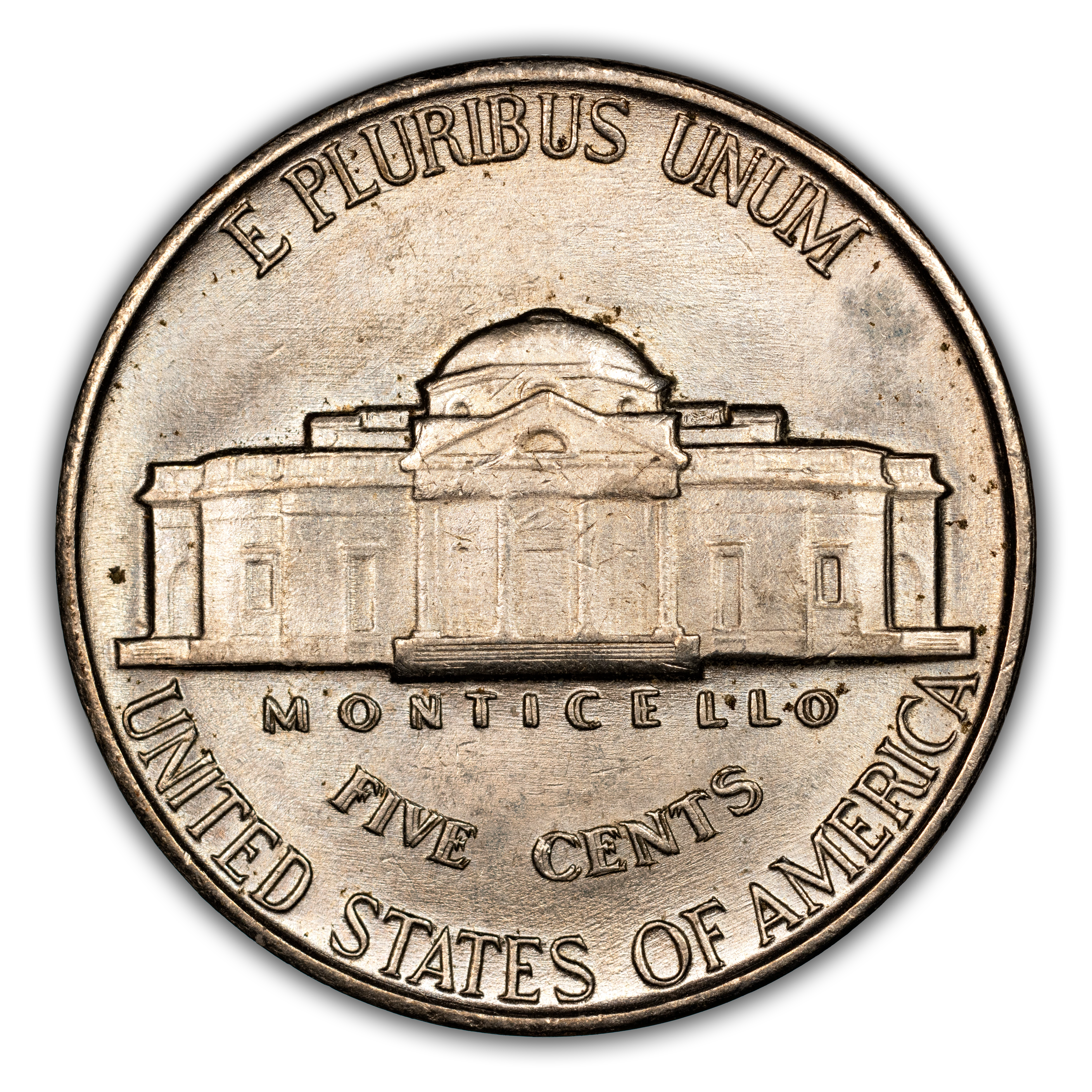 Reverse: The Jefferson home is prominently centered with the name MONTICELLO captioned below. The denomination FIVE CENTS is spelled out in half circle underneath and the words E PLURIBUS UNUM and UNITED STATES OF AMERICA appear at the top and bottom periphery.