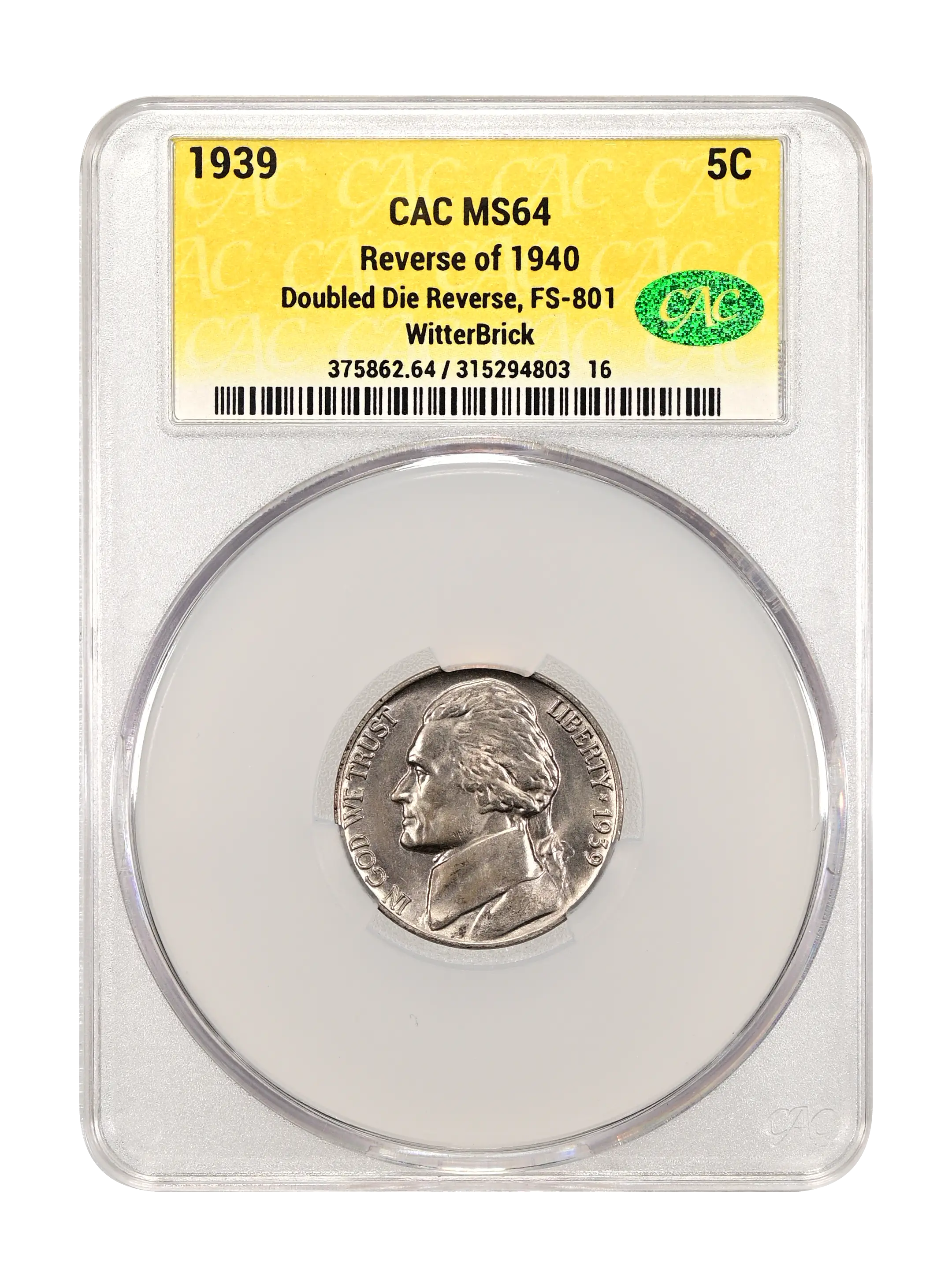 1939 Reverse of 1940 5c Doubled Die Reverse, FS-801 CAC MS64