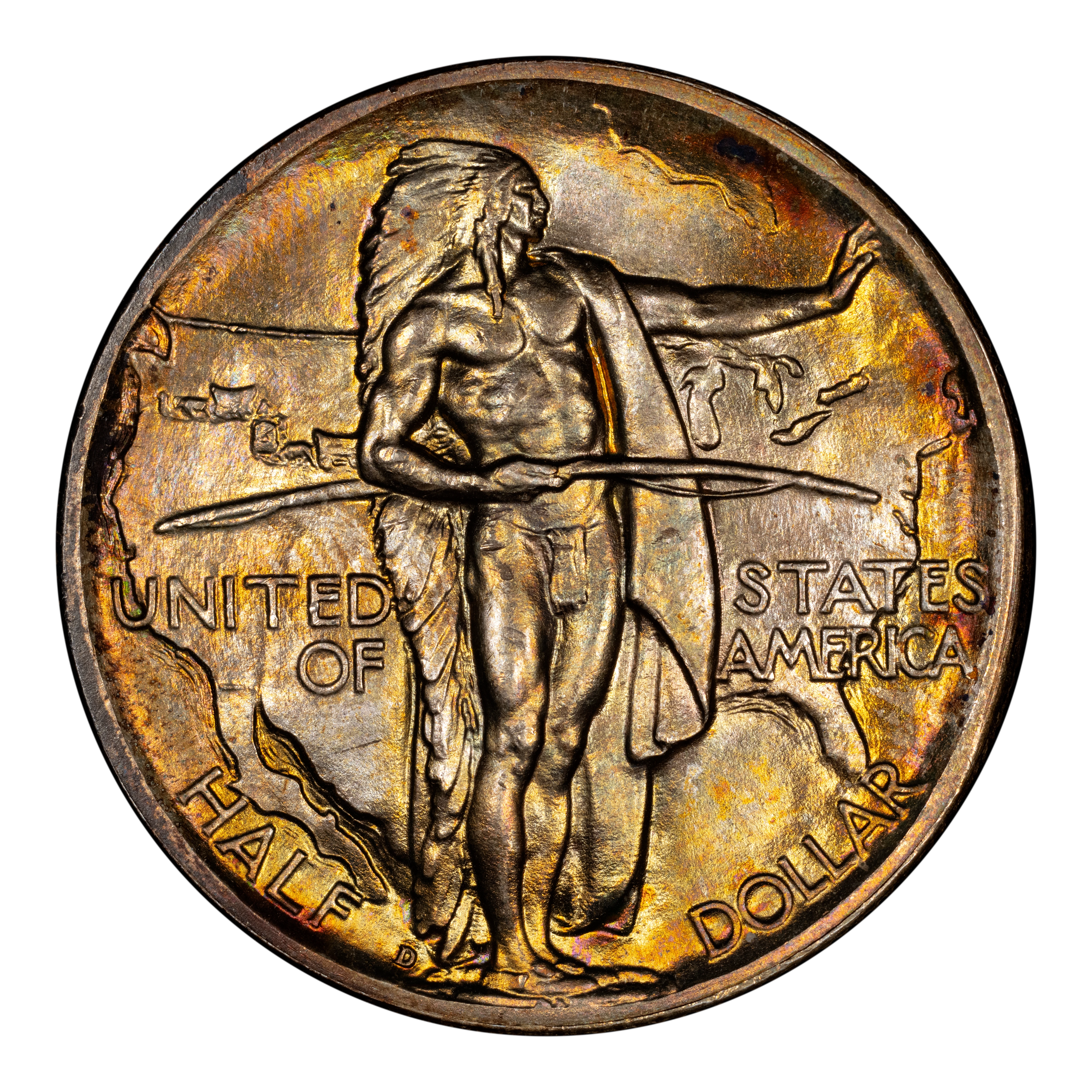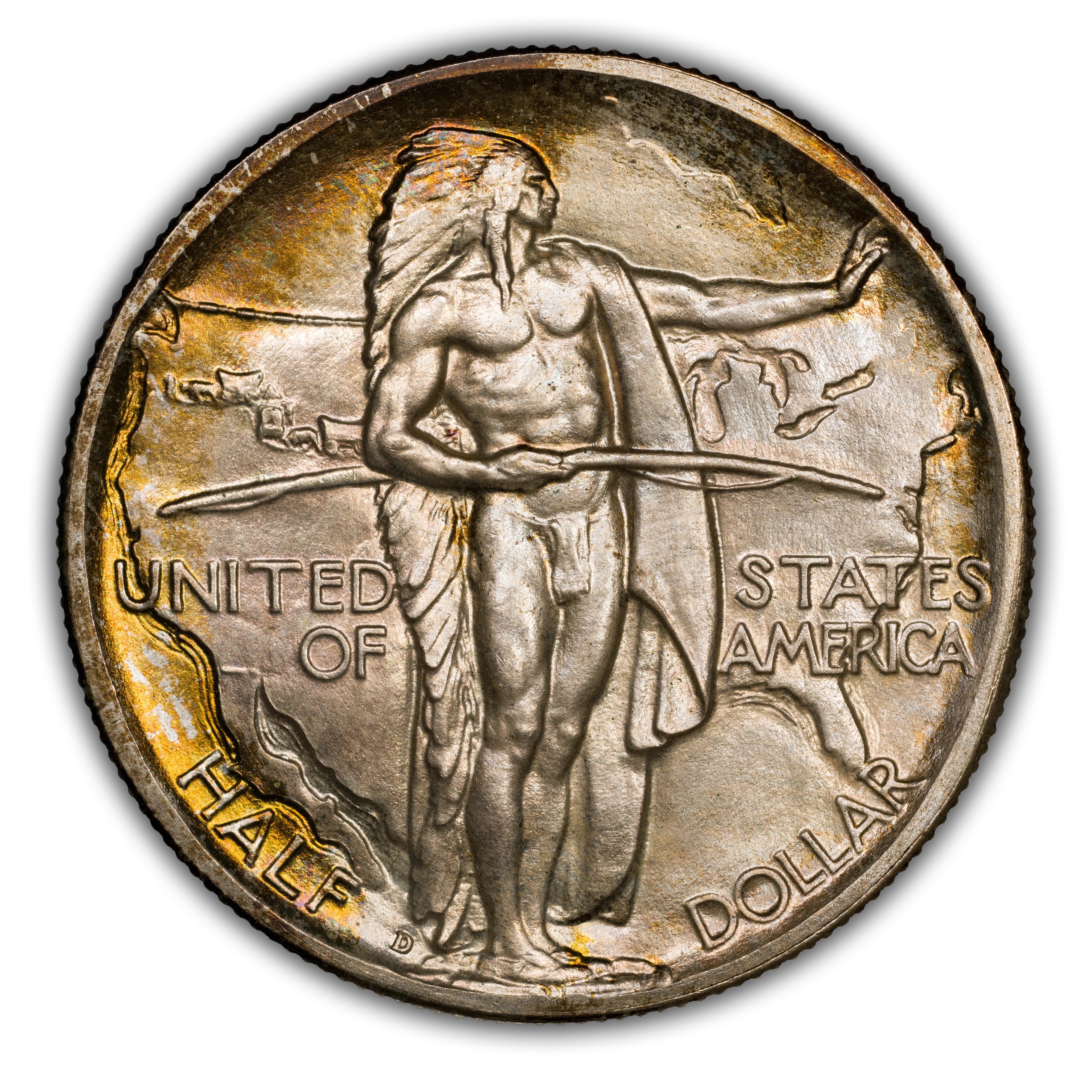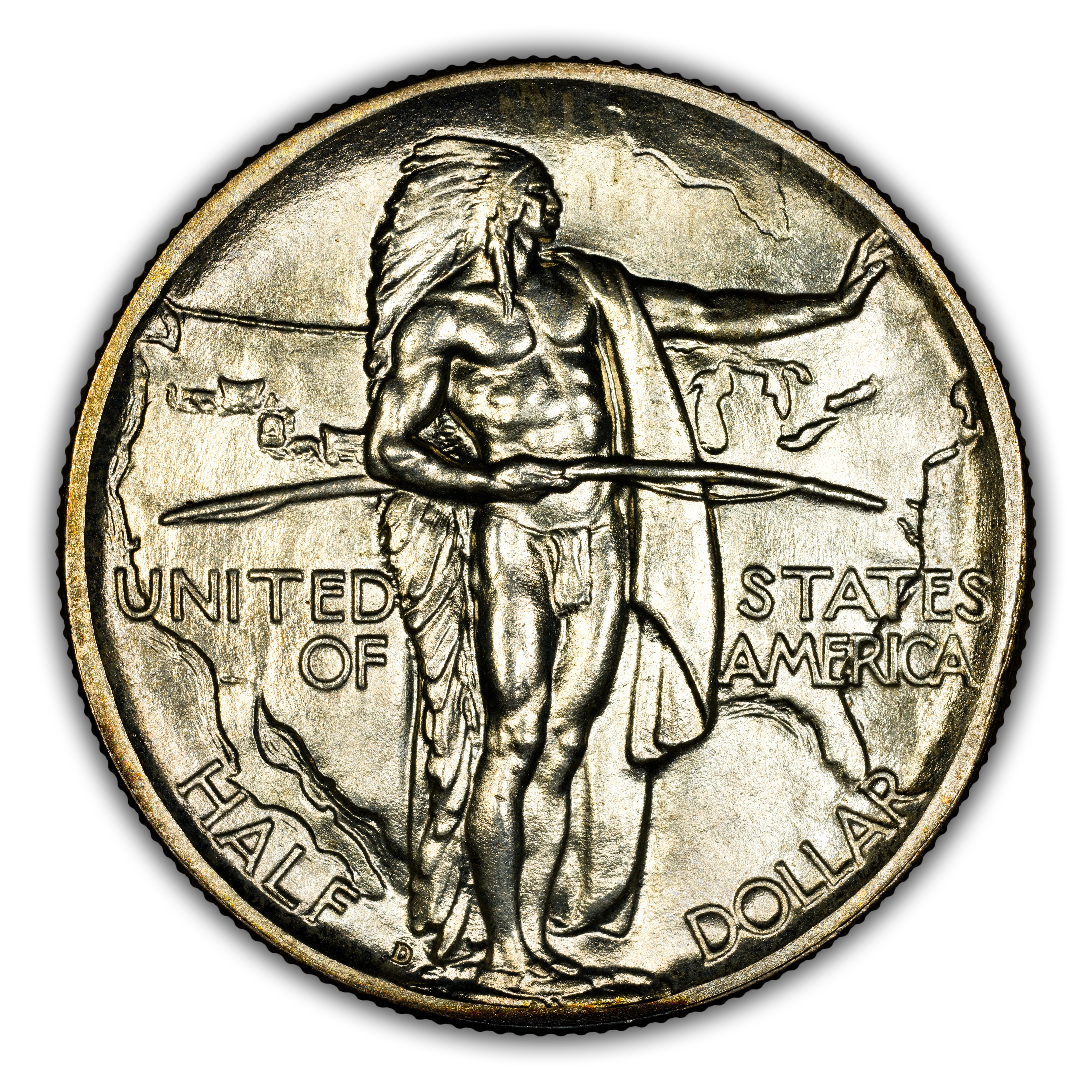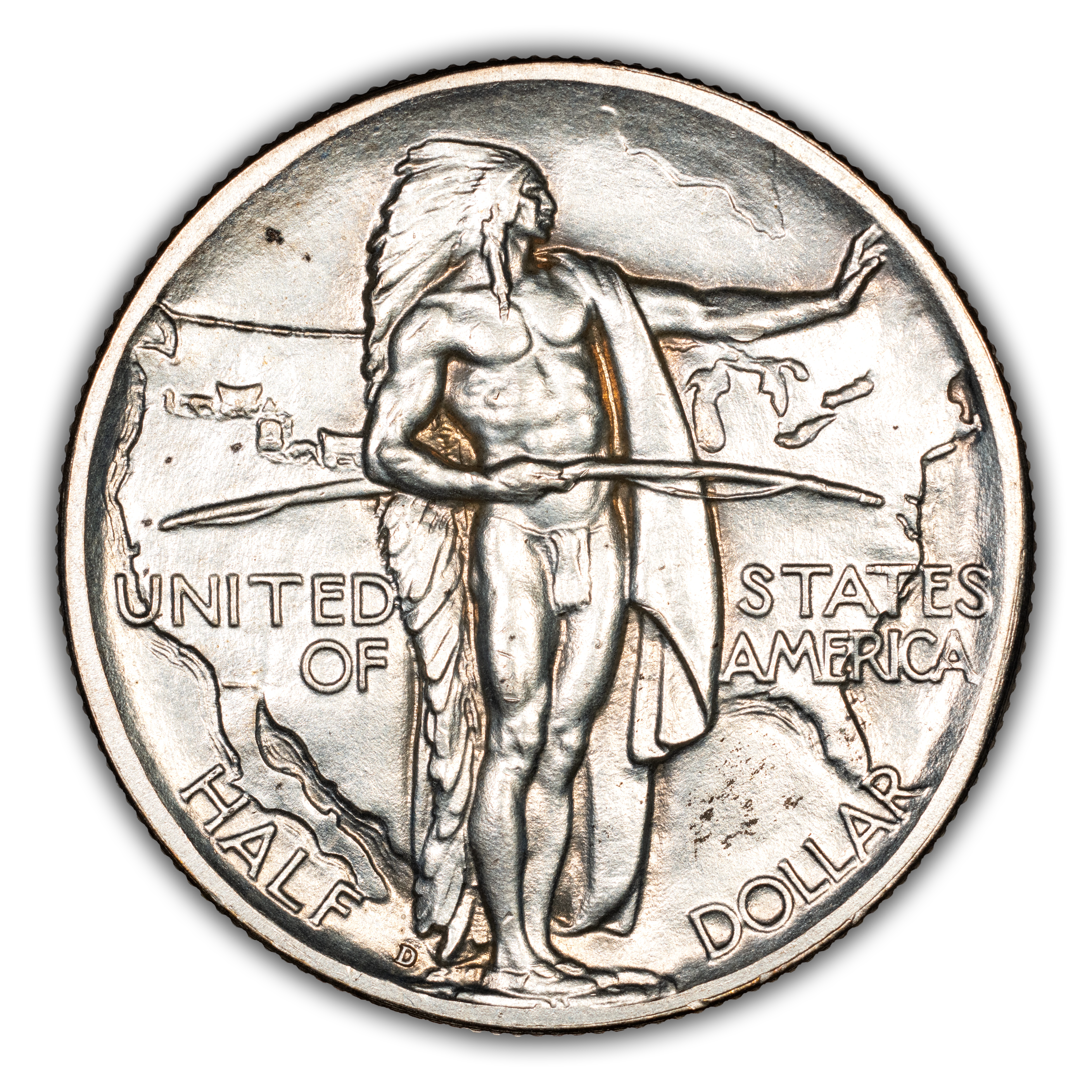 Oregon half dollars were designed by husband and wife coin artists James Earle Fraser and Laura Gardin Fraser. The Oregon half dollar is considered one of the most beautiful United States commemorative designs, honoring the pioneers who charted the 2,000-mile path across the western United States during the early 19th century. The obverse features a majestic portrait of a Native American standing before an outline of the United States, which shows a little line of covered wagons cutting across the map where the Oregon Trail was blazed. On the reverse of the coin is a serene scene of a cattle-drive stagecoach approaching the setting sun.