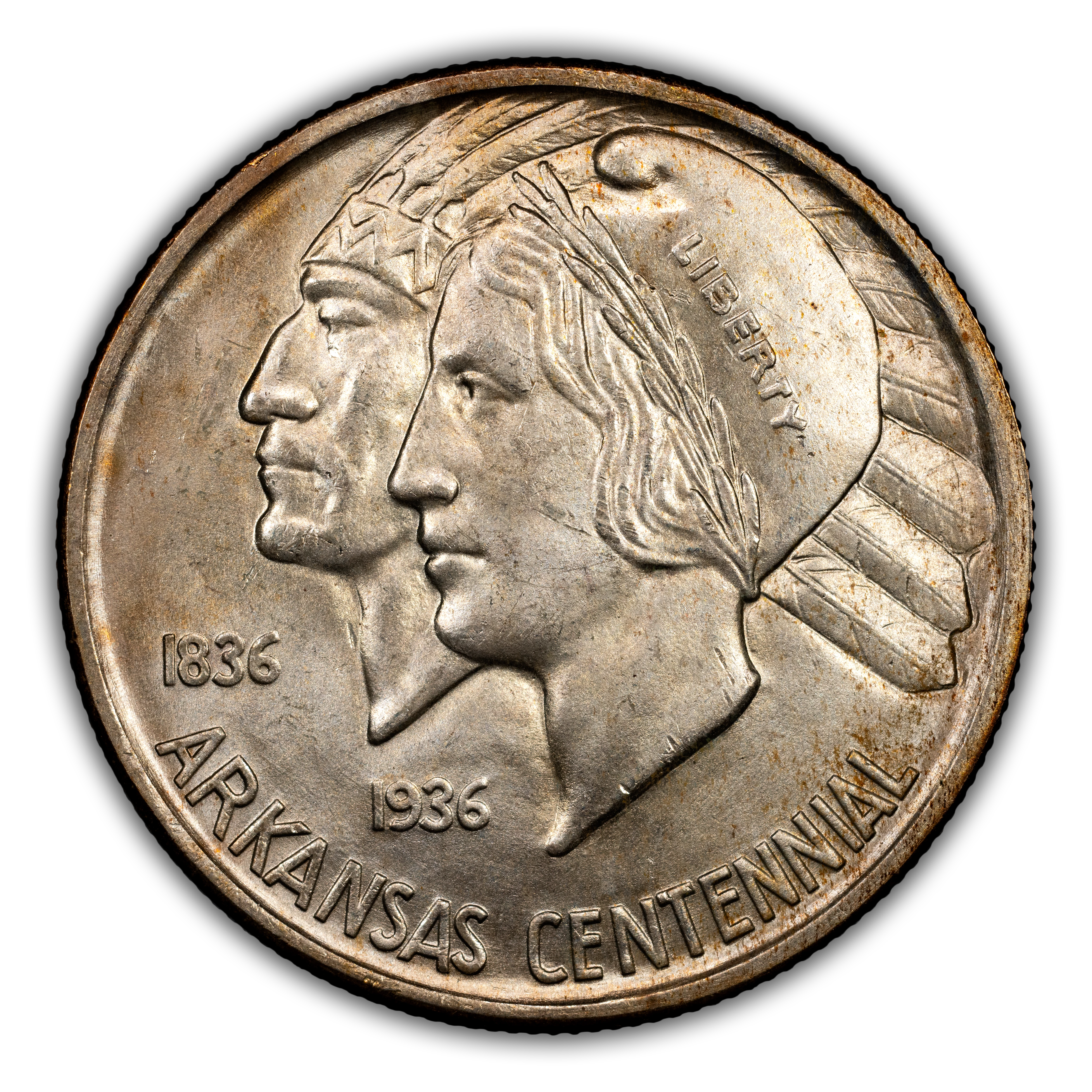 The 1939 commemorative half dollars feature an obverse by Everett Burr depicting an eagle and rays, while the reverse showcases a jugate portrait of a Native American chief of 1836 and an American woman of 1935, as designed by Emily Bates. The 1939 Arkansas commemorative half dollars were struck at the Philadelphia, Denver, and San Francisco Mints and sold by the Arkansas Centennial Commission in three-piece sets for $10.