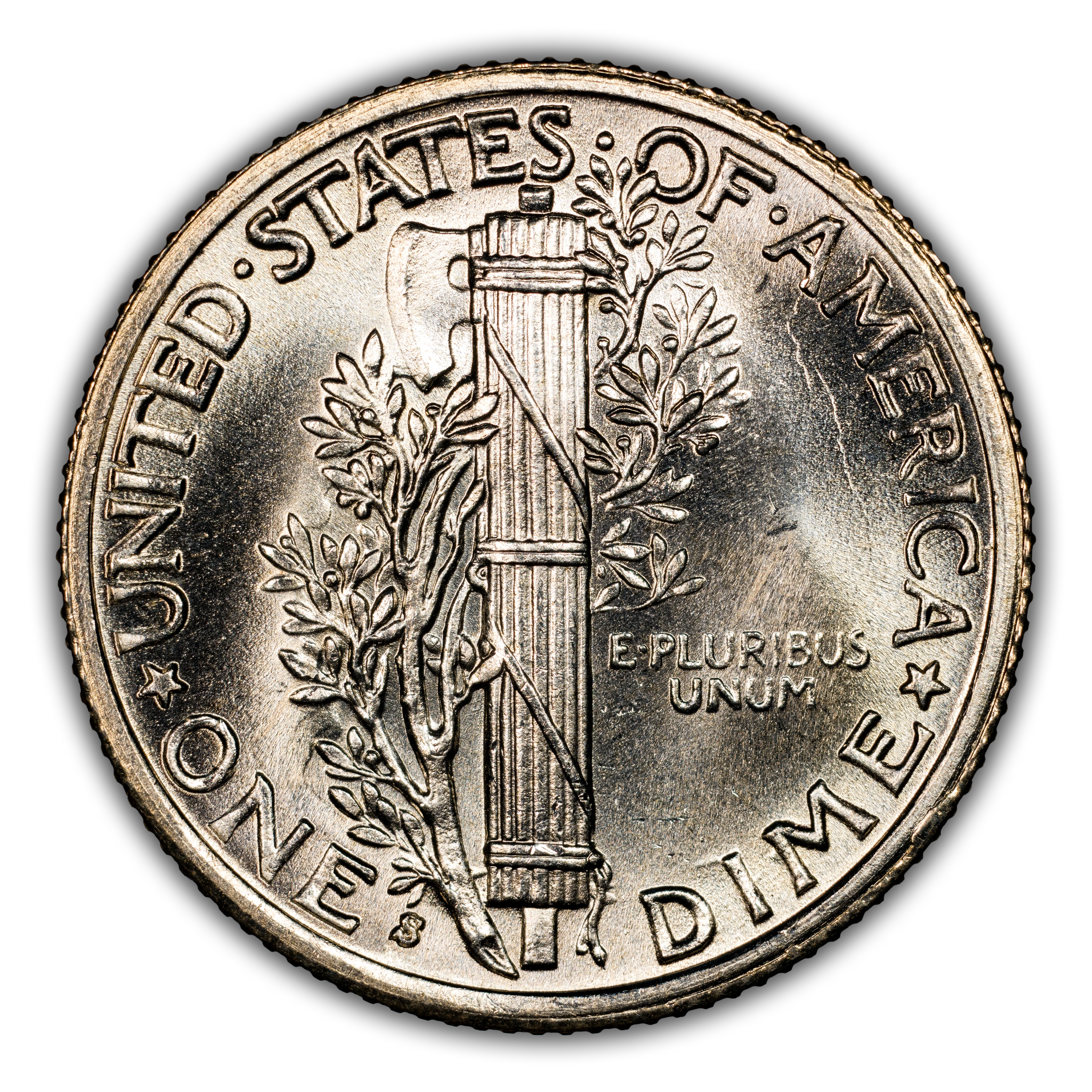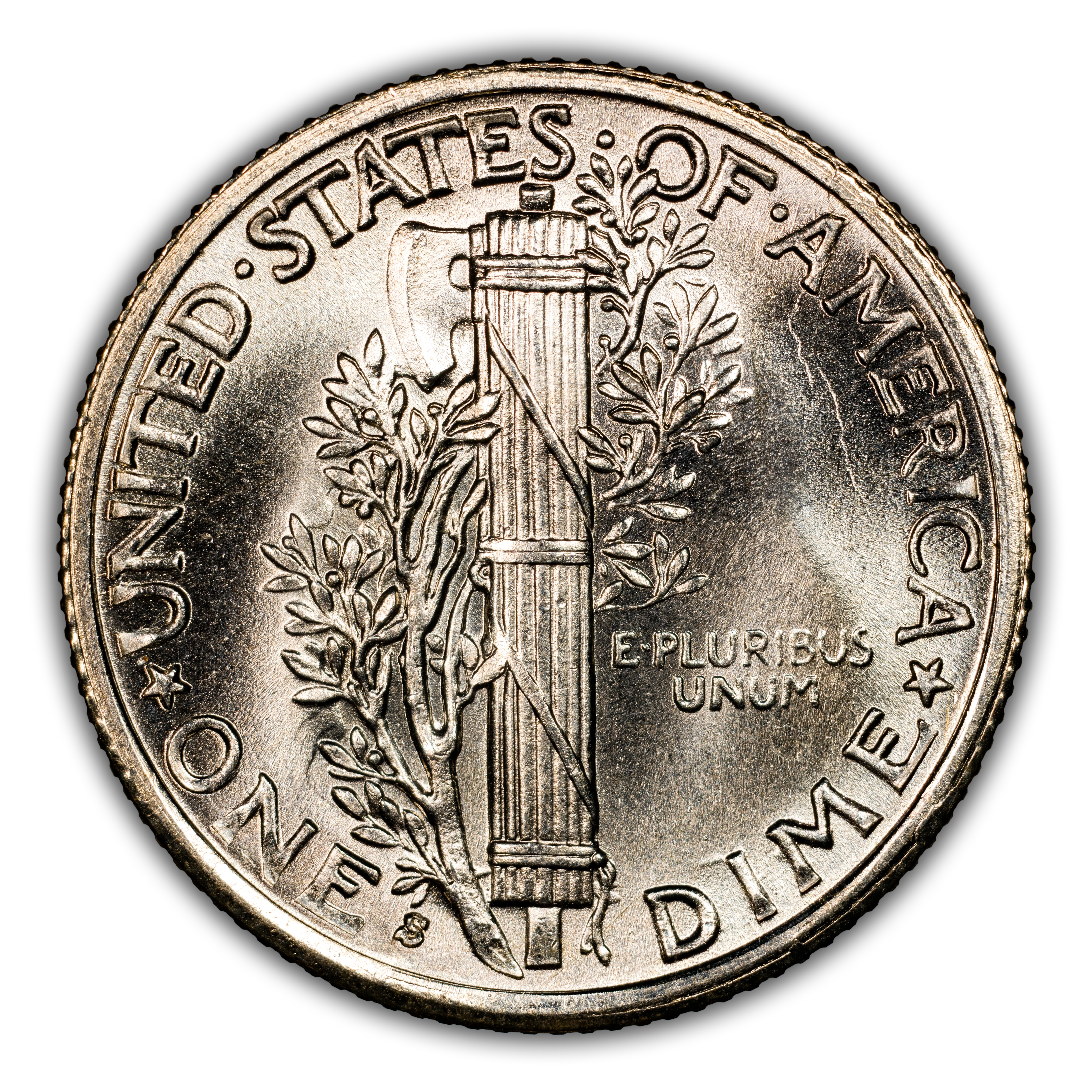 Reverse: A large torch is centered vertically adorned with an axe head and olive branches. UNITED STATES OF AMERICAN * ONE DIME * is spelled out around the periphery. Mint mark, if any, appears near the bottom rim left of the torch.
