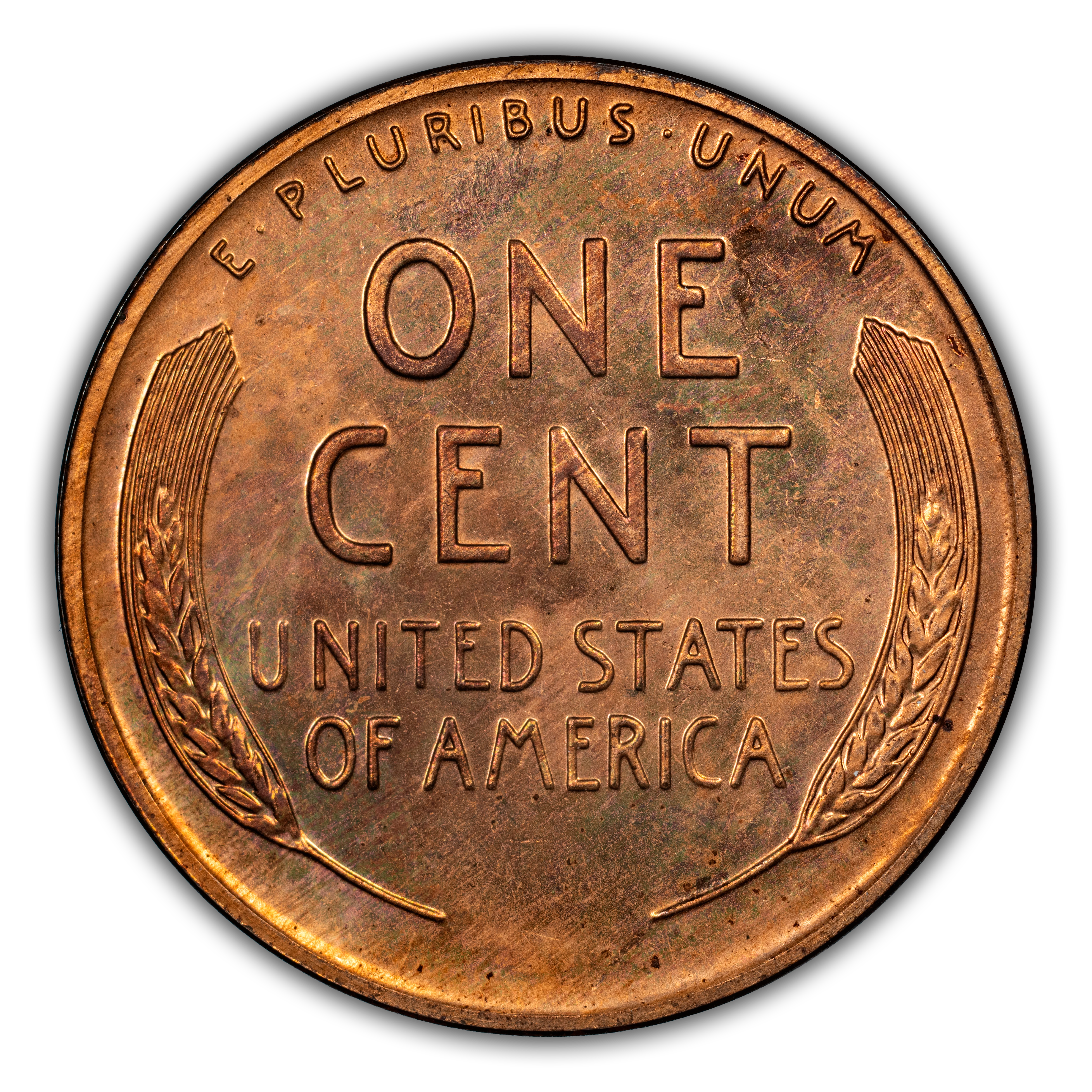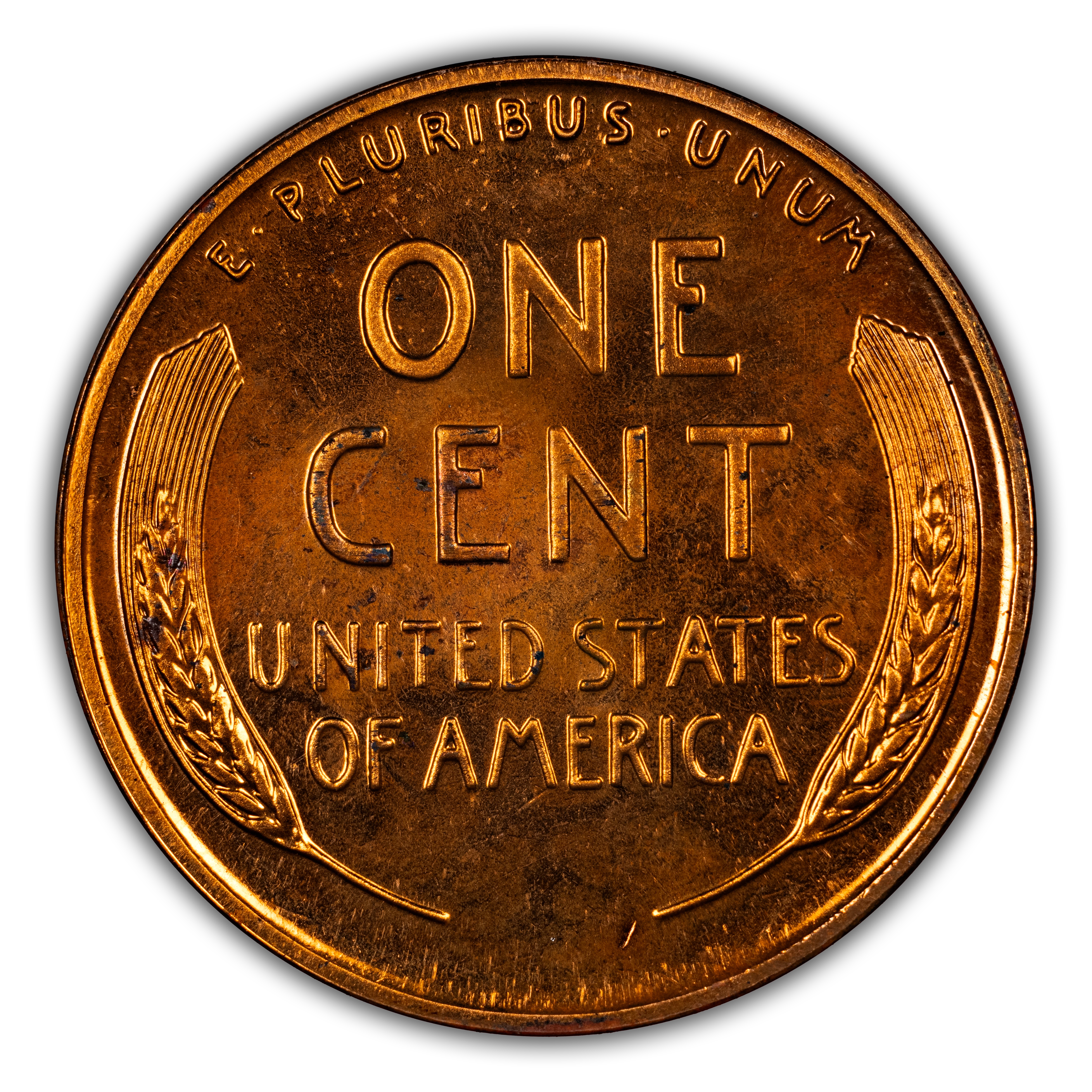 Reverse: Wheat ears flanking the words ONE CENT, UNITED STATES OF AMERICA. The motto E PLURIBUS UNUM on the top perimeter.