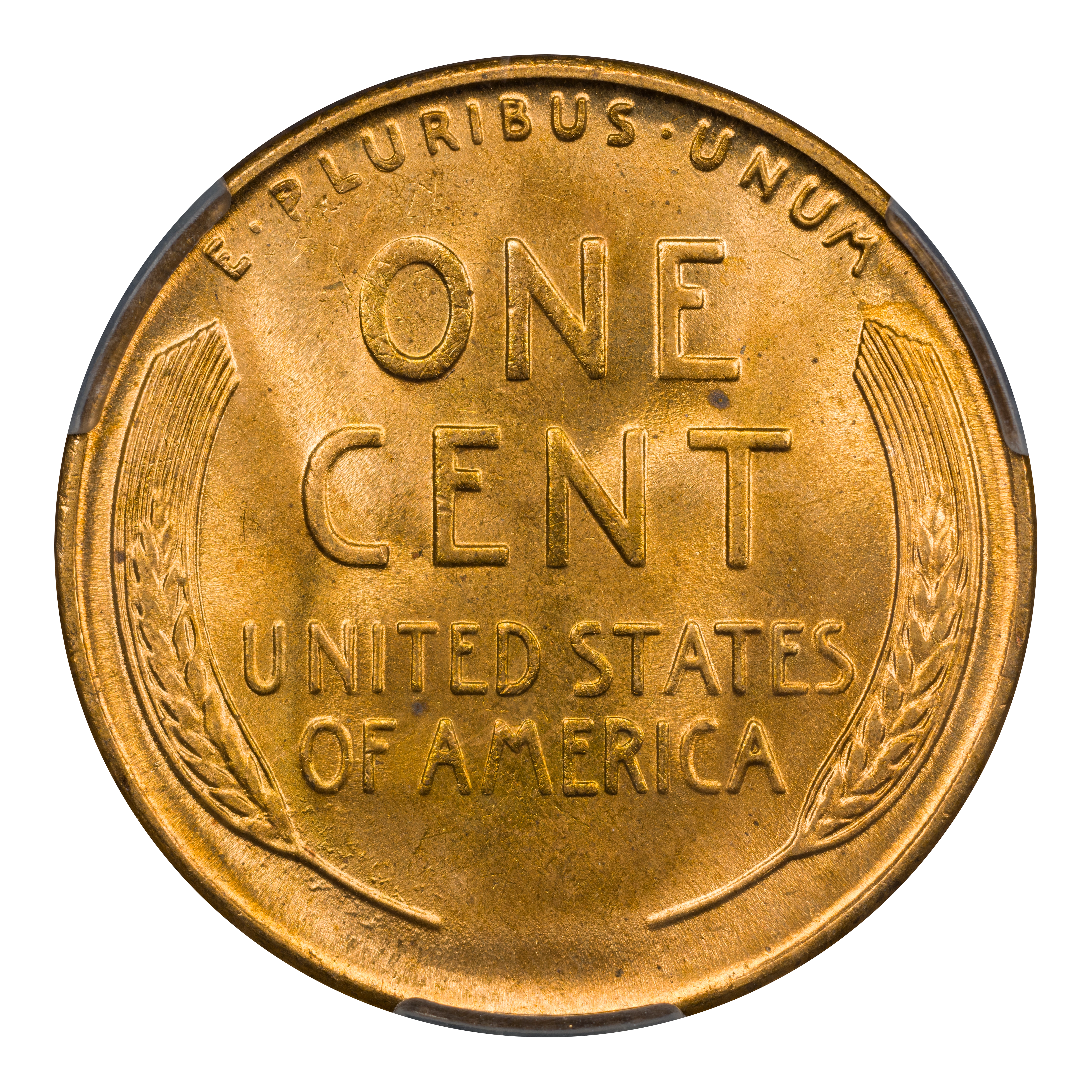 Reverse: Wheat ears flanking the words ONE CENT, UNITED STATES OF AMERICA. The motto E PLURIBUS UNUM on the top perimeter.