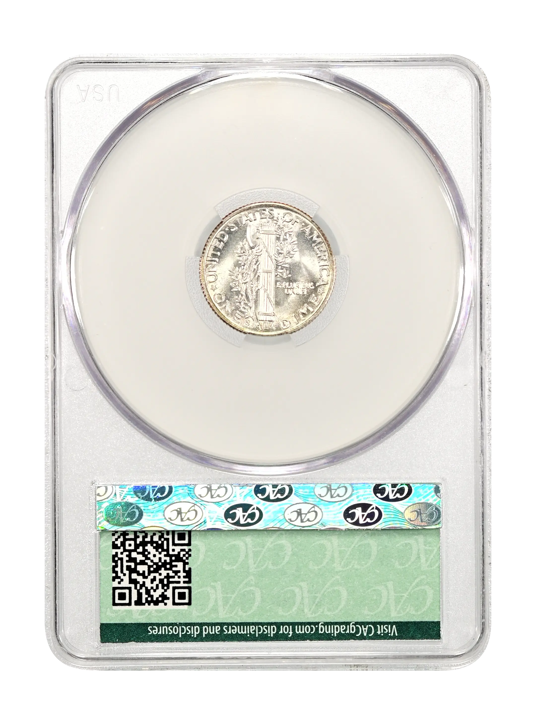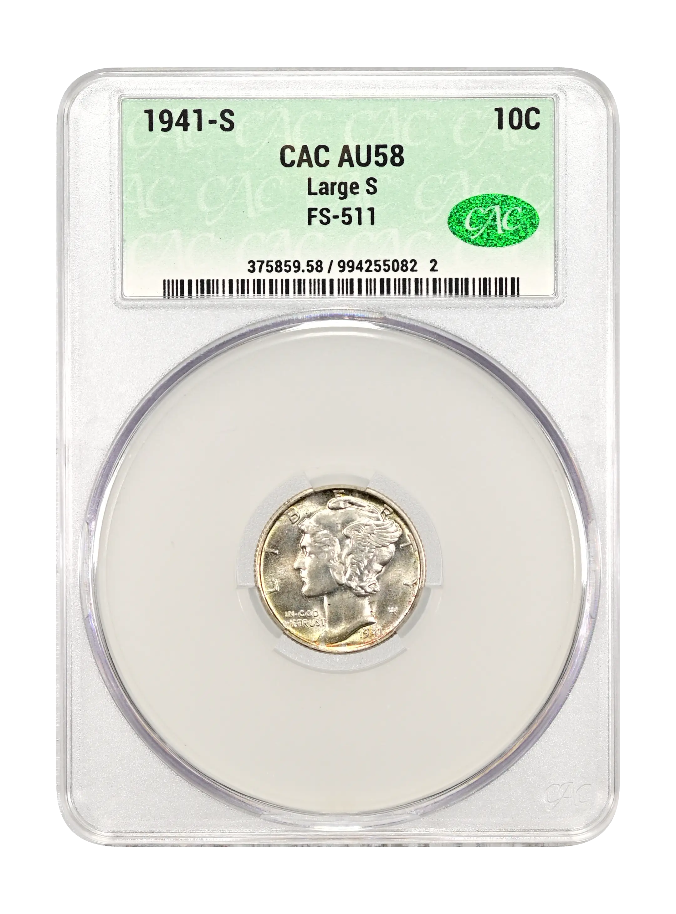 Historically speaking, most Mercury dime issues from the San Francisco Mint are at least a little challenging in the higher grades. Of course, as enthusiasts know examples struck since 1934 are much more common than their earlier counterparts. And the 1941-S Mercury dime is no exception to this rule, whereby it is essentially as common as its Philadelphia- and Denver-minted counterparts, if not exactly by original mintage then at least by survivorship. Only the top-end examples -- Full Bands specimens grading higher than MS67 -- pose any real challenge to the enthusiast.