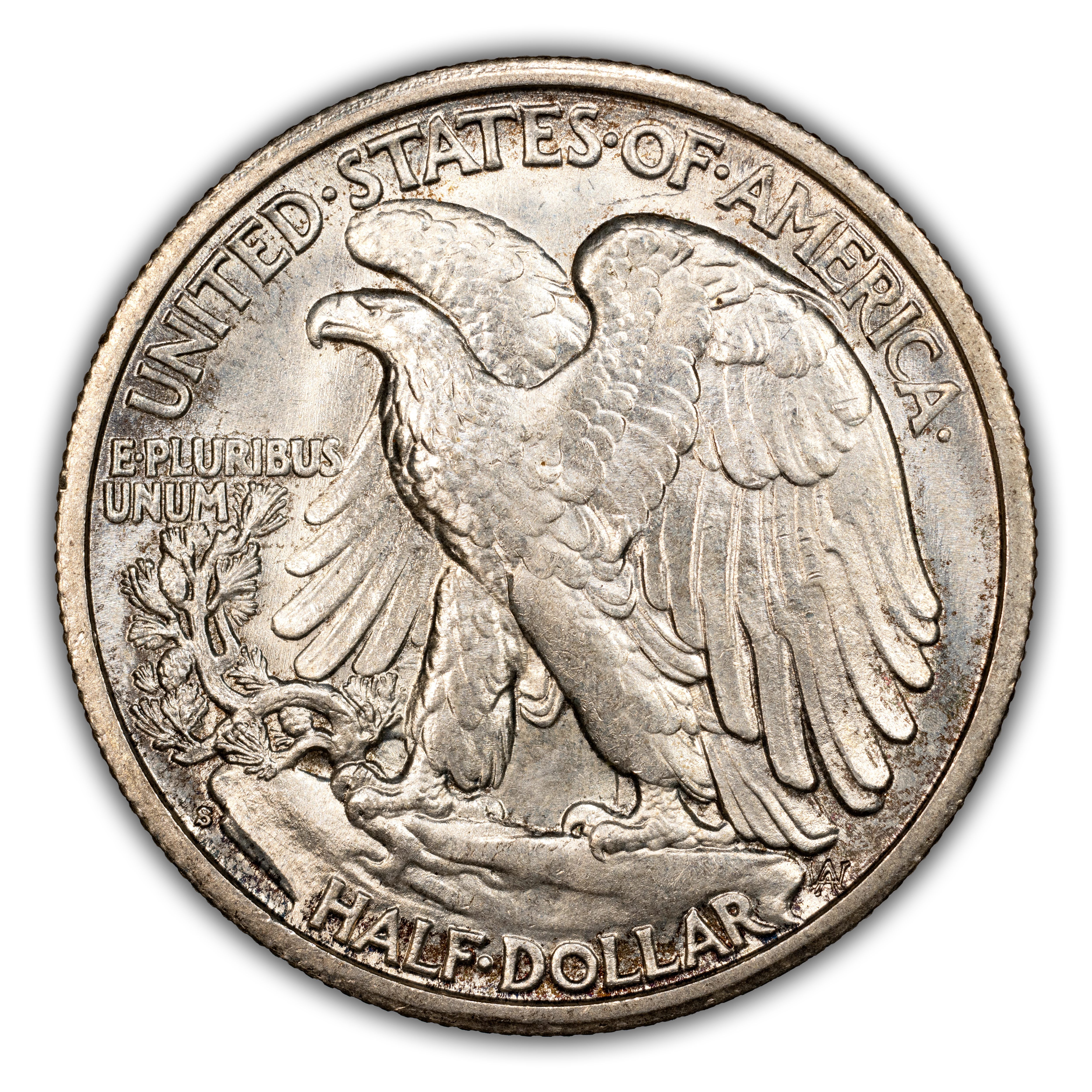Reverse: A large eagle perched on a rock, facing left with wings elevated in a defensive posture. UNITED STATES OF AMERICA and HALF DOLLAR appear on the periphery. The motto E PLURIBUS UNUM sits atop a small olive branch left of the eagle. The mintmark is small, and placed below the olive branch near the left rim.