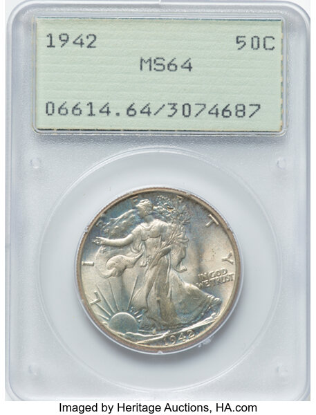 This issue has an extremely high mintage and therefore massive survival estimate for collectors. The 1942 is a Walking Liberty Half Dollar type coin that is only worth the value of the scrap silver content if graded less than Mint State. Widely available in all Mint State grades through MS67, with just the finest MS68 being scarce. As a common, affordable type coin it makes a beautiful appearance with a very strong strike and fantastic luster.