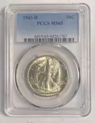 <B>1942-D 50C MS65 PCGS.</B></I> CDN: $115 Whsle. Bid for NGC/PCGS MS65. Mintage 10,973,800....