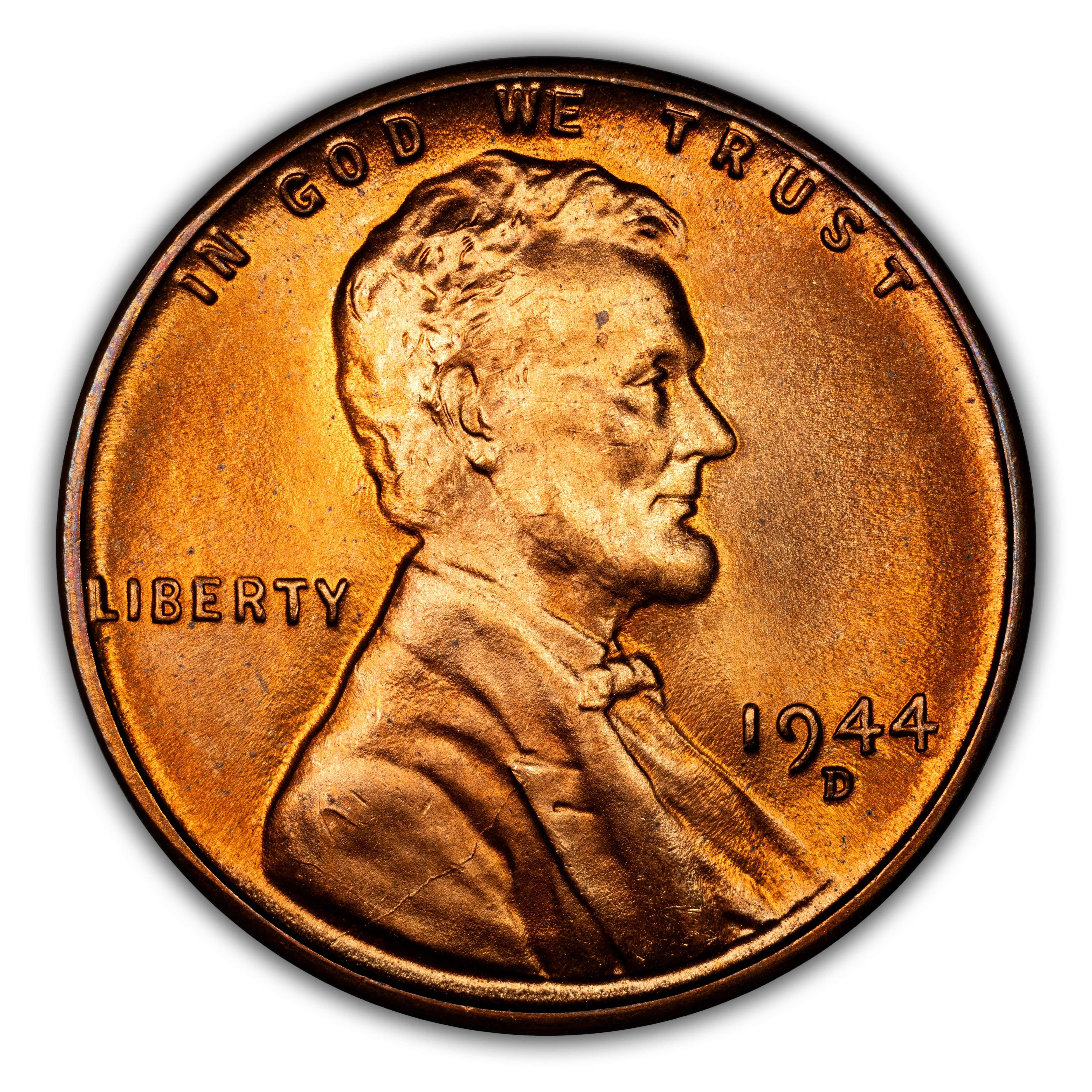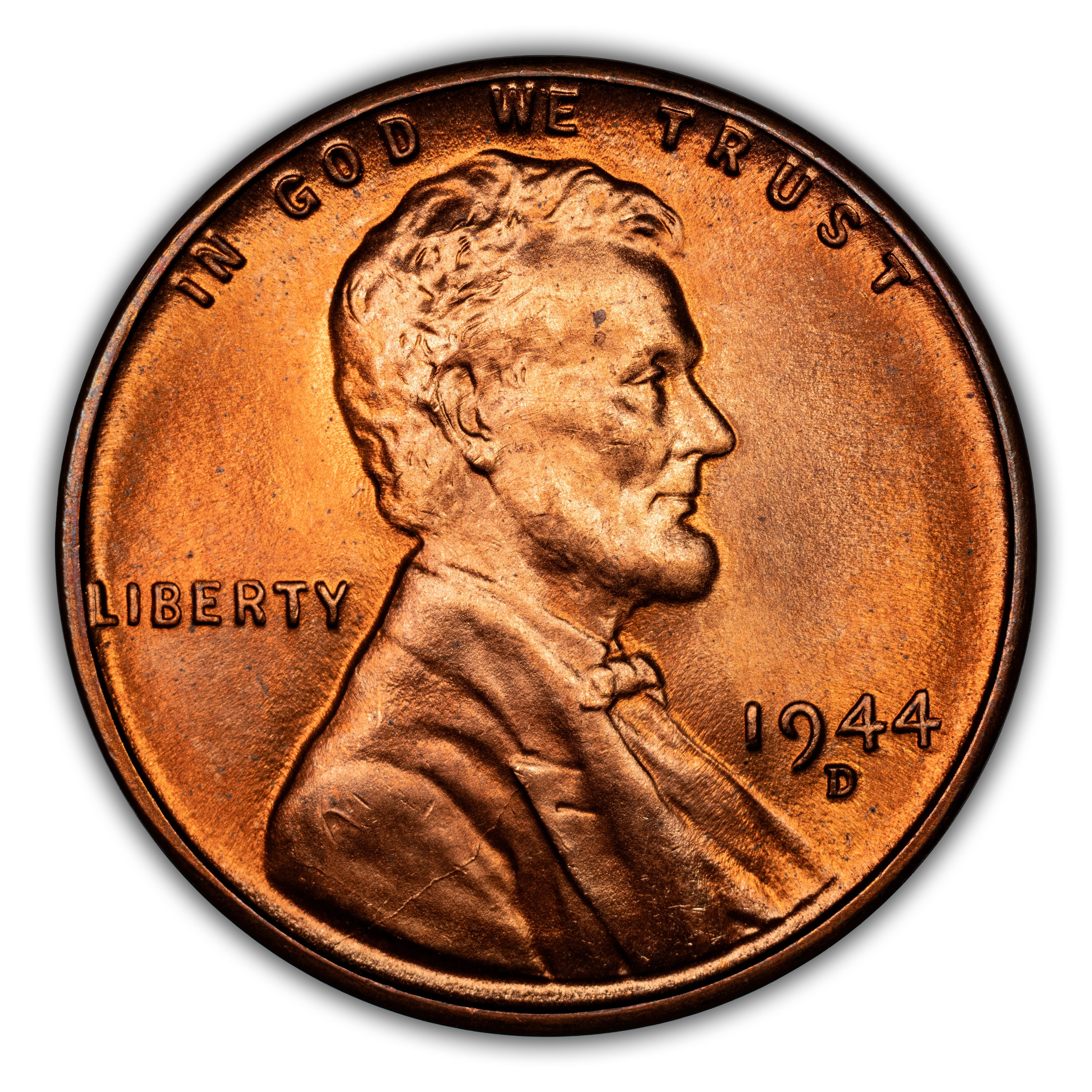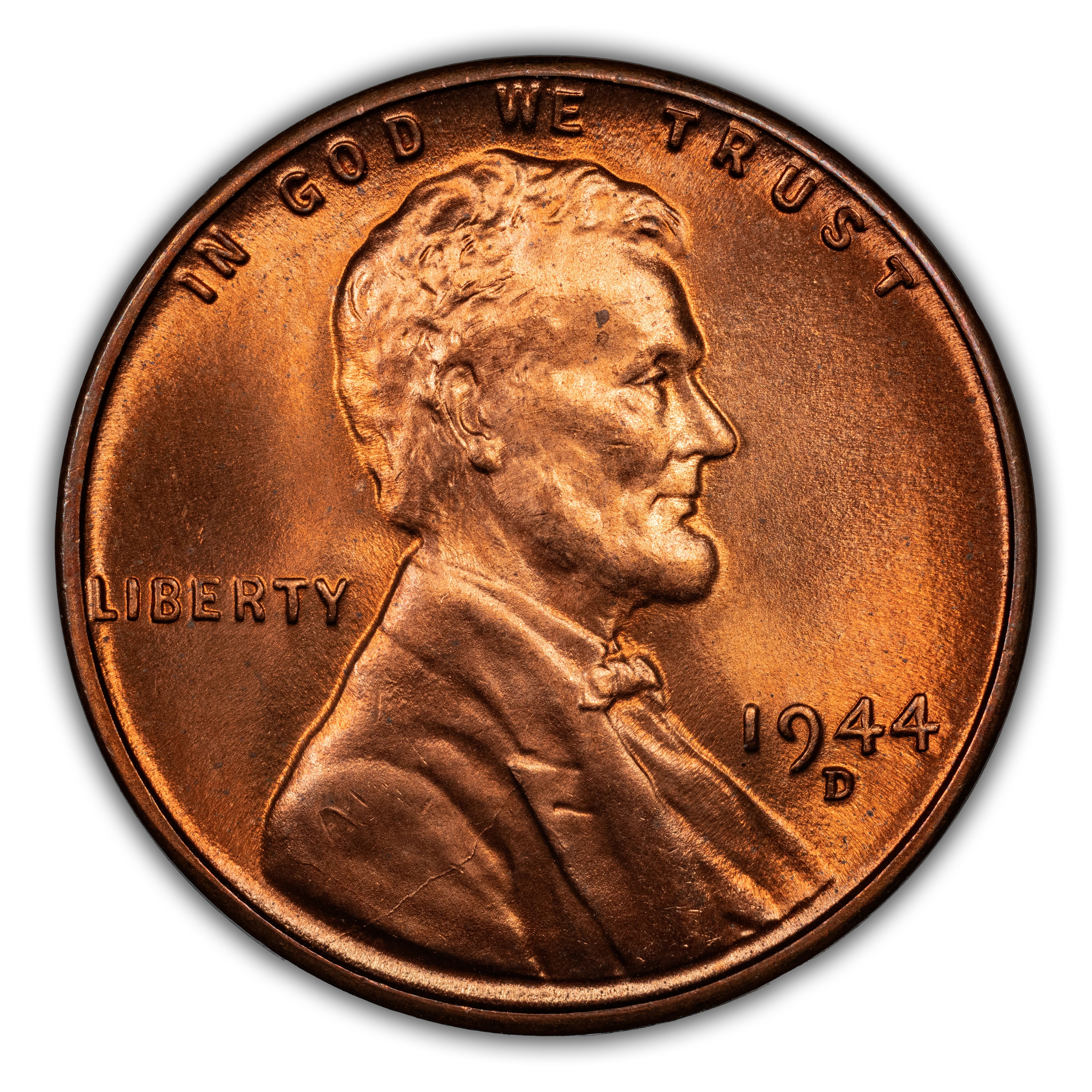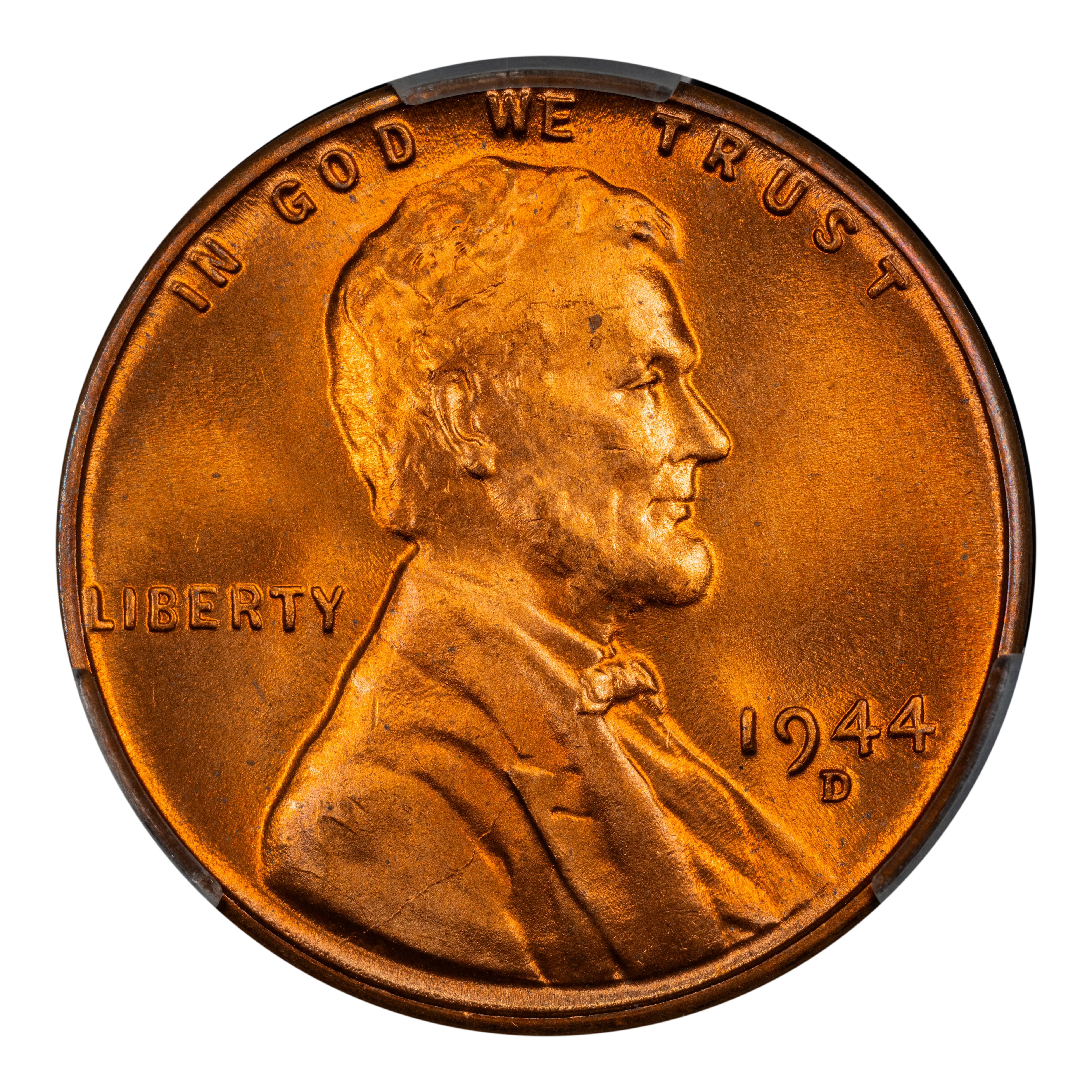 The 1944-D Lincoln cent is a highly common coin in all circulated grades and is widely available in Mint State grades up through MS66, with pieces grading MS67 scarce and better specimens rare. Strike and color on this issue is generally excellent, with many pieces exhibiting blazing luster.