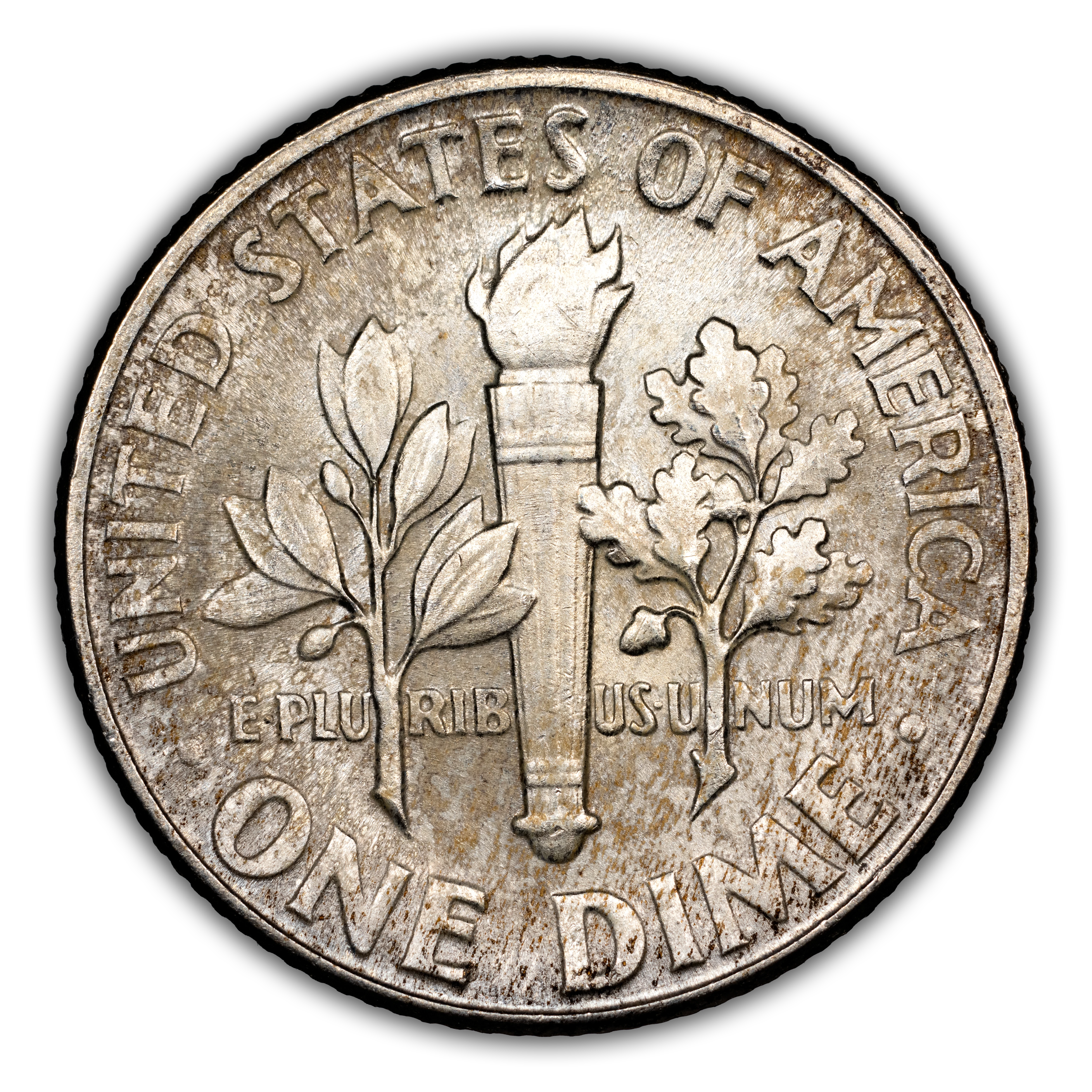 Reverse: Torch of Liberty is flanked by olive branches in the center with UNITED STATES OF AMERICA * ONE DIME around the circumference.