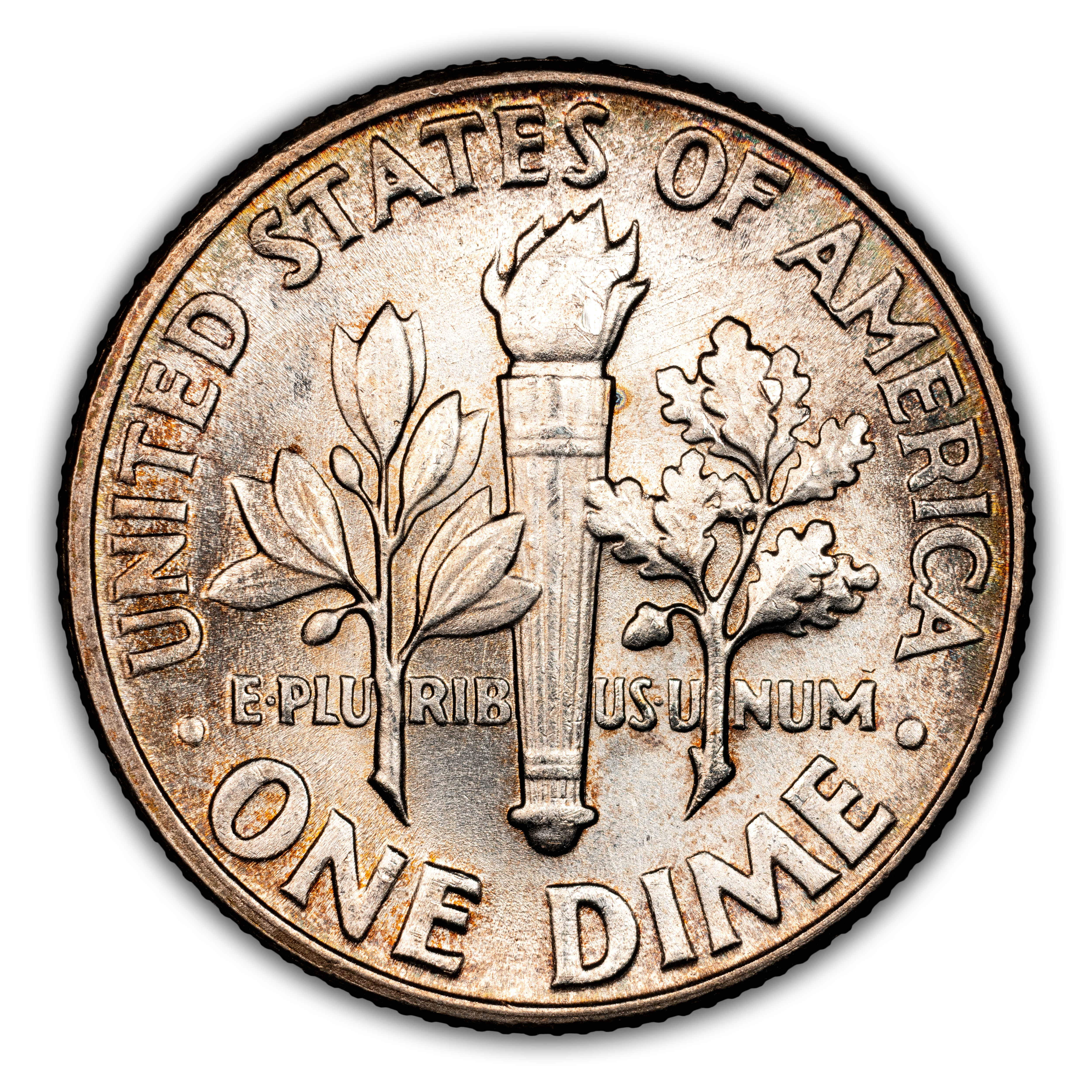 Reverse: Torch of Liberty is flanked by olive branches in the center with UNITED STATES OF AMERICA * ONE DIME around the circumference.