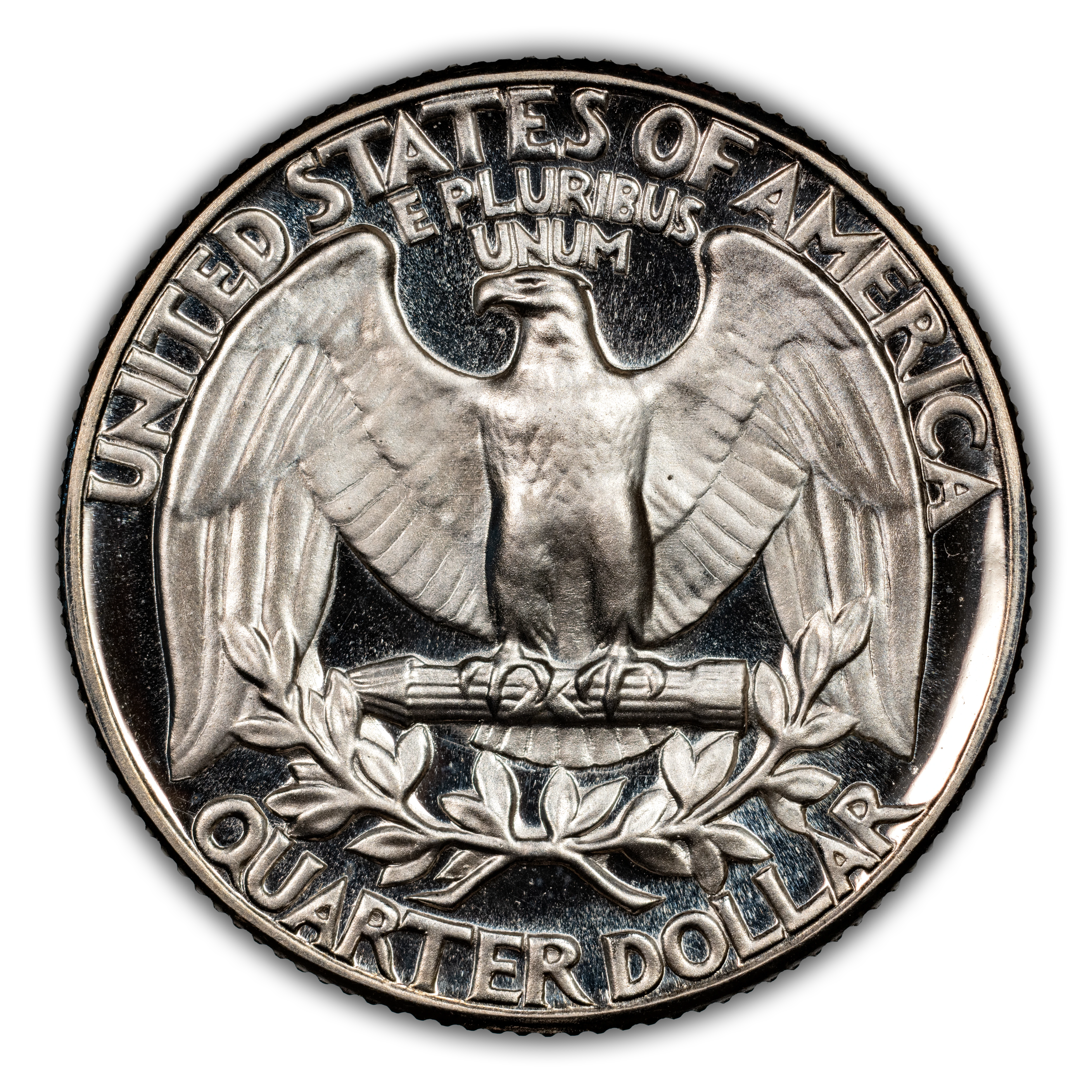 Reverse: Large eagle with wings fully extended, clutching a bundle of arrows with the words UNITED STATES OF AMERICA at the top periphery; QUARTER DOLLAR at the bottom. An olive leaf is positioned between the eagle and the denomination.