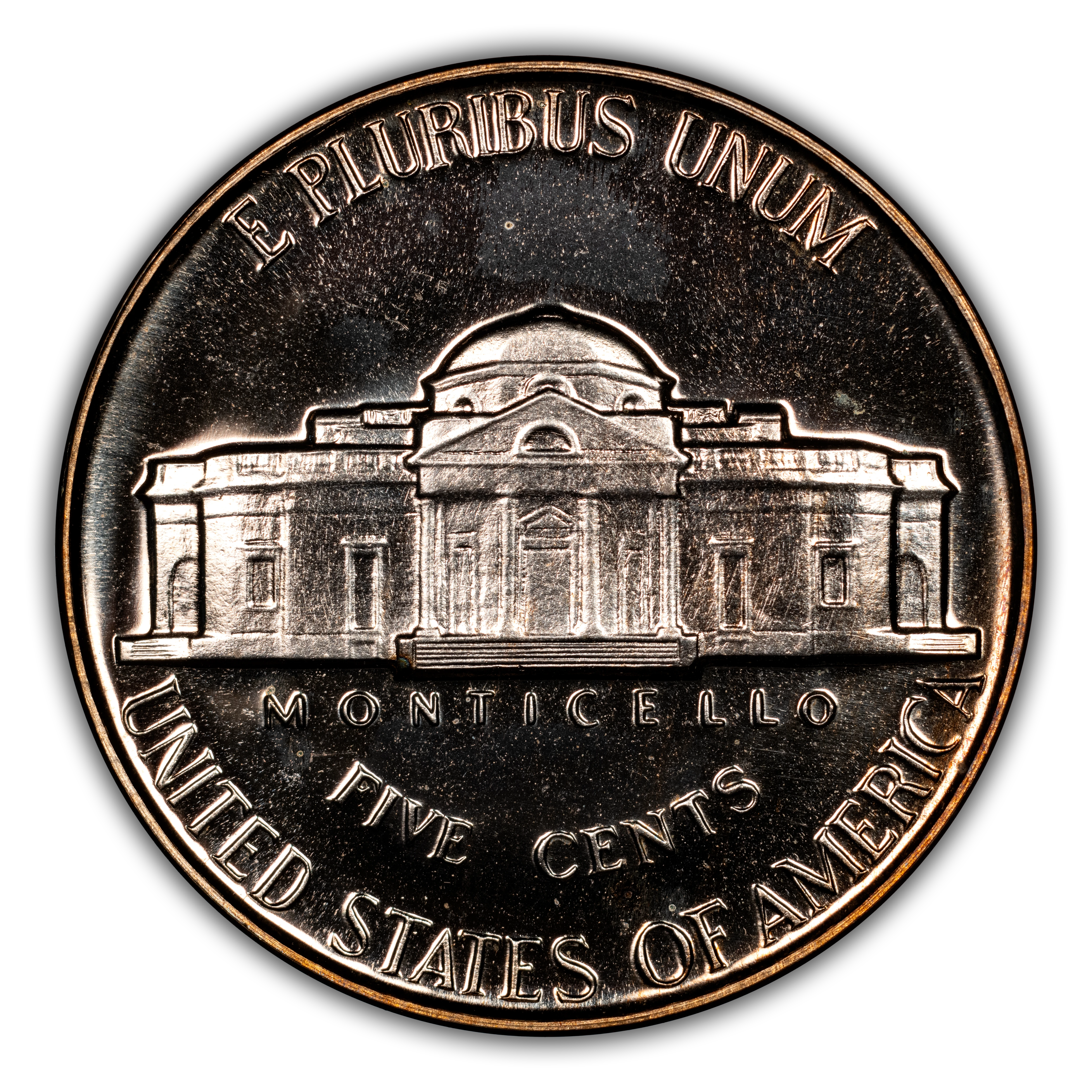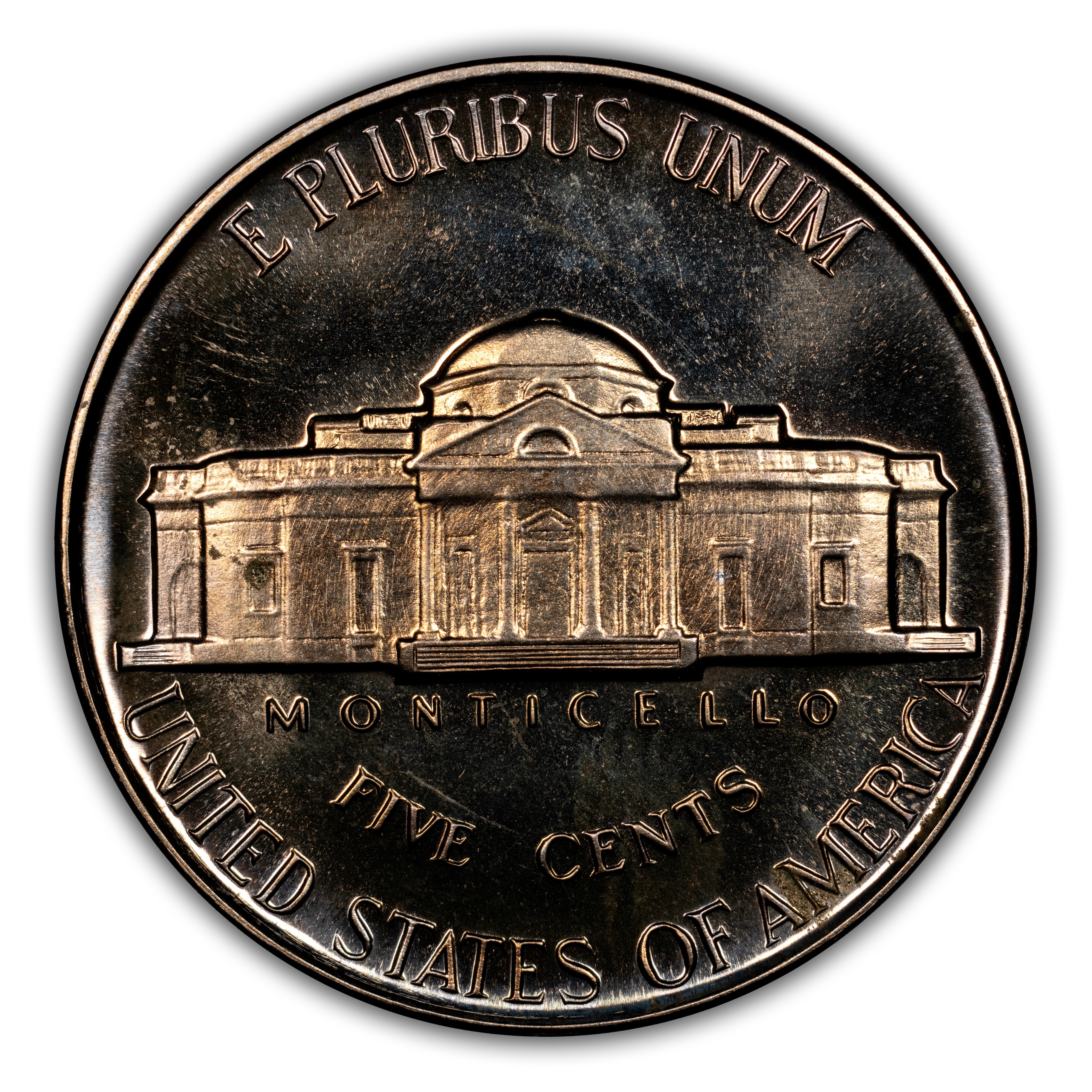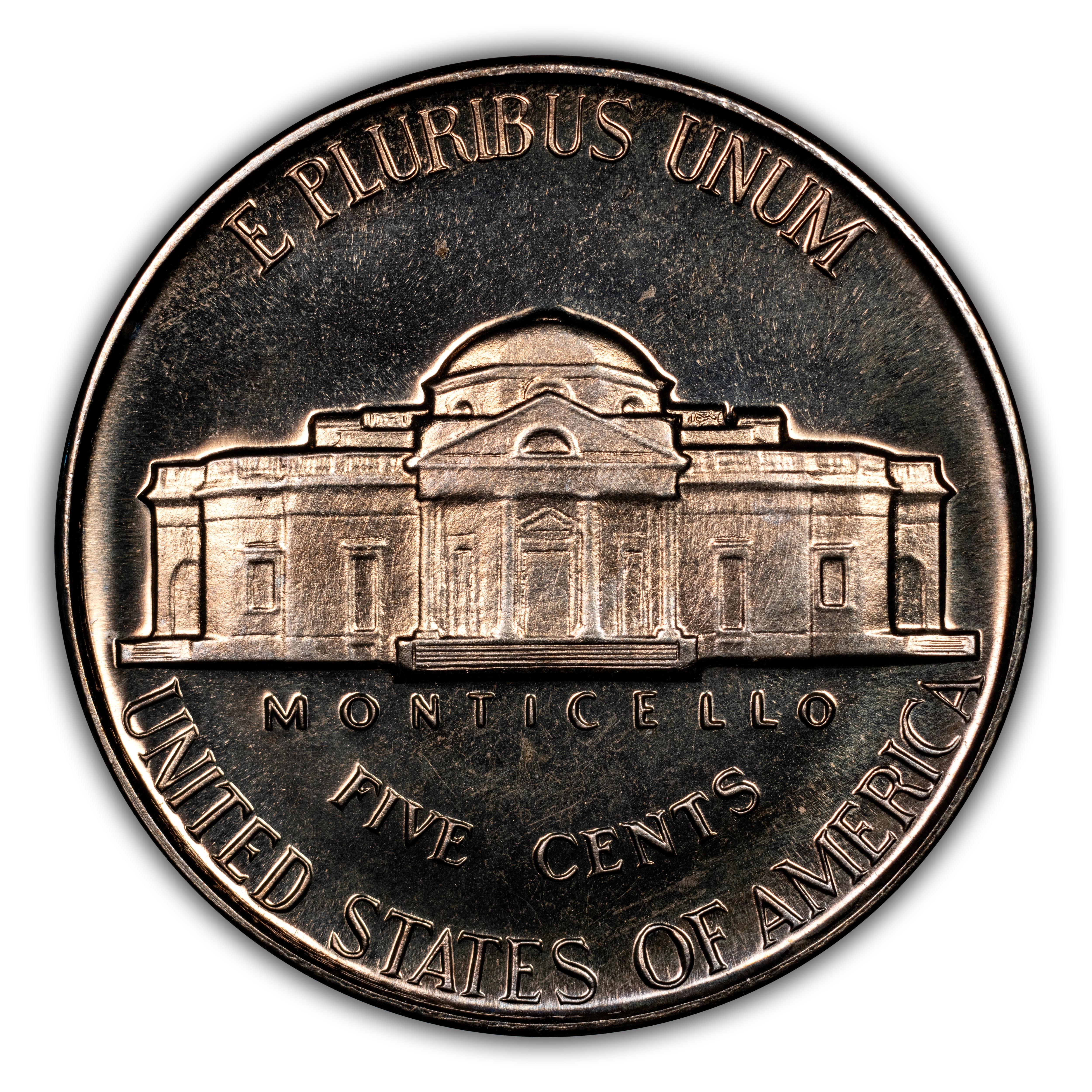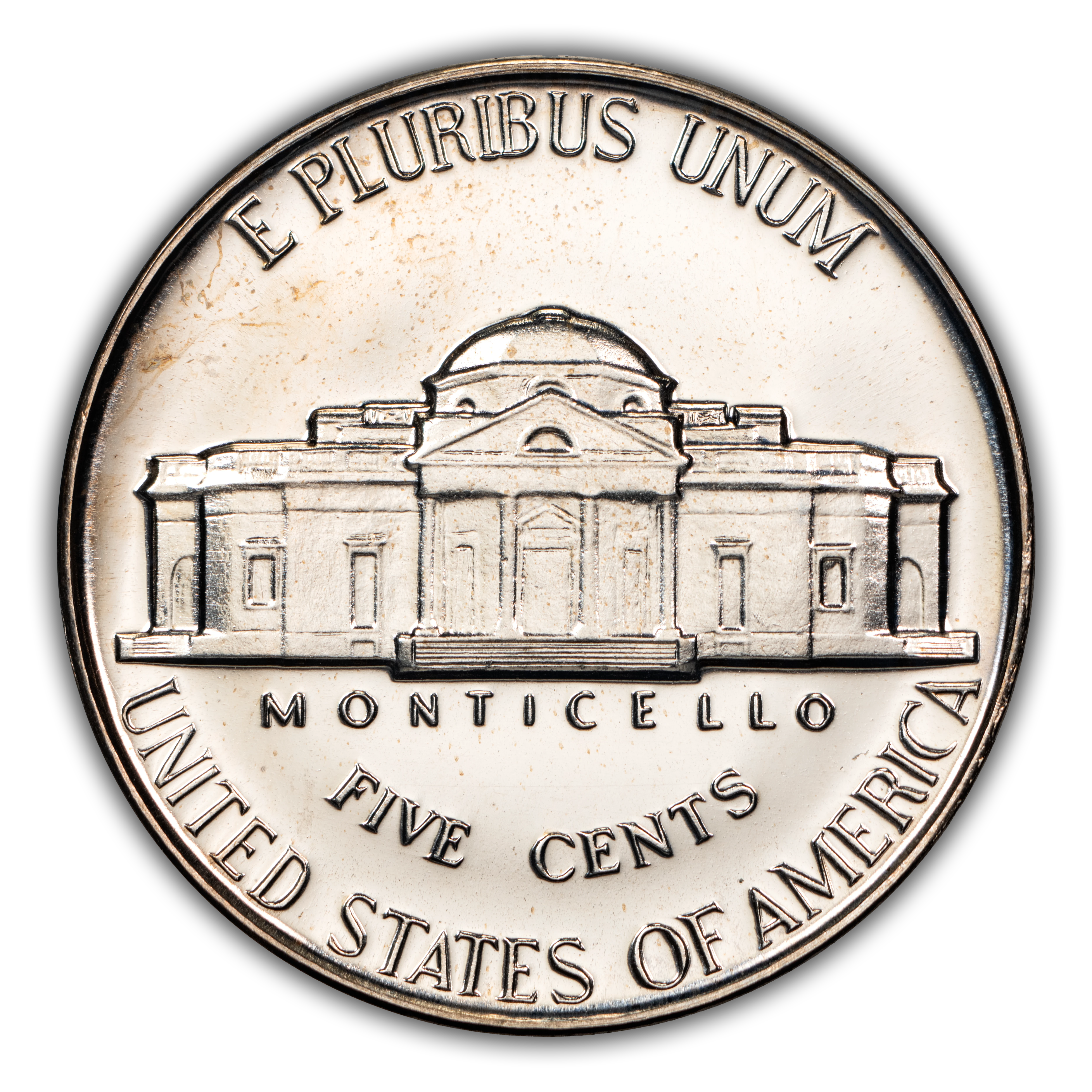 Reverse: The Jefferson home is prominently centered with the name MONTICELLO captioned below. The denomination FIVE CENTS is spelled out in half circle underneath and the words E PLURIBUS UNUM and UNITED STATES OF AMERICA appear at the top and bottom periphery.